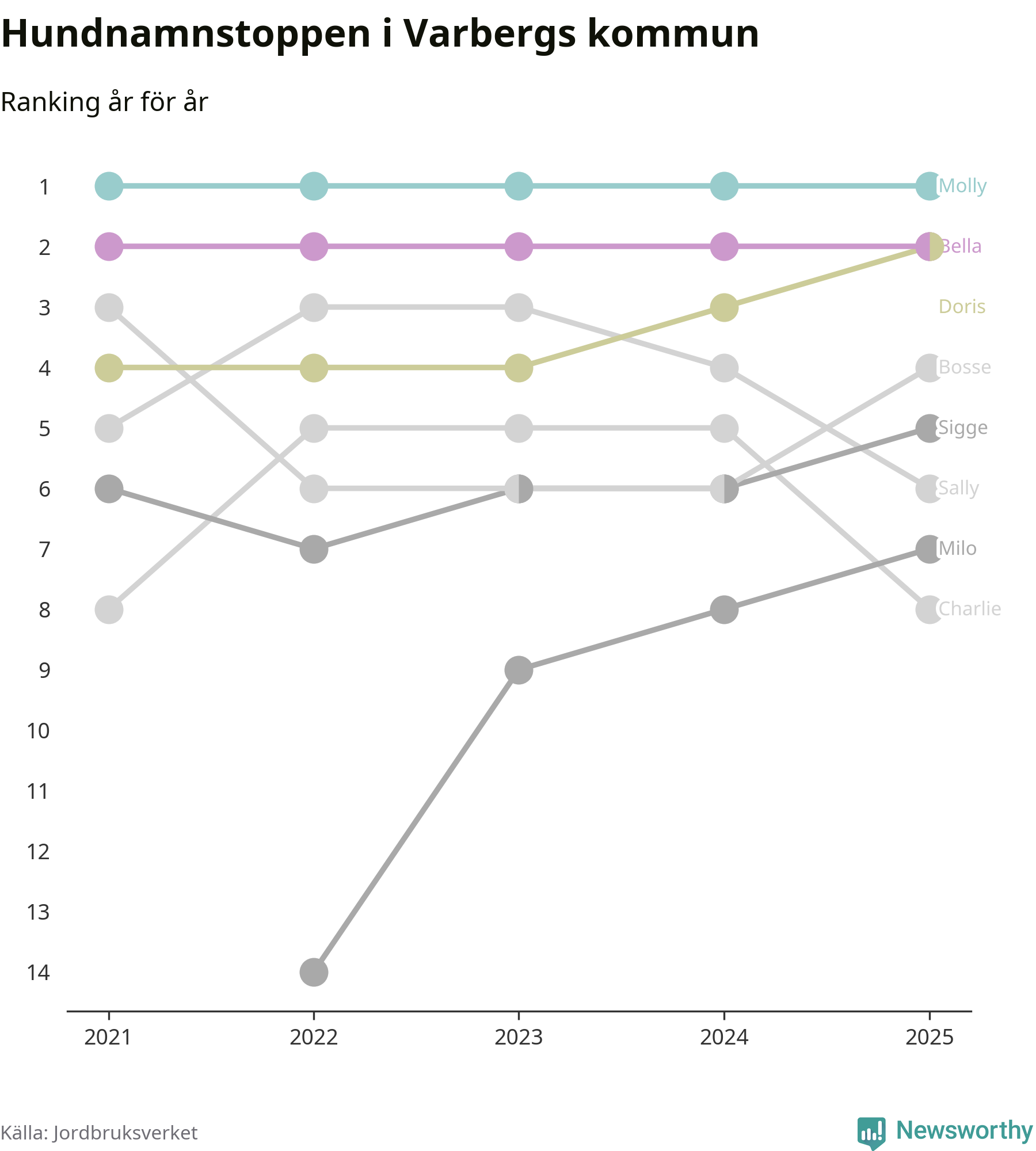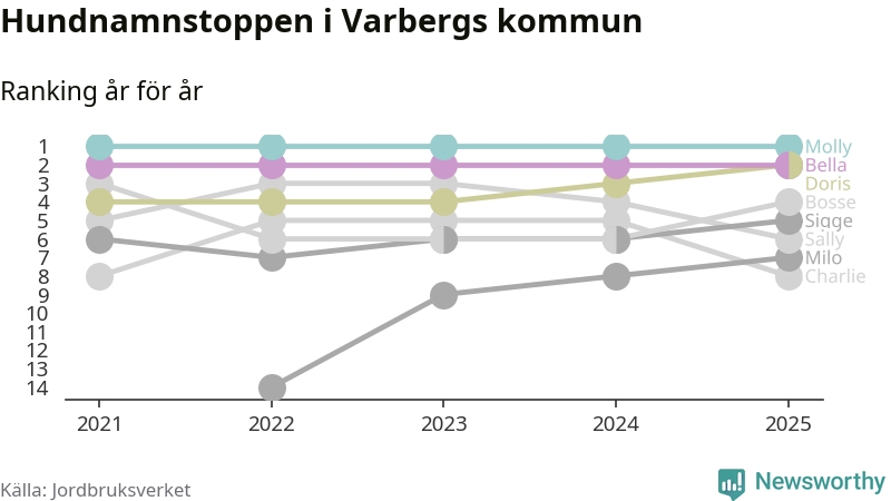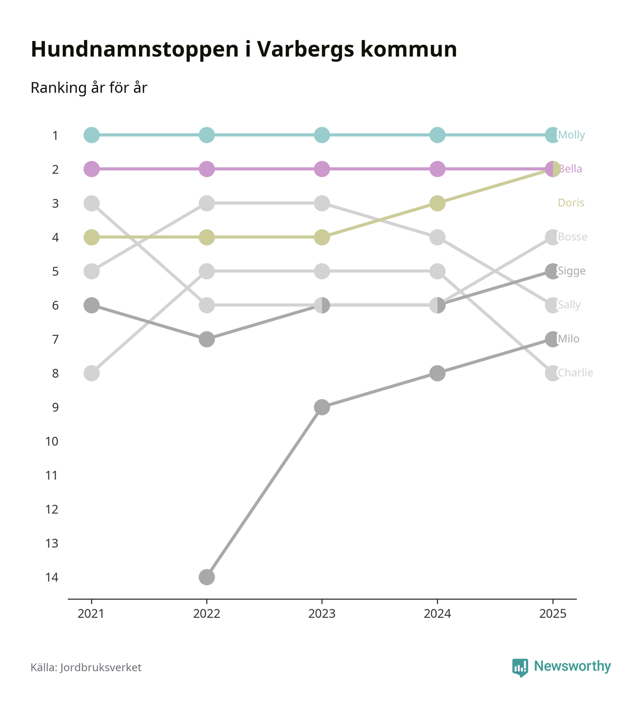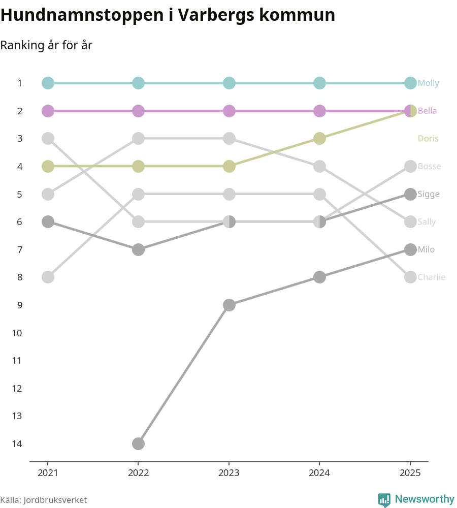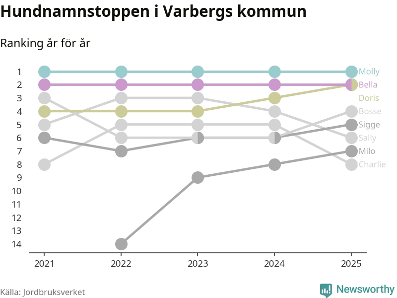 I hela landet är Molly det ohotat populäraste tilltalsnamnet för hundar sedan flera år, följt av Bella och Charlie. Något av de tre namnen toppar listan i 243 av 290 kommuner, och de har varit de vanligaste namnen sedan åtminstone 2018. Men det fjärde populäraste namnet, Doris, knappade in på ledartrion och kommer snart kunna utmana Charlie om tredjeplatsen, om trenden håller i sig.