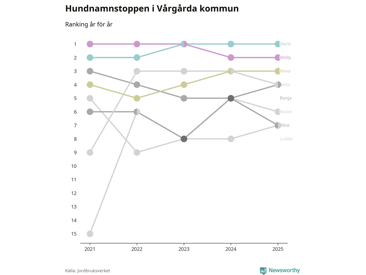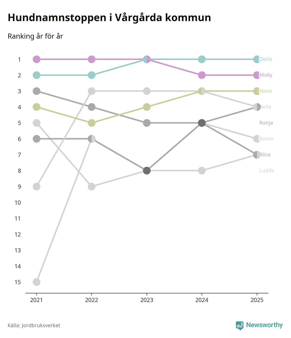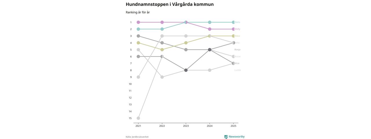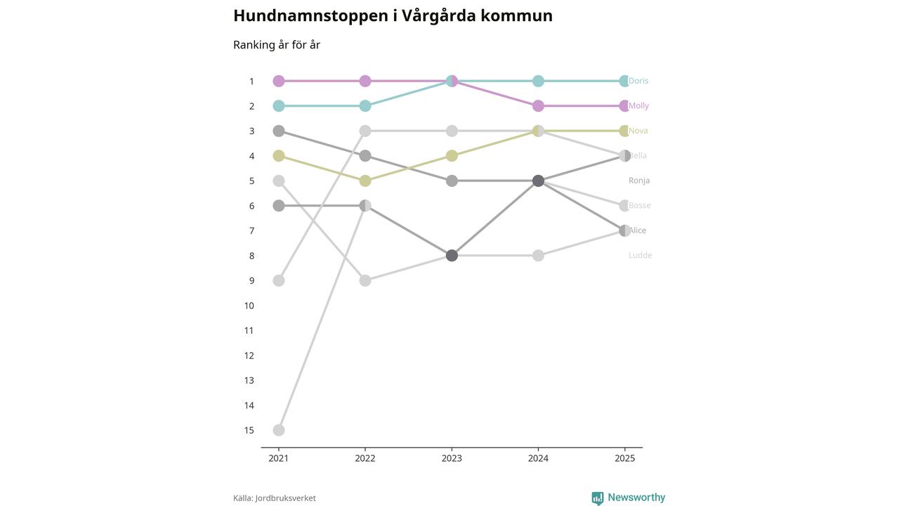 Molly är fortsatt ohotad etta bland hundnamnen i Sverige, följt av Bella och Charlie. Så har det sett ut flera år i rad, men bland Vårgårdahundarna är Doris populärast. Det gör Vårgårda till en av få kommuner i landet där toppnamnet inte hör till de tre vanligaste (Molly, Bella eller Charlie).
