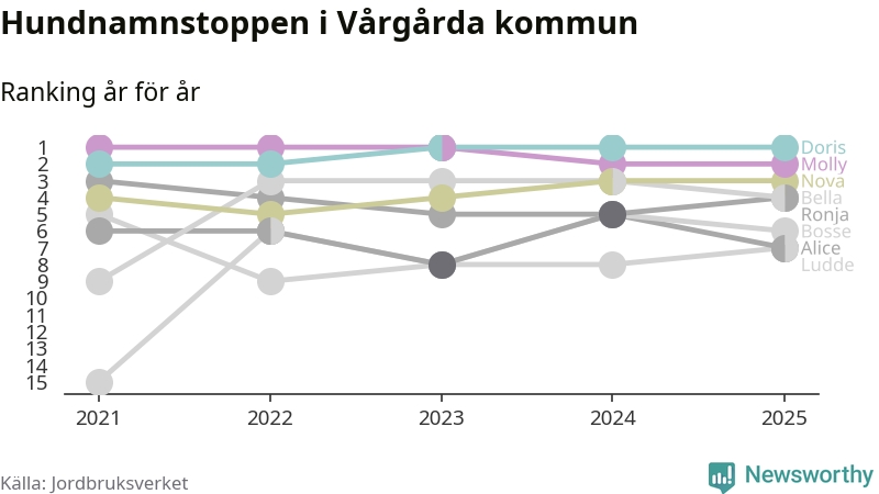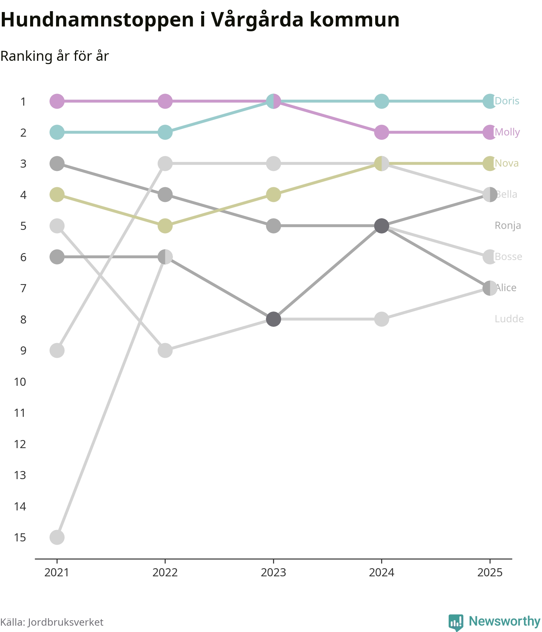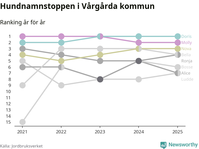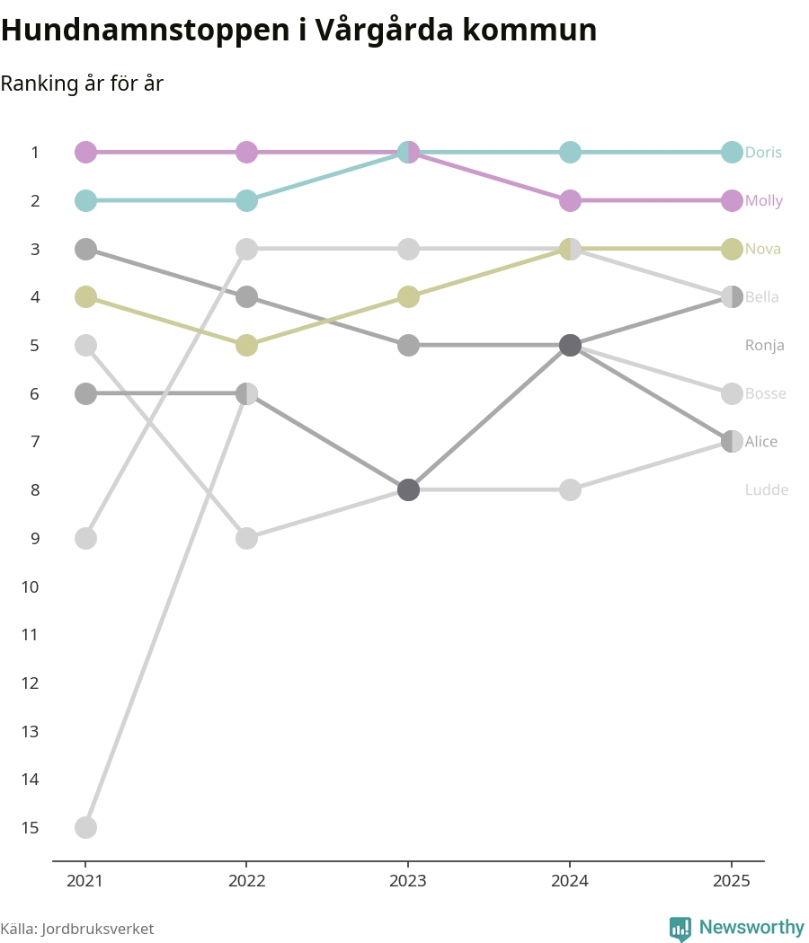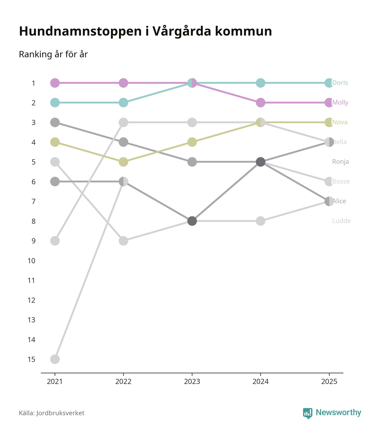 Molly är fortsatt ohotad etta bland hundnamnen i Sverige, följt av Bella och Charlie. Så har det sett ut flera år i rad, men bland Vårgårdahundarna är Doris populärast. Det gör Vårgårda till en av få kommuner i landet där toppnamnet inte hör till de tre vanligaste (Molly, Bella eller Charlie).