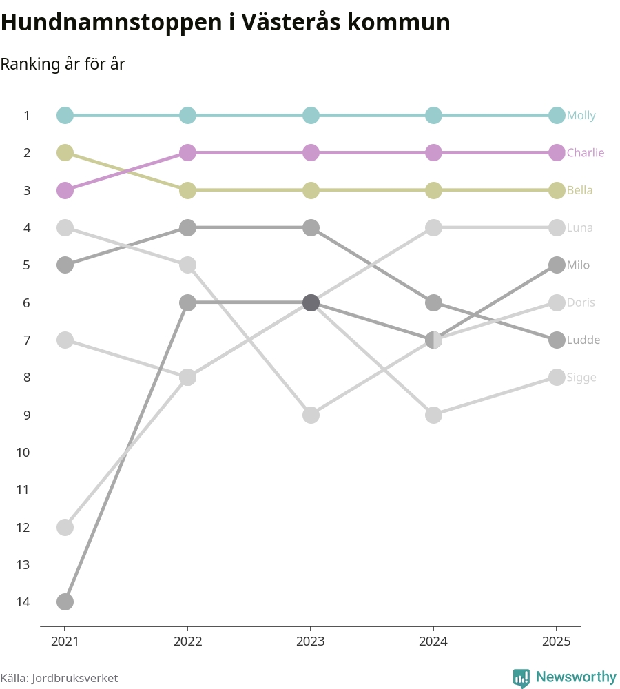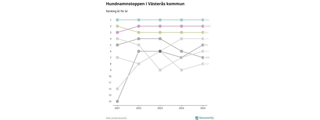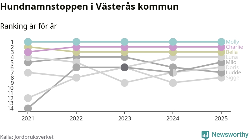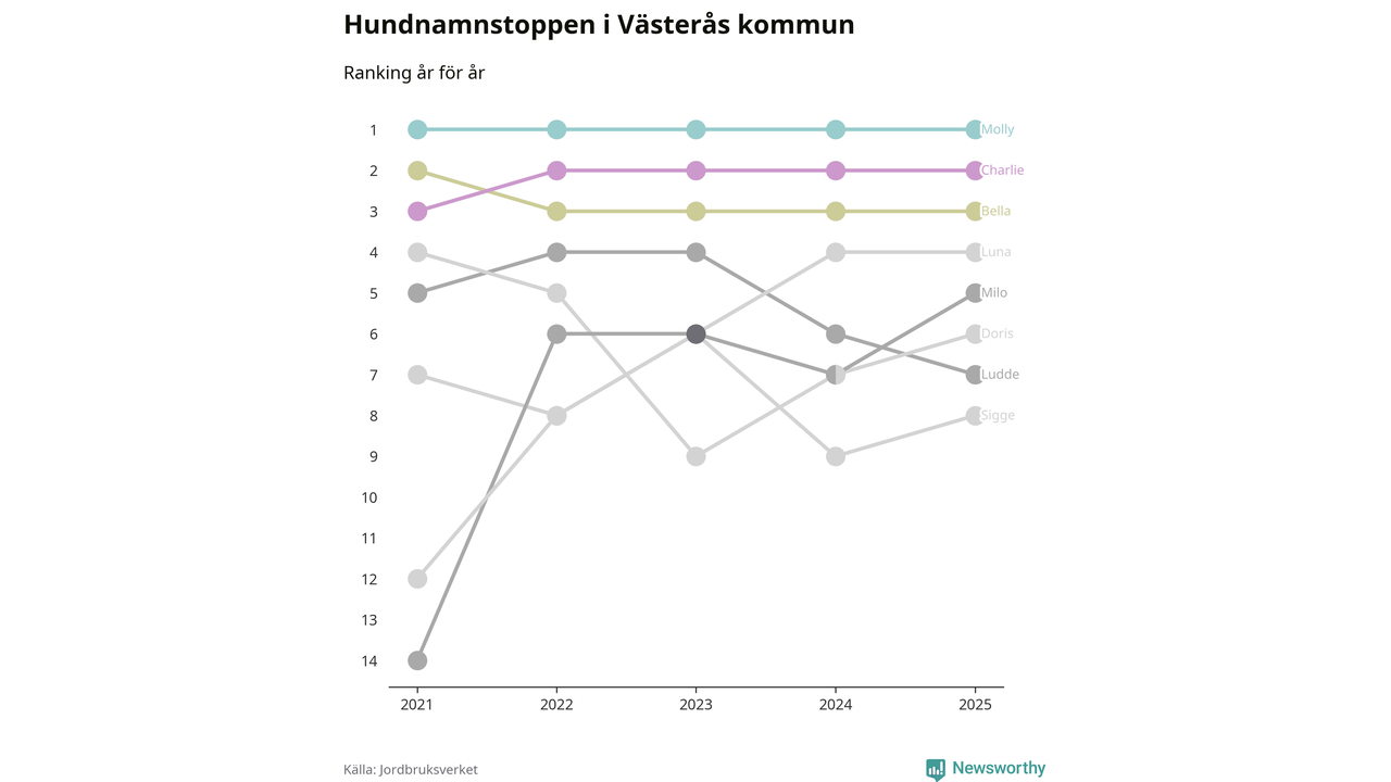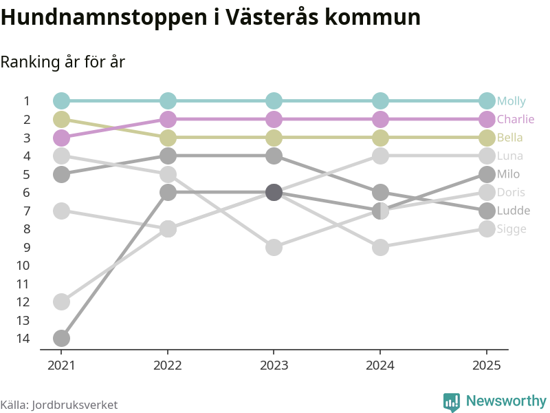 Molly är fortsatt ohotad etta bland hundnamnen i Sverige, följt av Bella och Charlie. Så har det sett ut flera år i rad, och även bland Västeråshundarna ligger alltså Molly i topp.