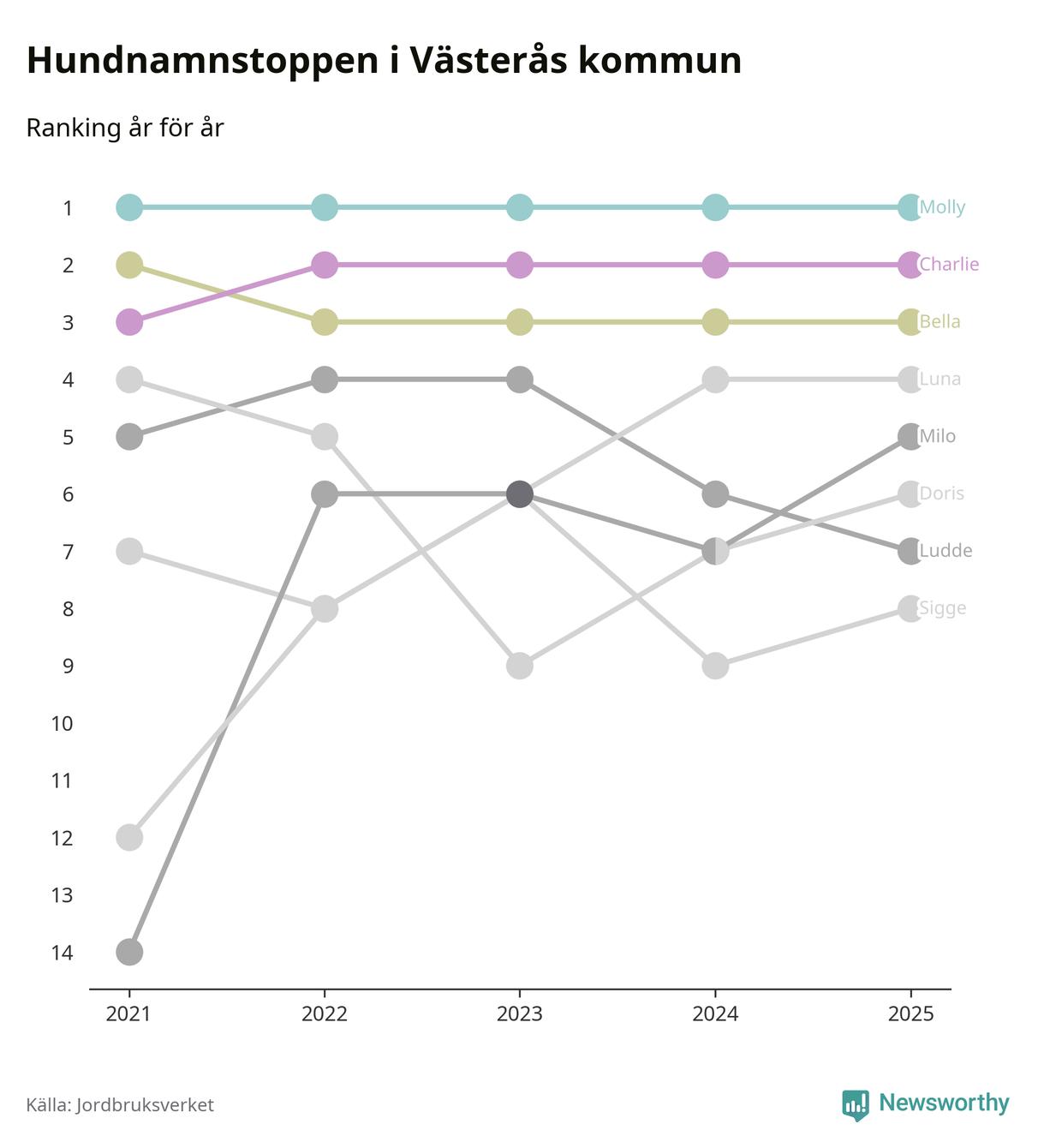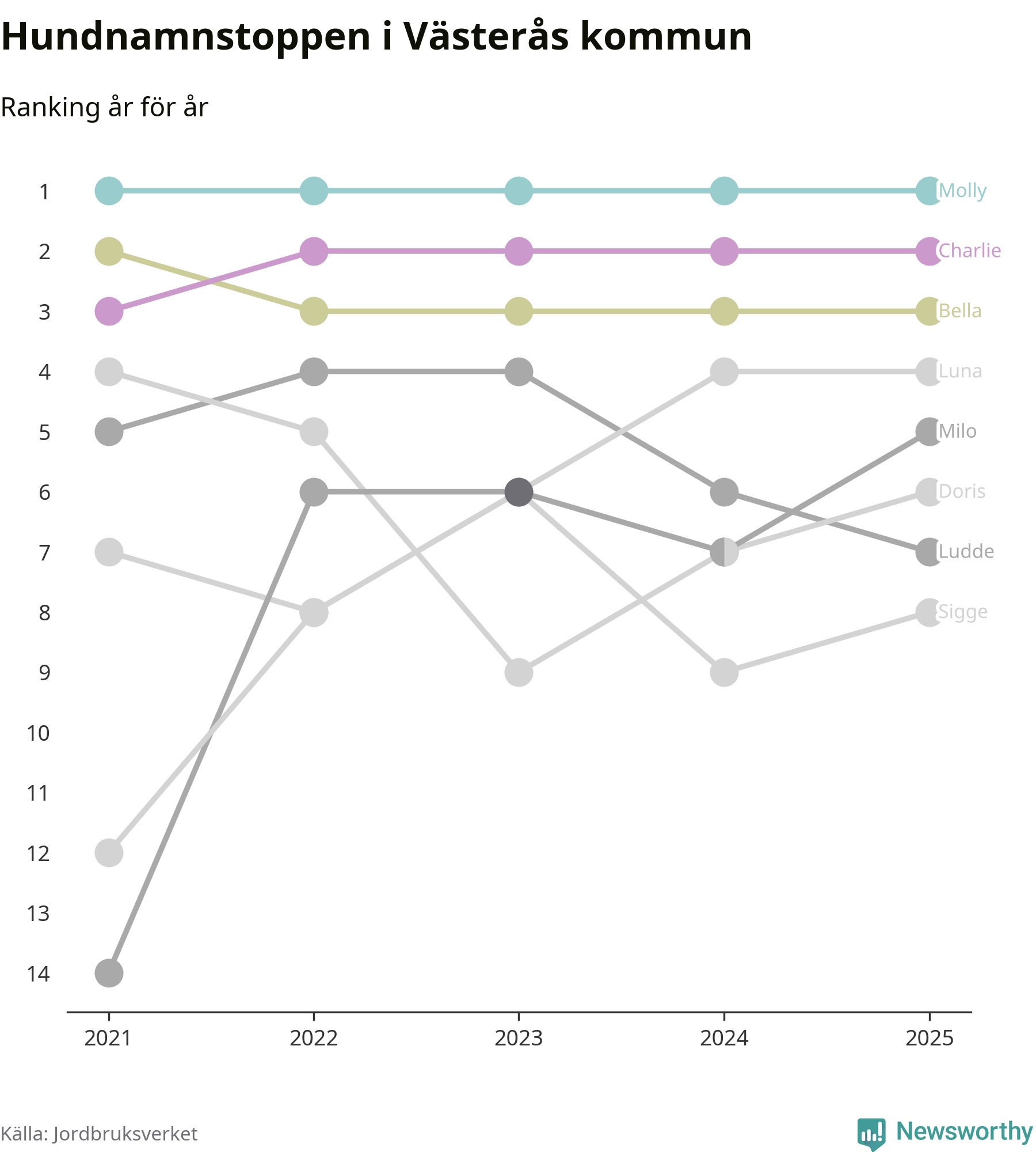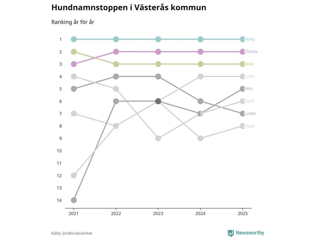 I hela landet är Molly det ohotat populäraste tilltalsnamnet för hundar sedan flera år, följt av Bella och Charlie. Något av de tre namnen toppar listan i 243 av 290 kommuner, och de har varit de vanligaste namnen sedan åtminstone 2018. Men det fjärde populäraste namnet, Doris, knappade in på ledartrion och kommer snart kunna utmana Charlie om tredjeplatsen, om trenden håller i sig.
