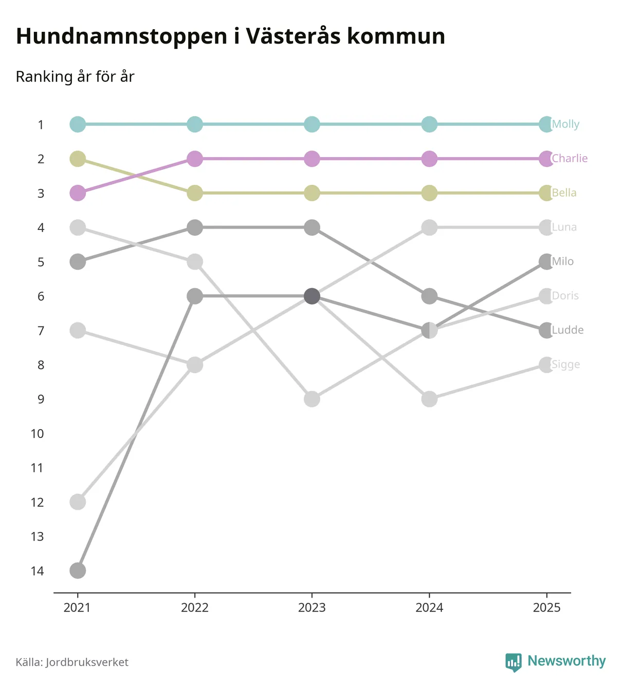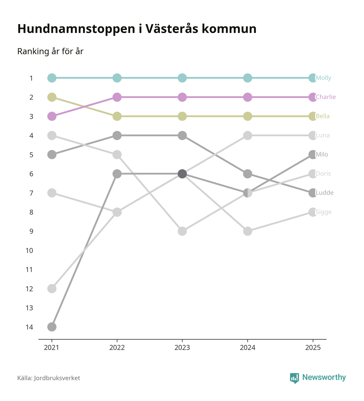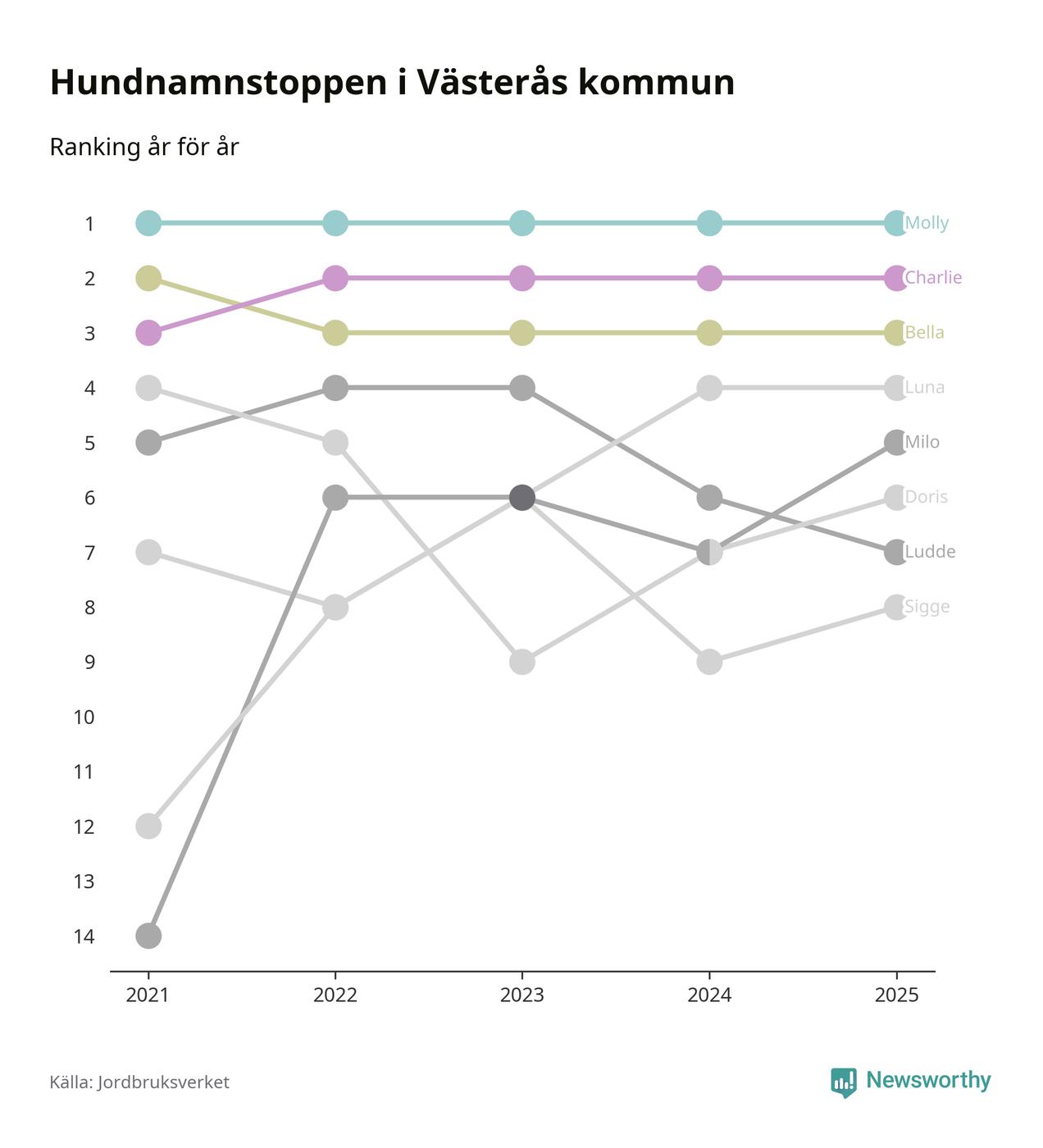 I hela landet är Molly det ohotat populäraste tilltalsnamnet för hundar sedan flera år, följt av Bella och Charlie. Något av de tre namnen toppar listan i 243 av 290 kommuner, och de har varit de vanligaste namnen sedan åtminstone 2018. Men det fjärde populäraste namnet, Doris, knappade in på ledartrion och kommer snart kunna utmana Charlie om tredjeplatsen, om trenden håller i sig.