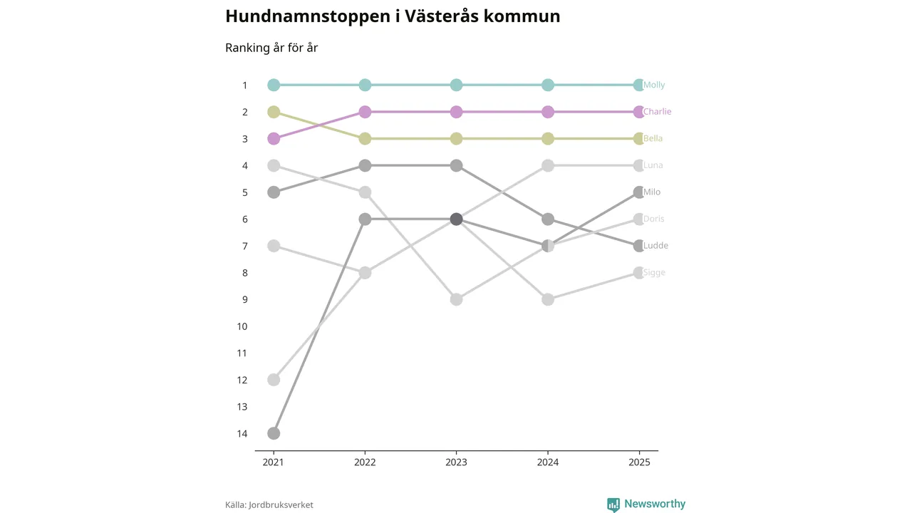 Molly toppar hundnamnsligan i Västerås kommun, precis som i landet som helhet. Det visar färsk statistik från Jordbruksverket. Här finns hela topplistan för kommunen.