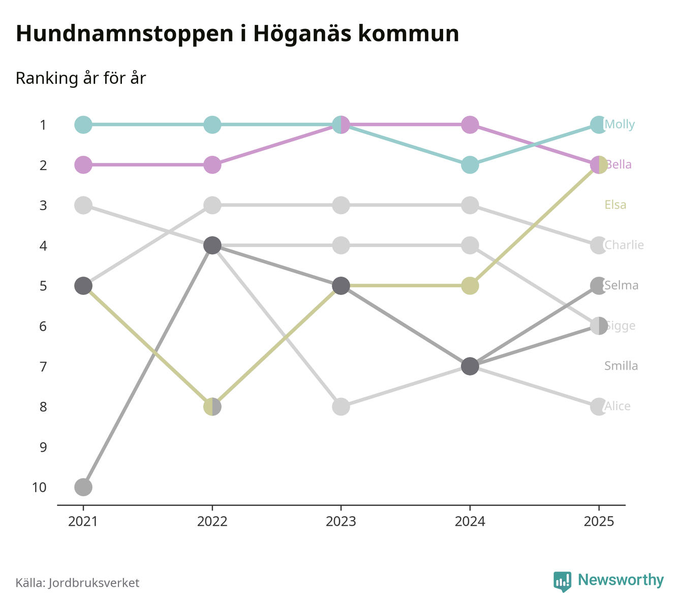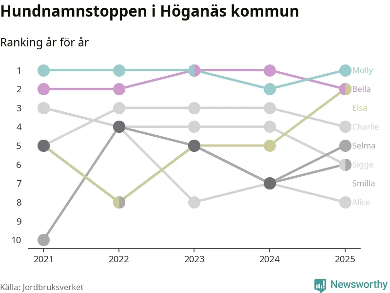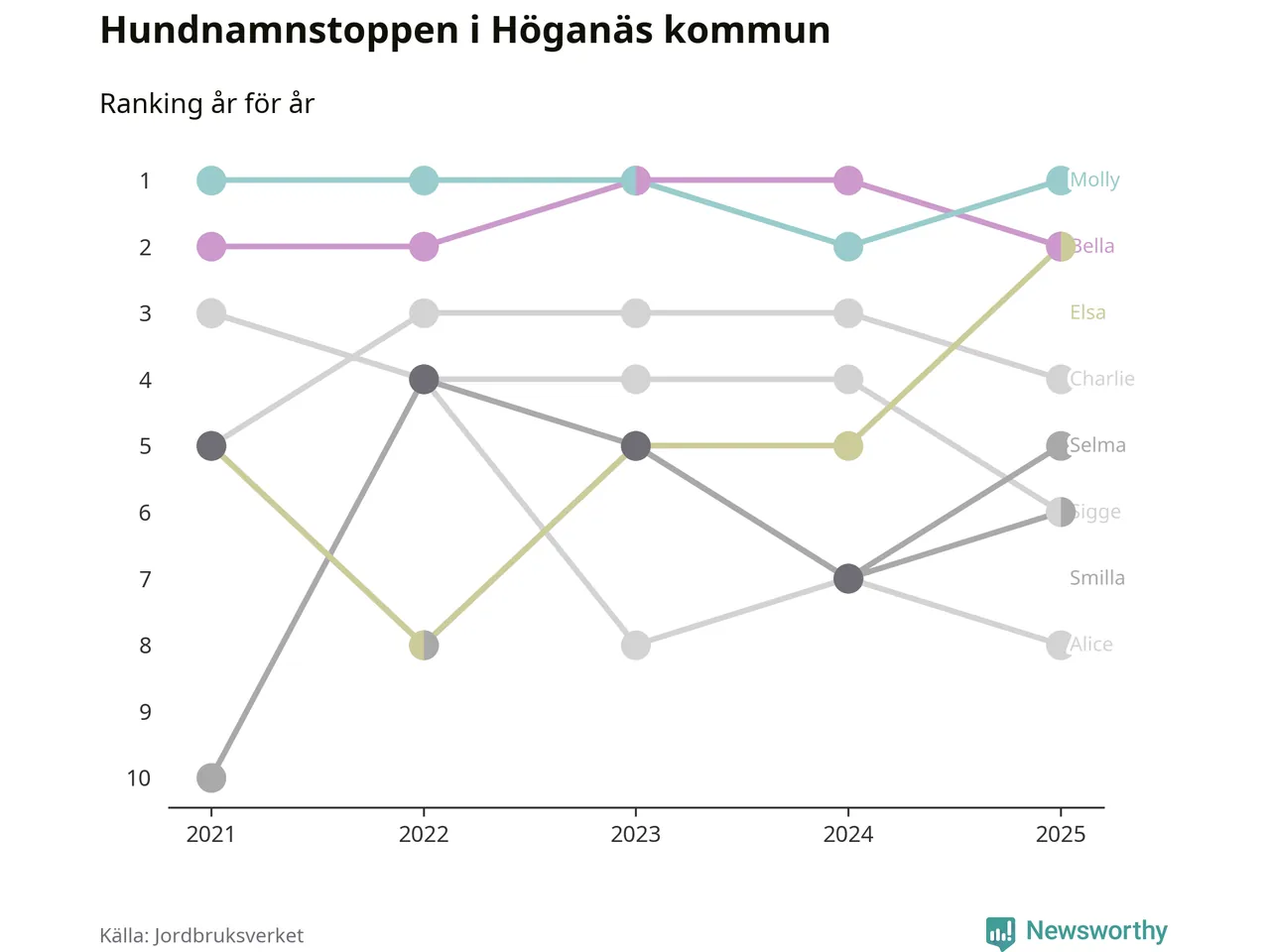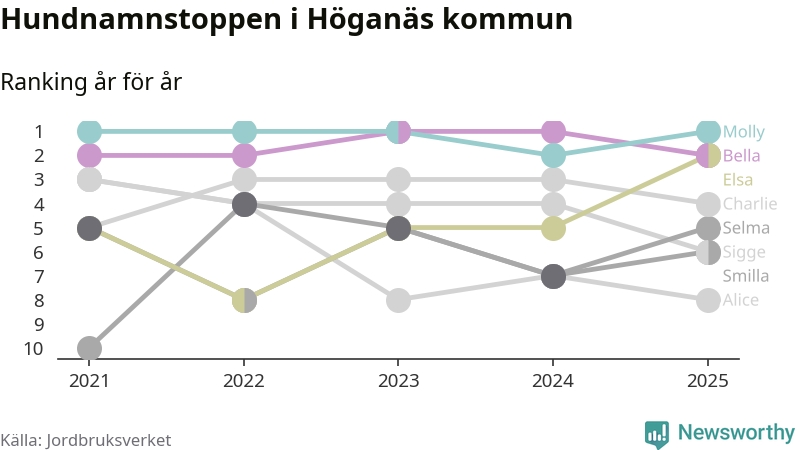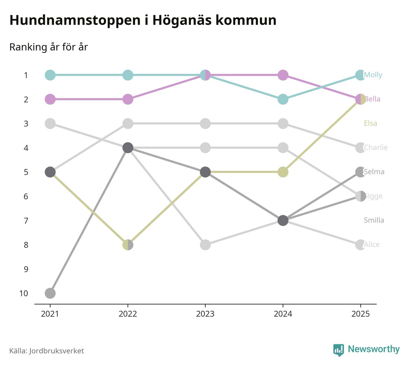 Molly är fortsatt ohotad etta bland hundnamnen i Sverige, följt av Bella och Charlie. Så har det sett ut flera år i rad, och även bland Höganäshundarna ligger Molly i topp.