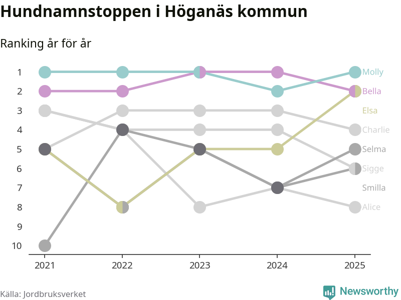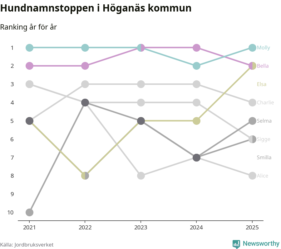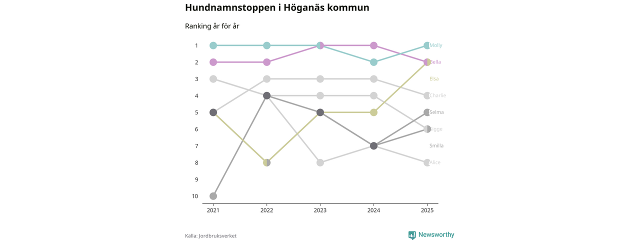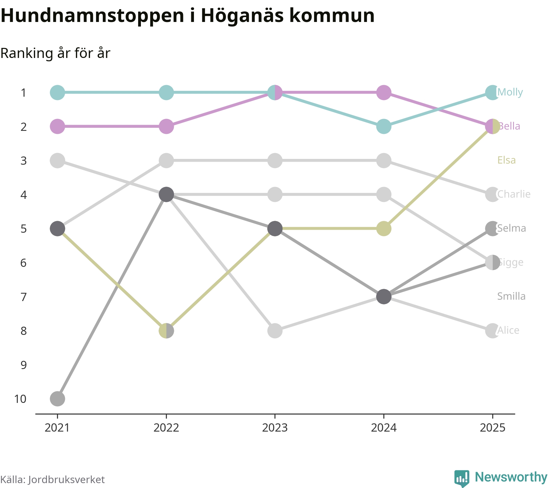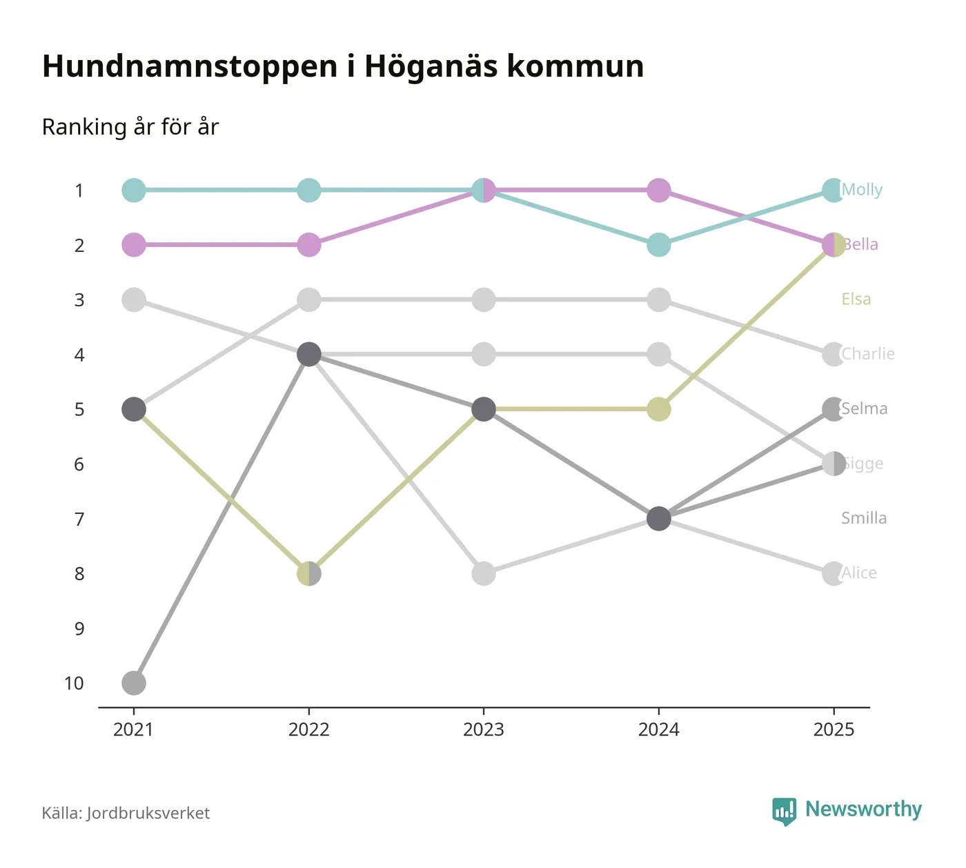 Molly är fortsatt ohotad etta bland hundnamnen i Sverige, följt av Bella och Charlie. Så har det sett ut flera år i rad, och även bland Höganäshundarna ligger Molly i topp.