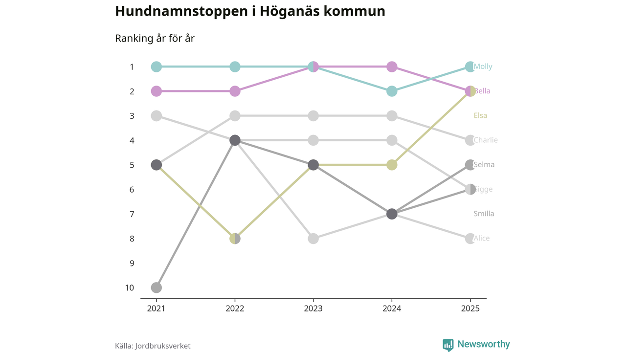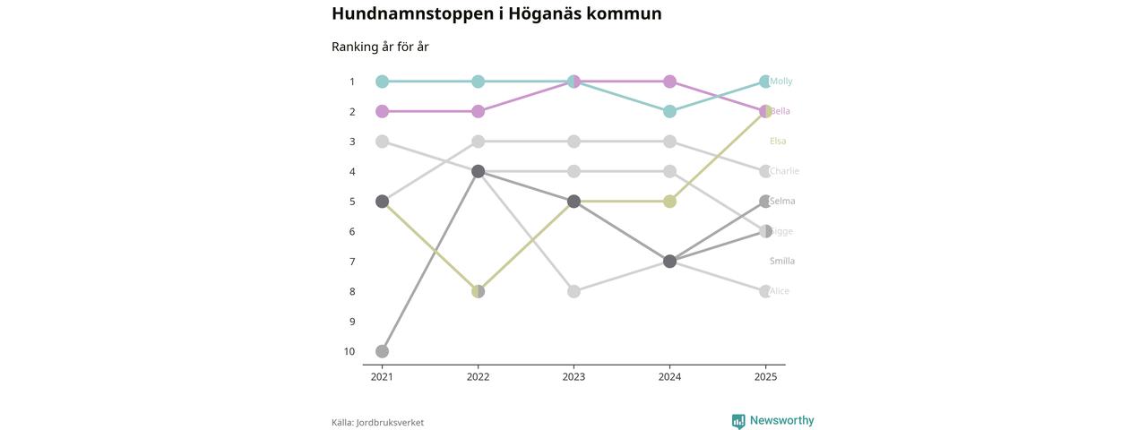 Molly är ny etta på topplistan över Höganäs hundnamn, visar ny statistik från Jordbruksverkets hundregister. Molly är sedan flera år det populäraste hundnamnet i riket som helhet.