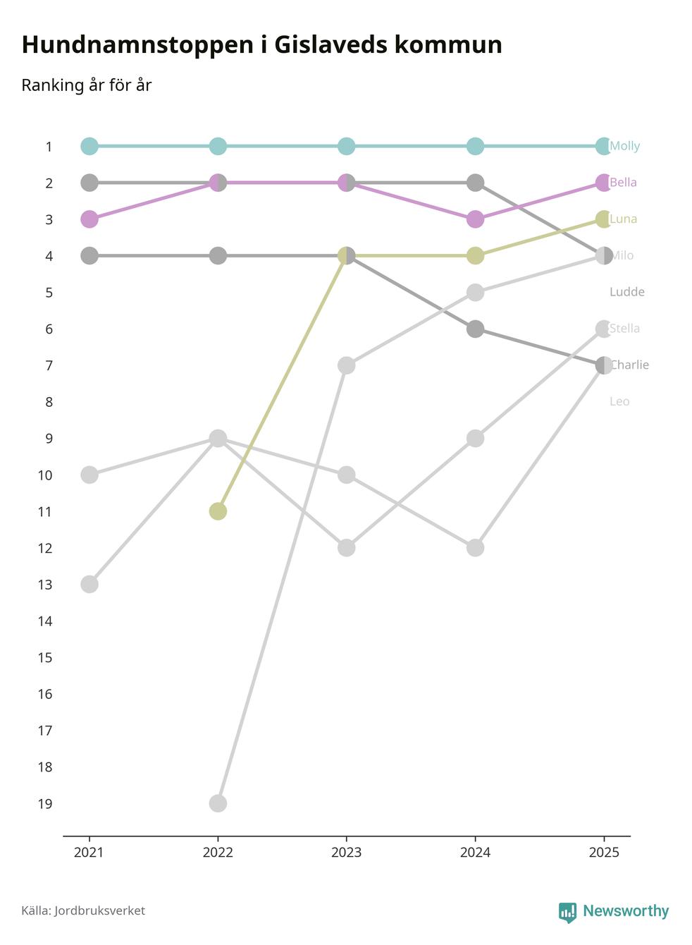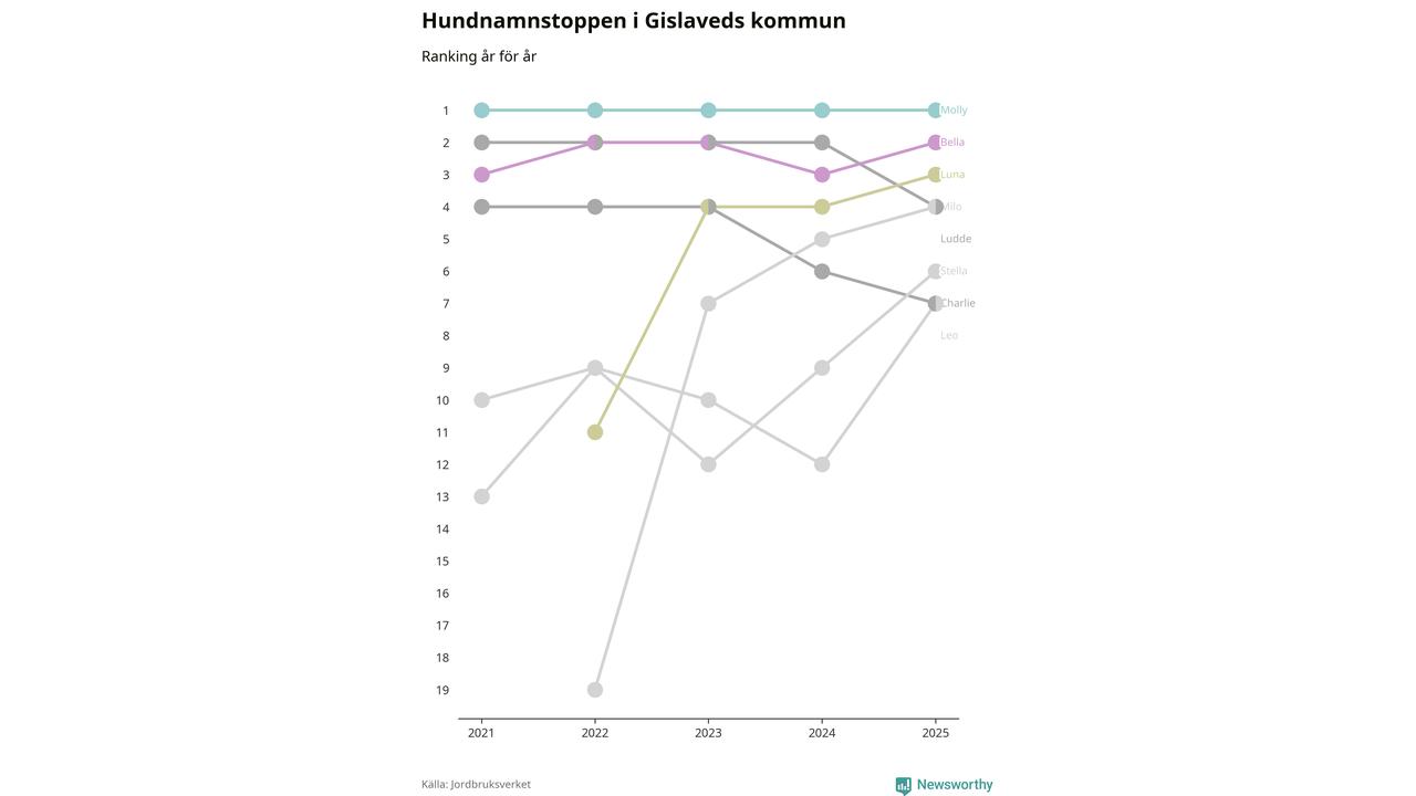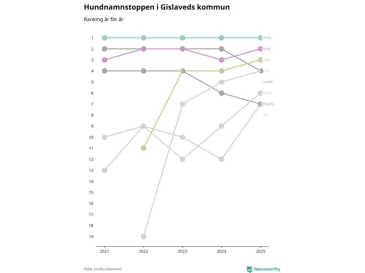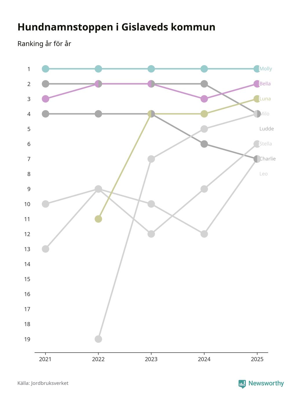 Molly är fortsatt ohotad etta bland hundnamnen i Sverige, följt av Bella och Charlie. Så har det sett ut flera år i rad, och även bland Gislavedshundarna ligger Molly i topp.
