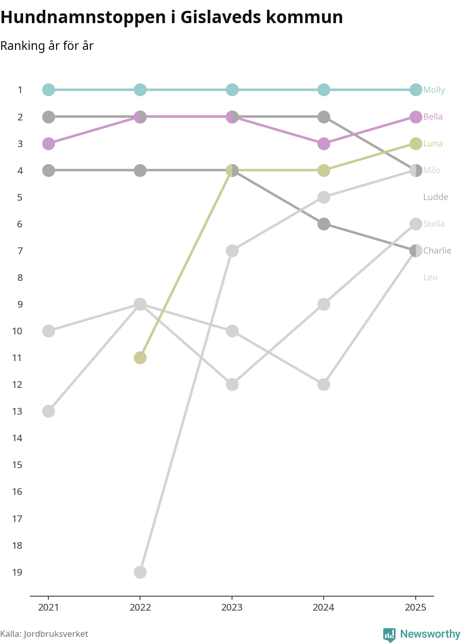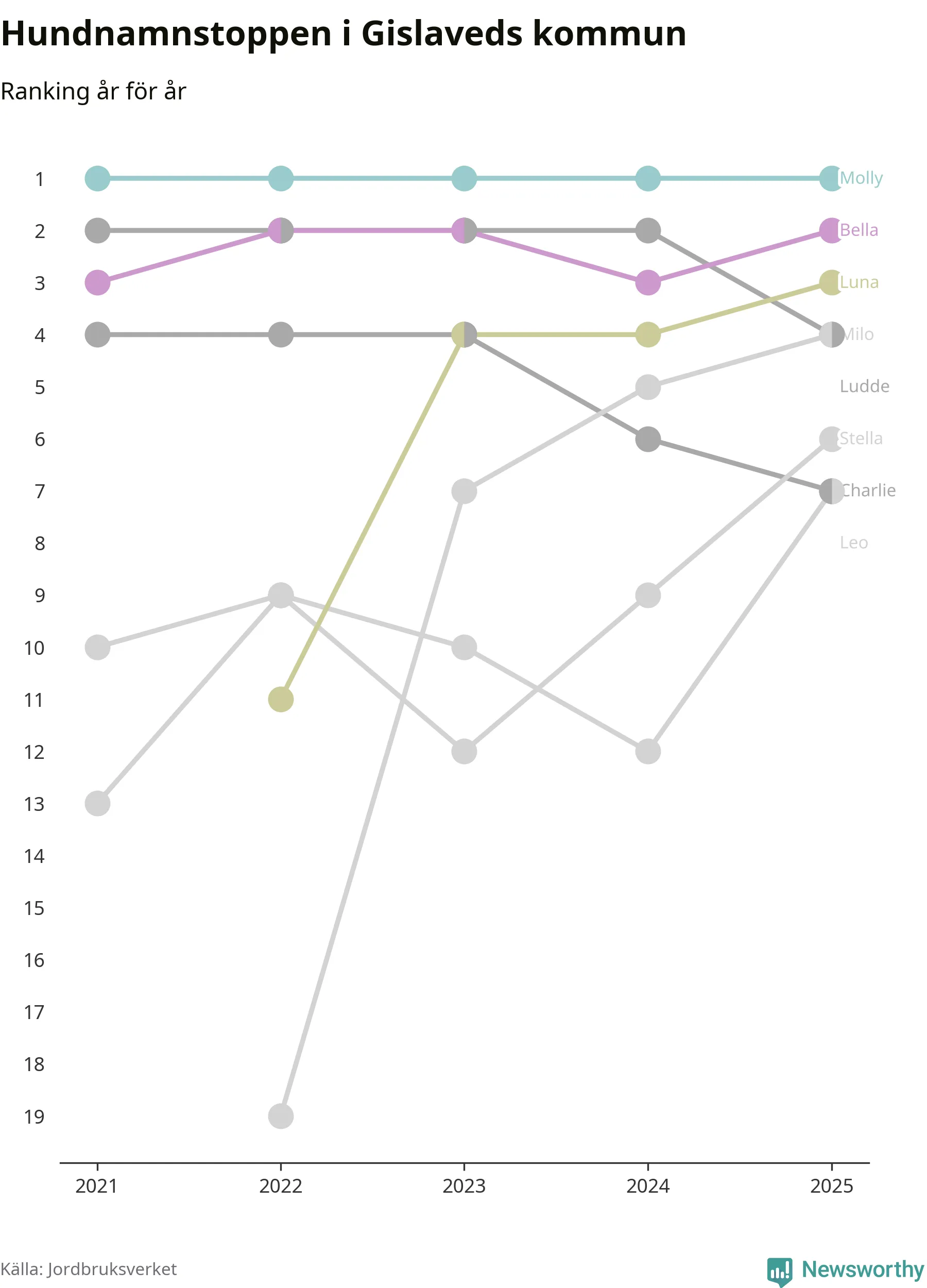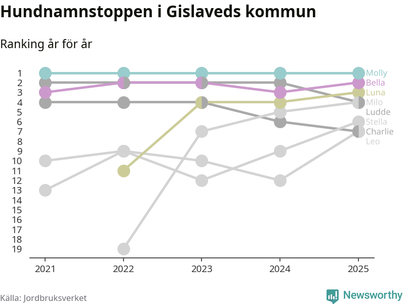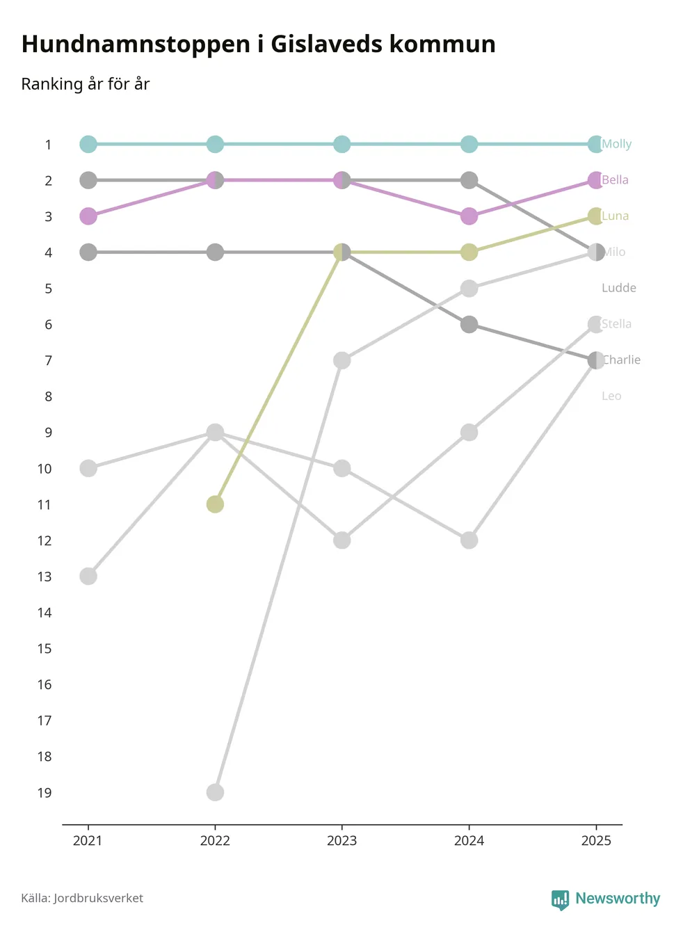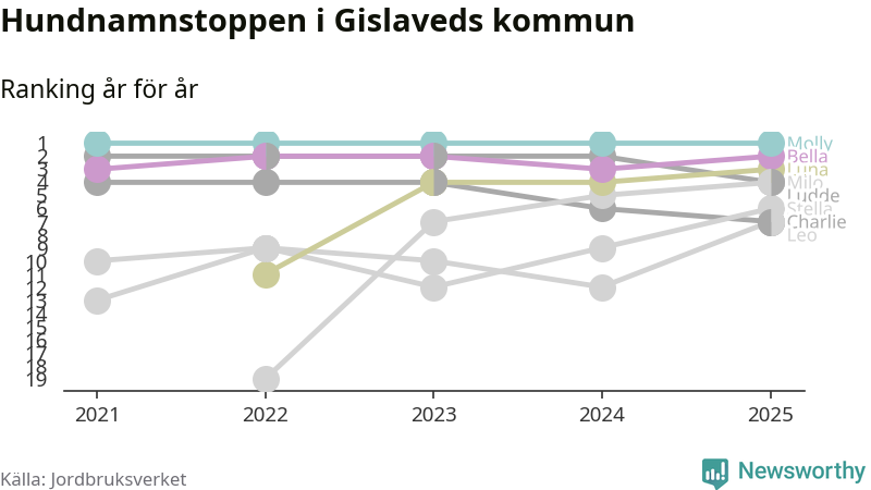 Molly är fortsatt ohotad etta bland hundnamnen i Sverige, följt av Bella och Charlie. Så har det sett ut flera år i rad, och även bland Gislavedshundarna ligger Molly i topp.