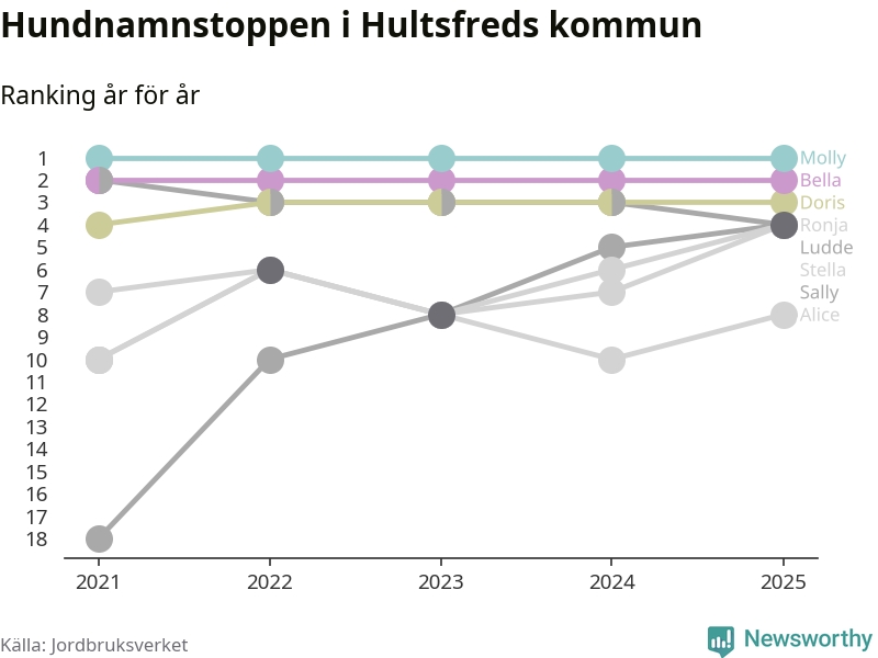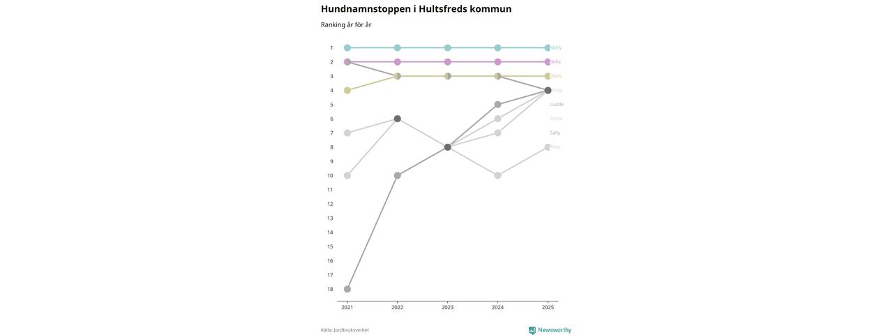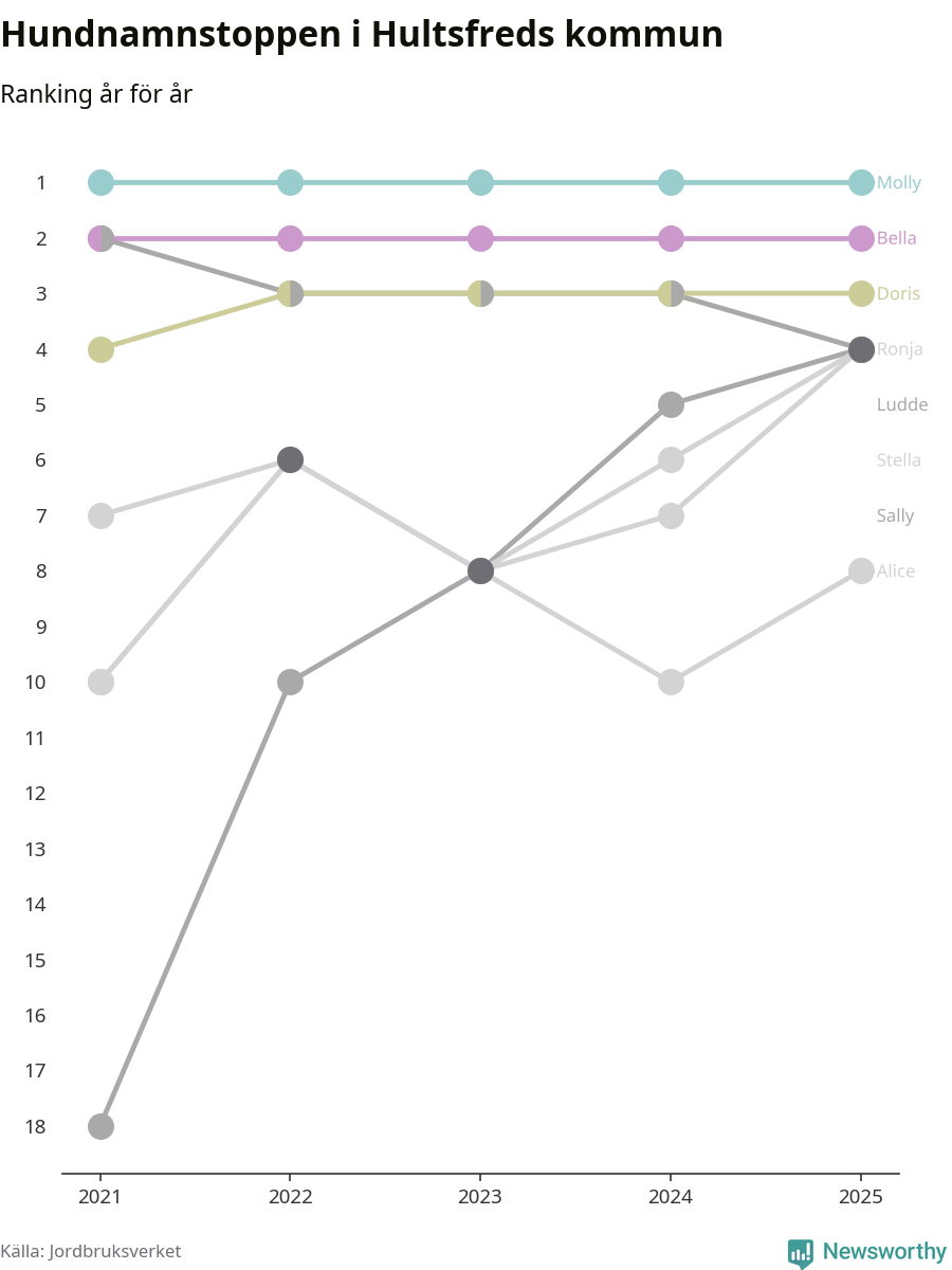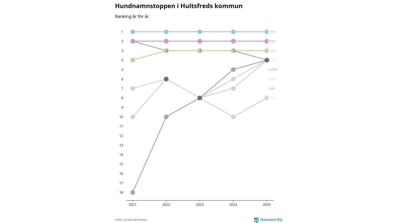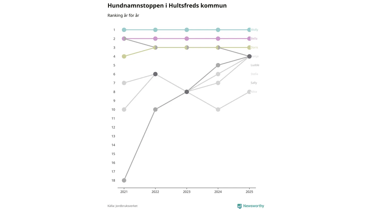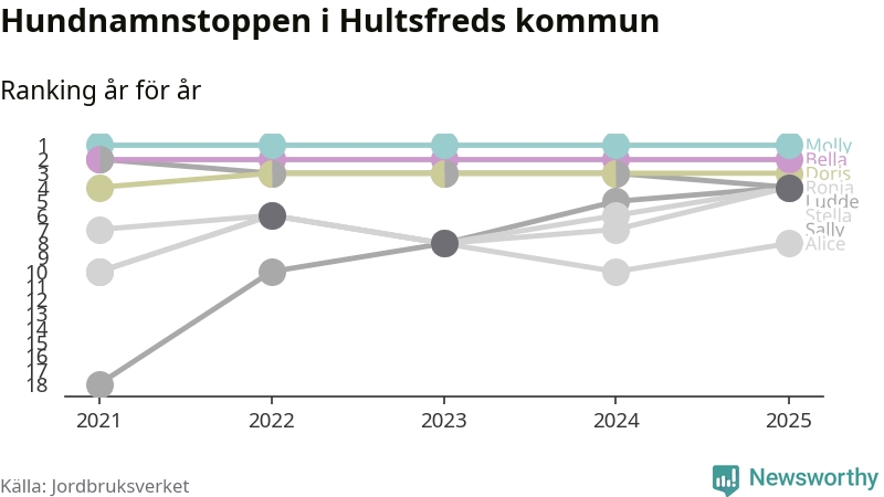 Molly toppar hundnamnsligan i Hultsfreds kommun, precis som i landet som helhet. Det visar färsk statistik från Jordbruksverket. Här finns hela topplistan för kommunen.