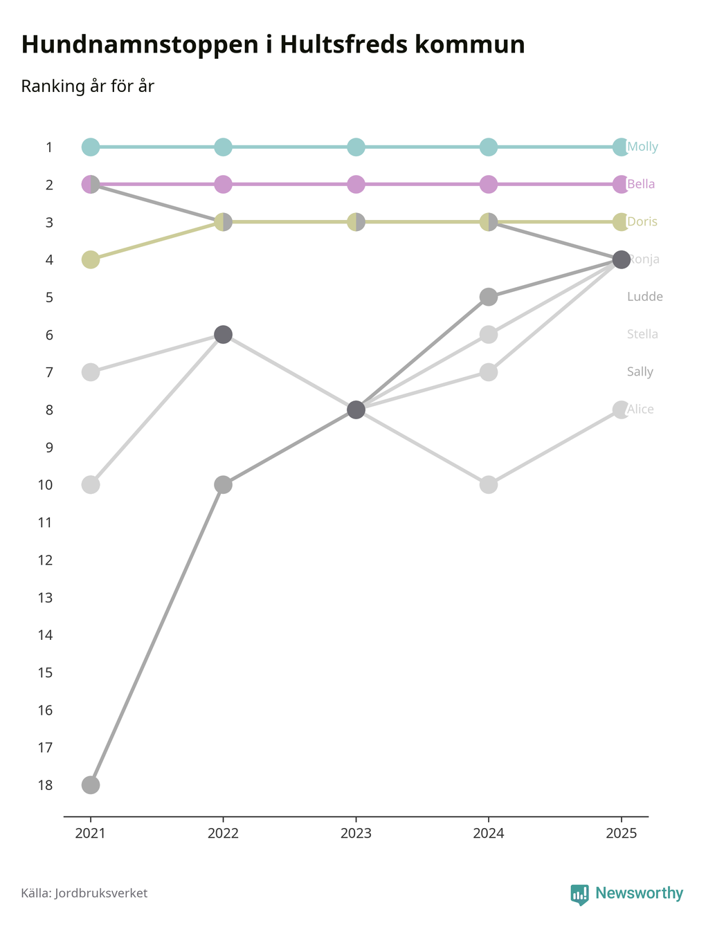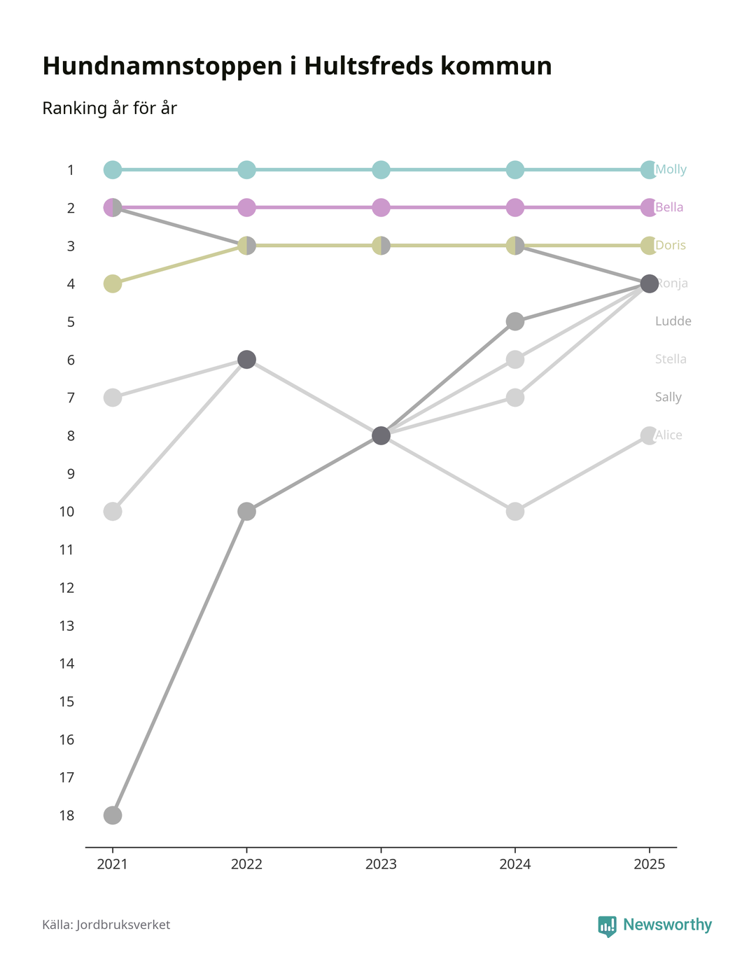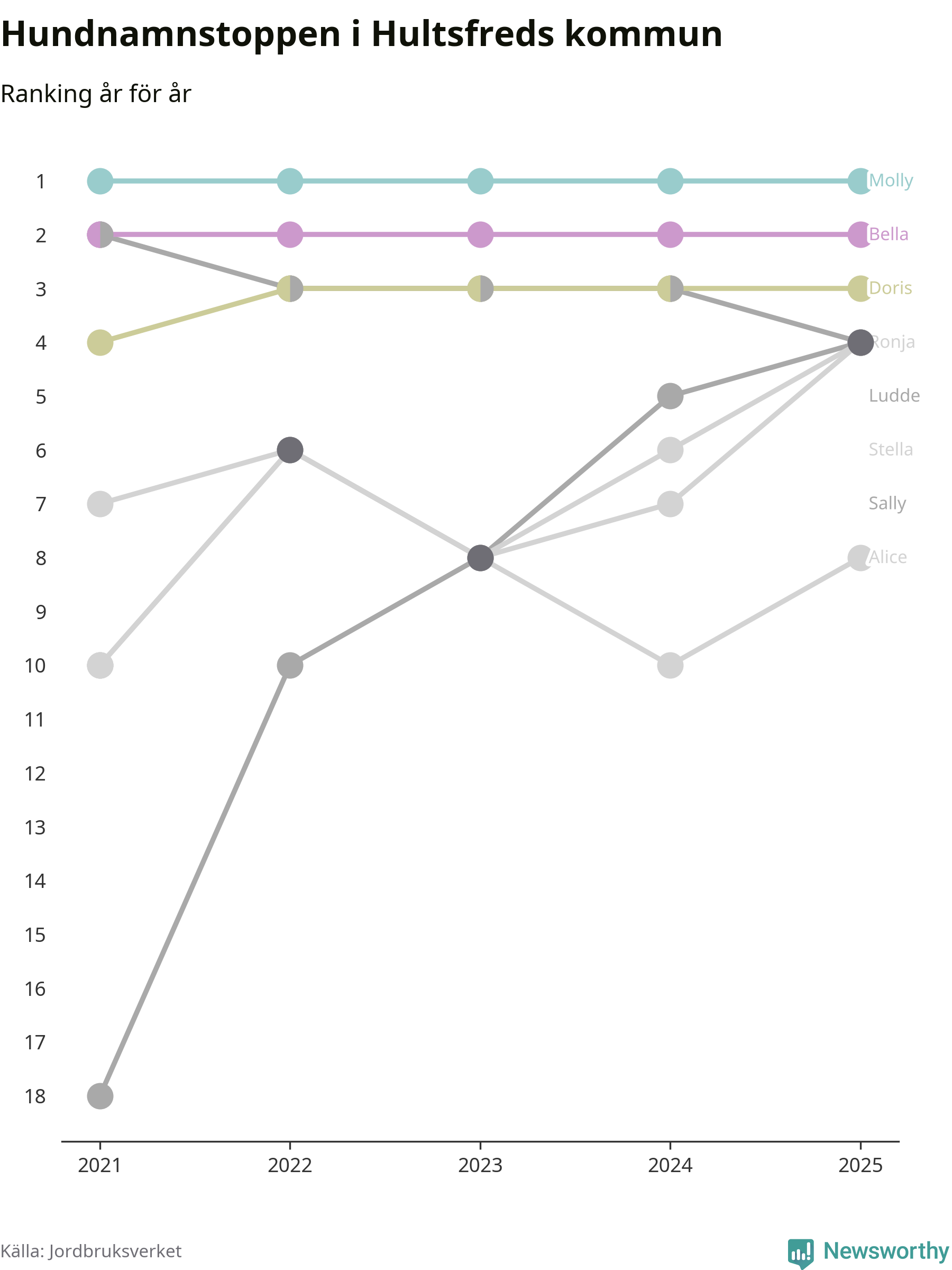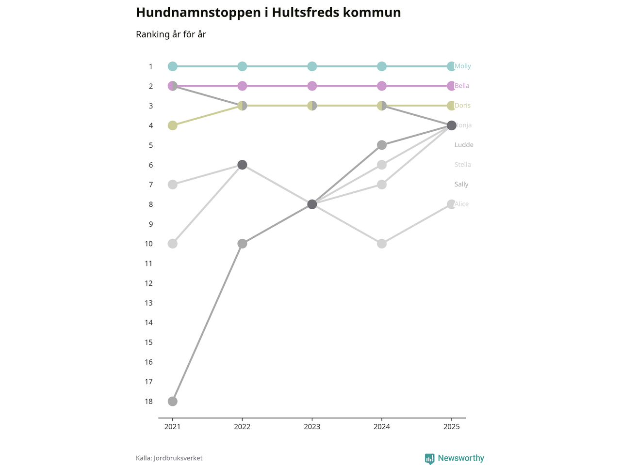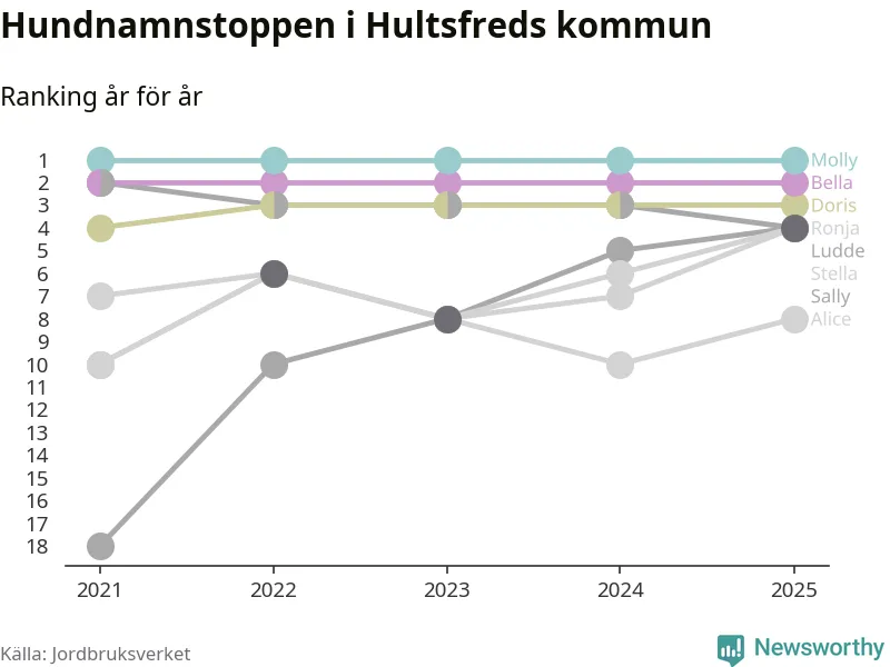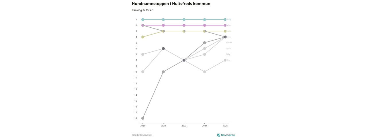 I hela landet är Molly det ohotat populäraste tilltalsnamnet för hundar sedan flera år, följt av Bella och Charlie. Något av de tre namnen toppar listan i 243 av 290 kommuner, och de har varit de vanligaste namnen sedan åtminstone 2018. Men det fjärde populäraste namnet, Doris, knappade in på ledartrion och kommer snart kunna utmana Charlie om tredjeplatsen, om trenden håller i sig.