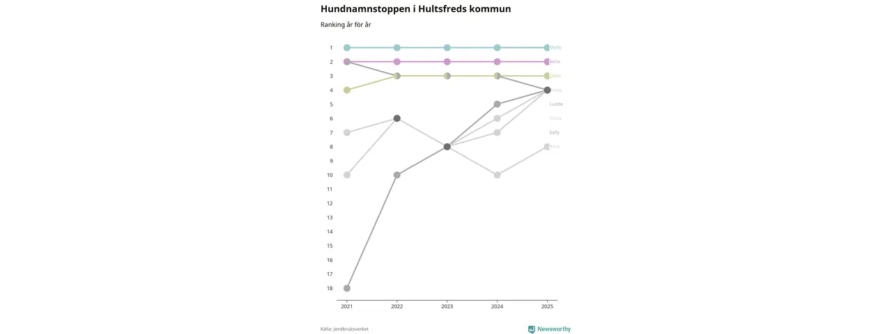 Molly är fortsatt ohotad etta bland hundnamnen i Sverige, följt av Bella och Charlie. Så har det sett ut flera år i rad, och även bland Hultsfredshundarna ligger alltså Molly i topp.