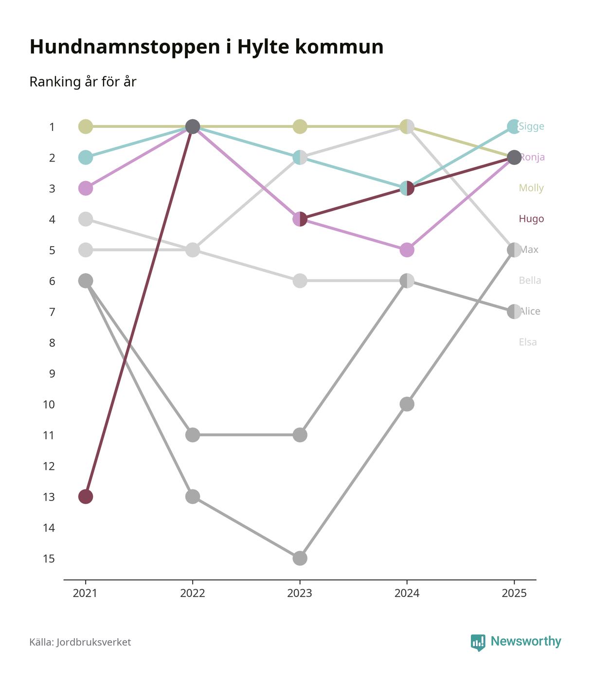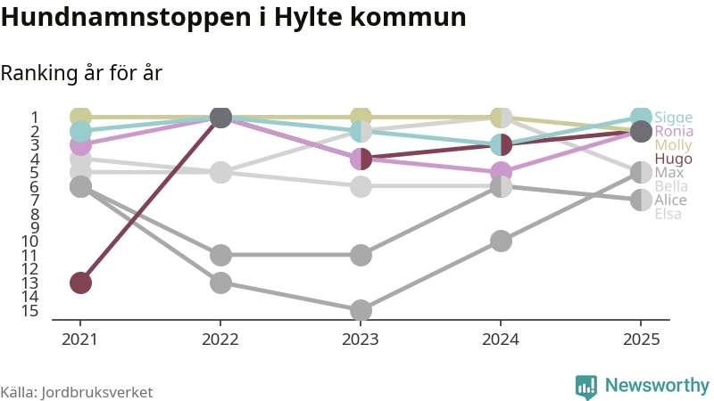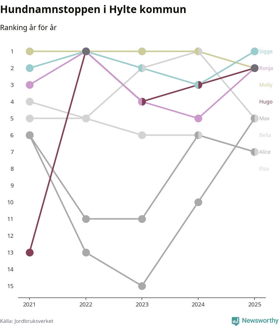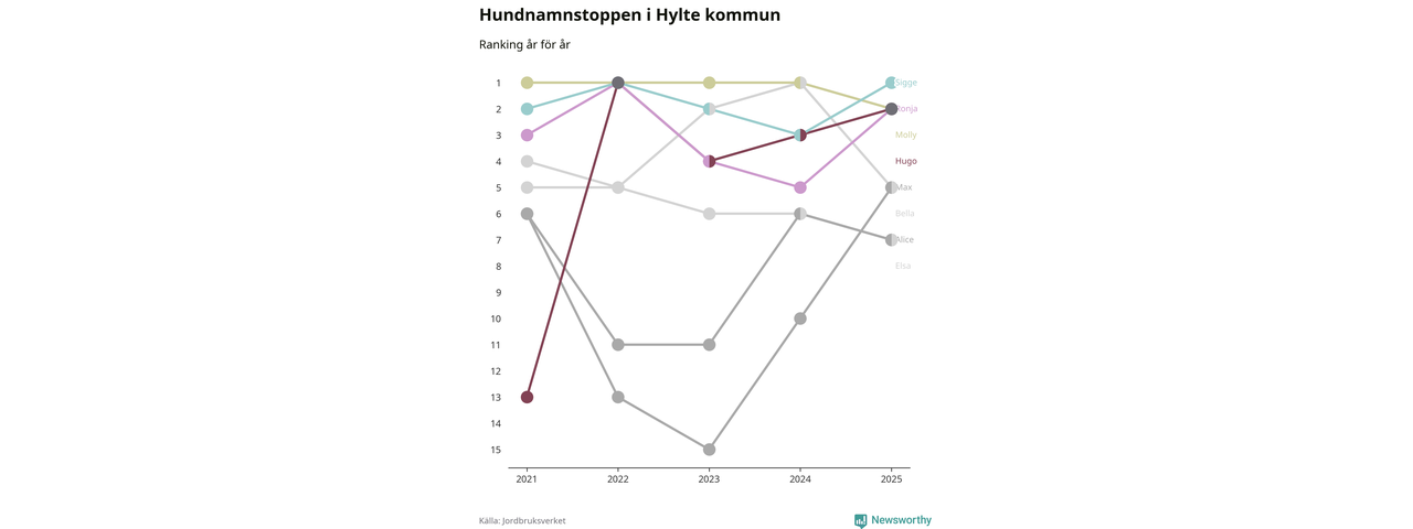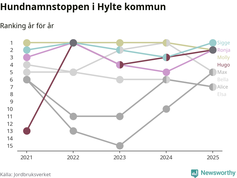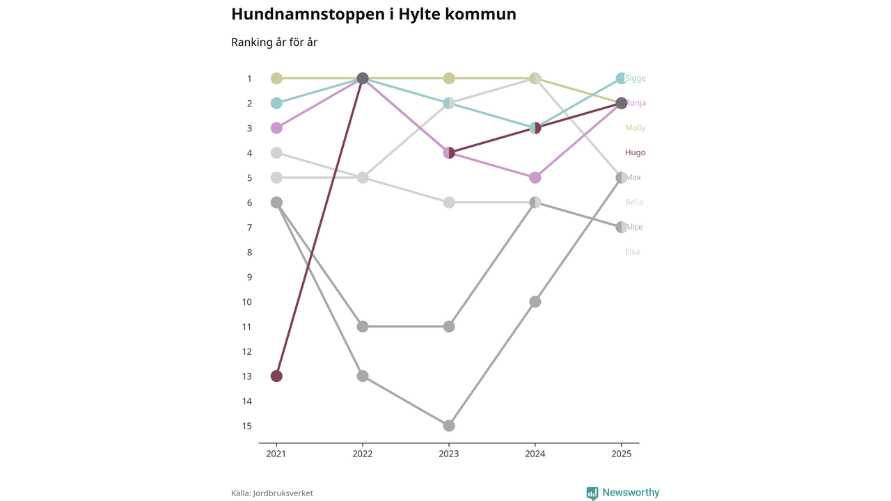 Molly är fortsatt ohotad etta bland hundnamnen i Sverige, följt av Bella och Charlie. Så har det sett ut flera år i rad, men bland Hyltehundarna är Sigge populärast. Hylte är en av 14 kommuner i landet där Sigge är vanligast, eller på delad förstaplats.