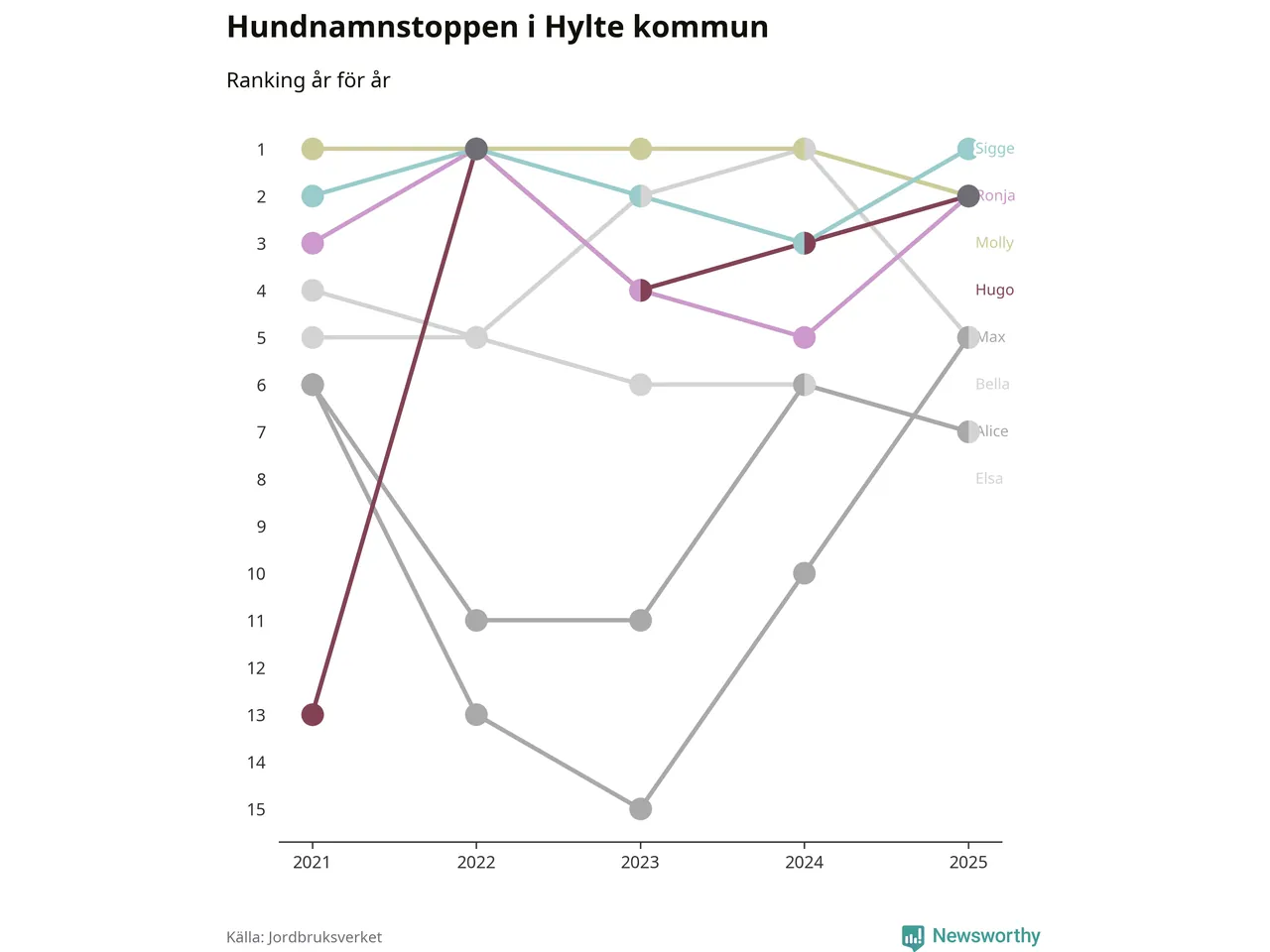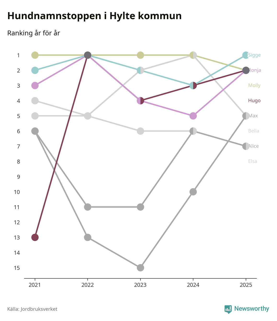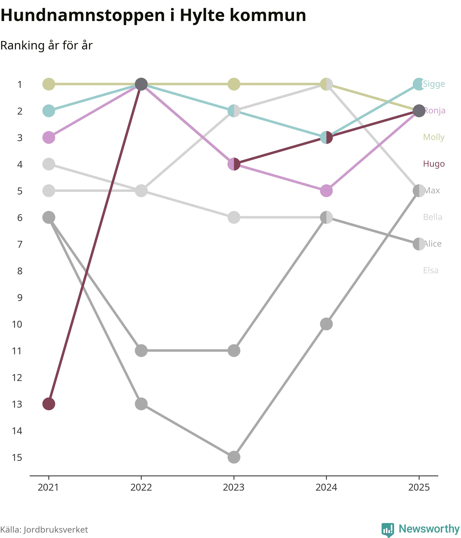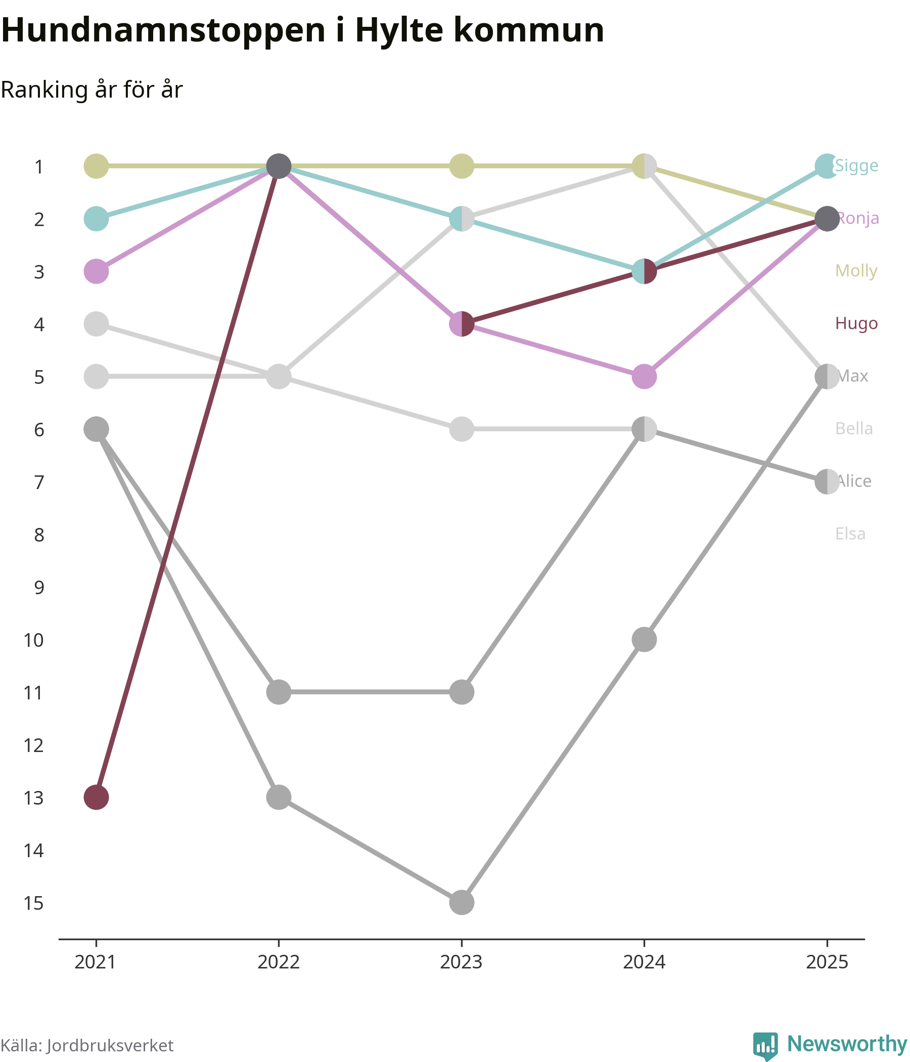 Molly är fortsatt ohotad etta bland hundnamnen i Sverige, följt av Bella och Charlie. Så har det sett ut flera år i rad, men bland Hyltehundarna är Sigge populärast. Hylte är en av 14 kommuner i landet där Sigge är vanligast, eller på delad förstaplats.