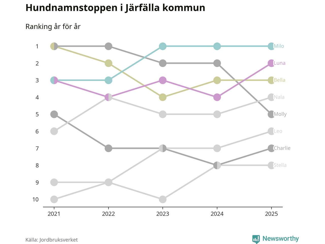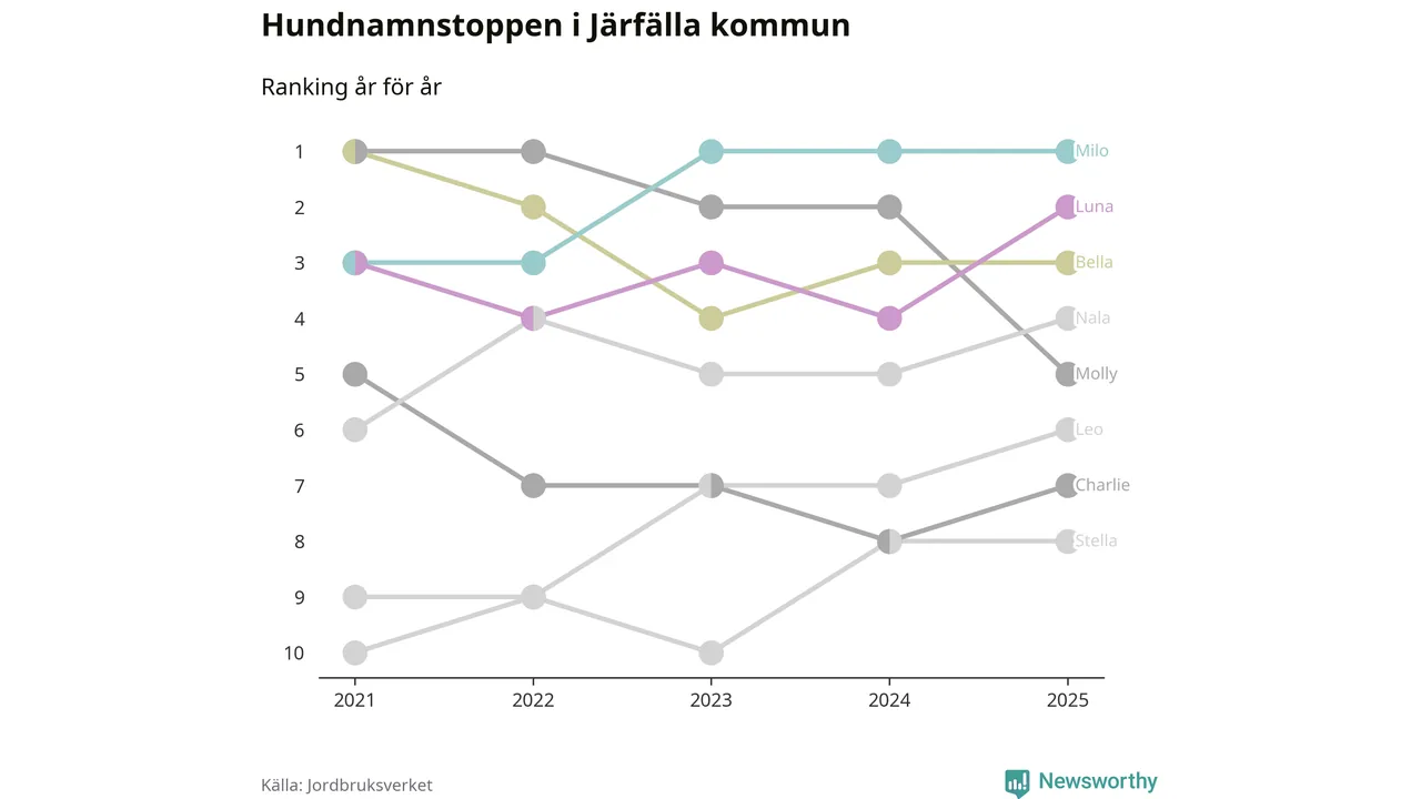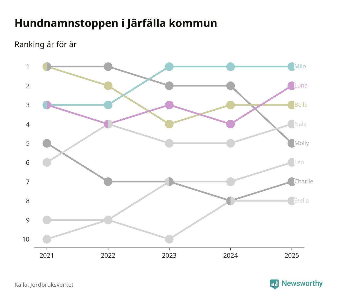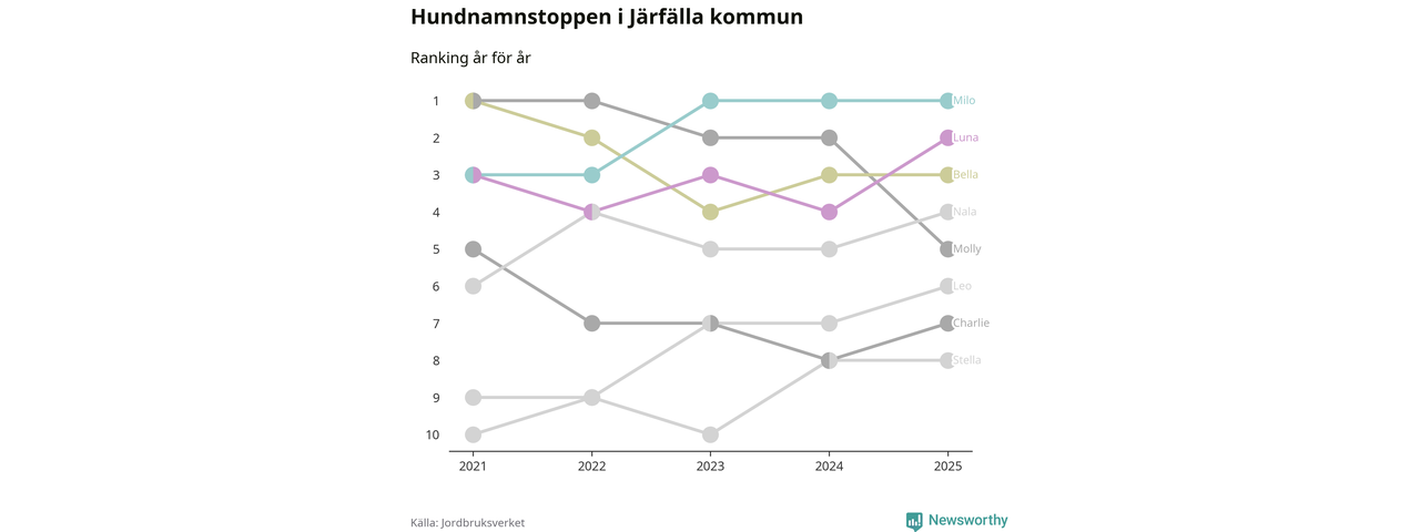 Molly är fortsatt ohotad etta bland hundnamnen i Sverige, följt av Bella och Charlie. Så har det sett ut flera år i rad, men bland Järfällahundarna är Milo populärast. Det gör Järfälla till den enda kommun i landet där Milo är vanligast.