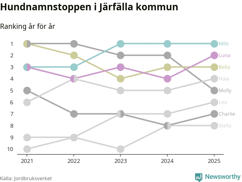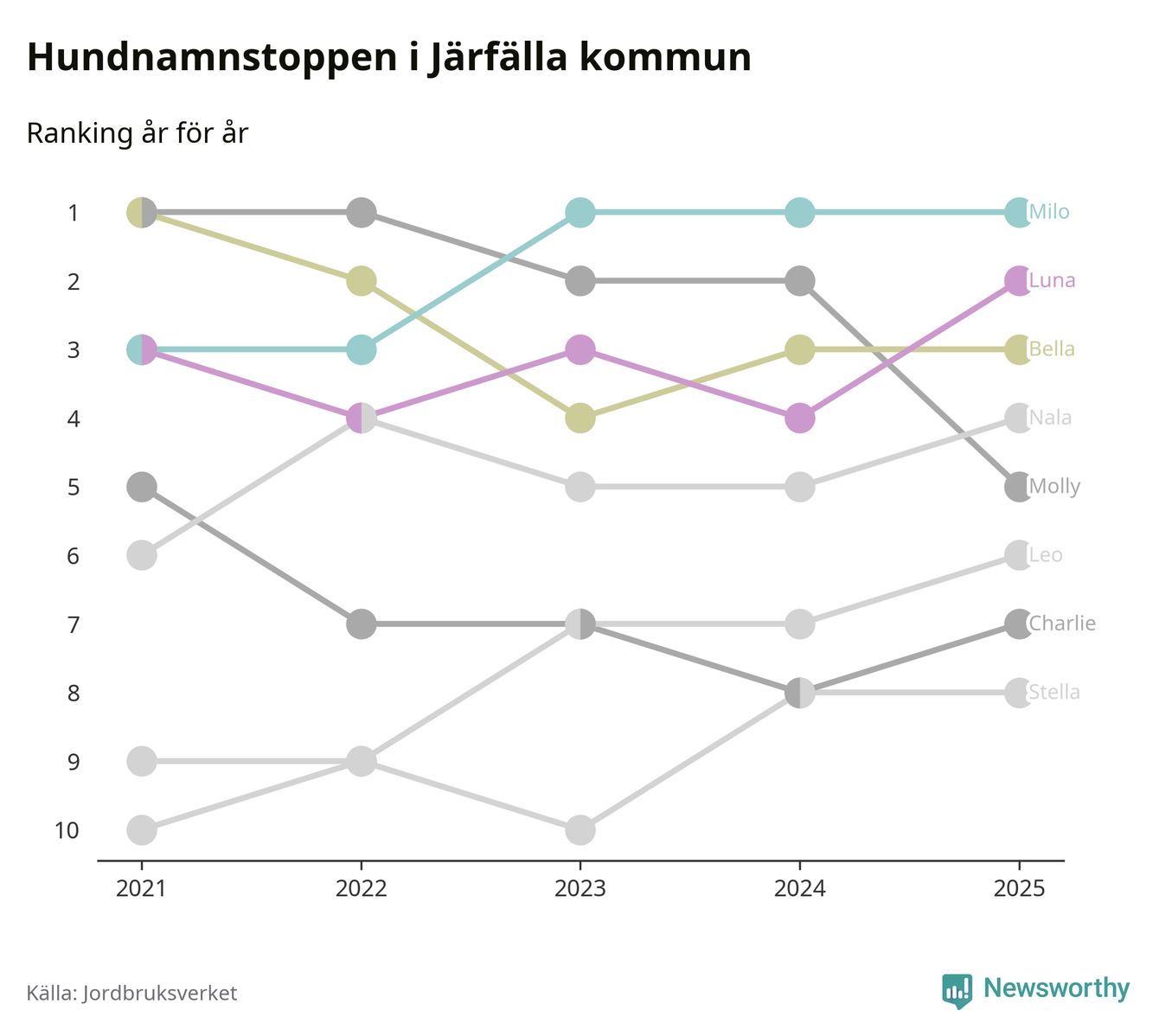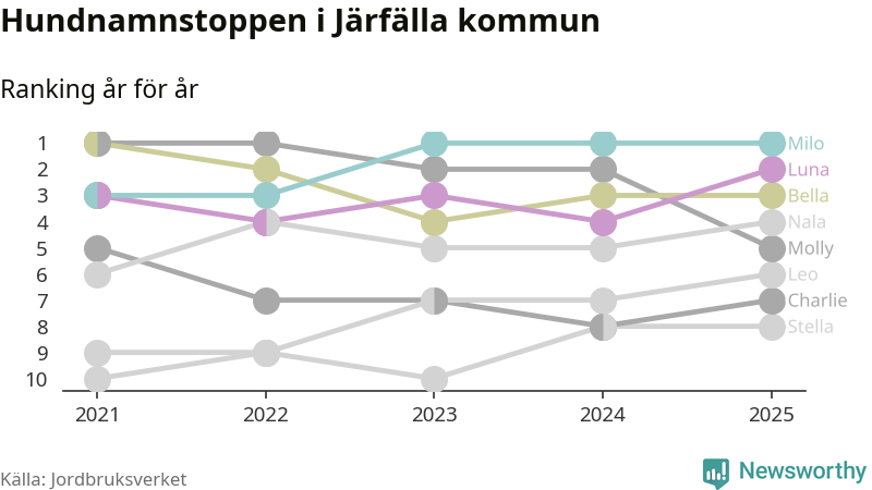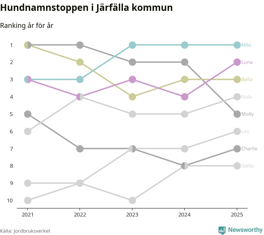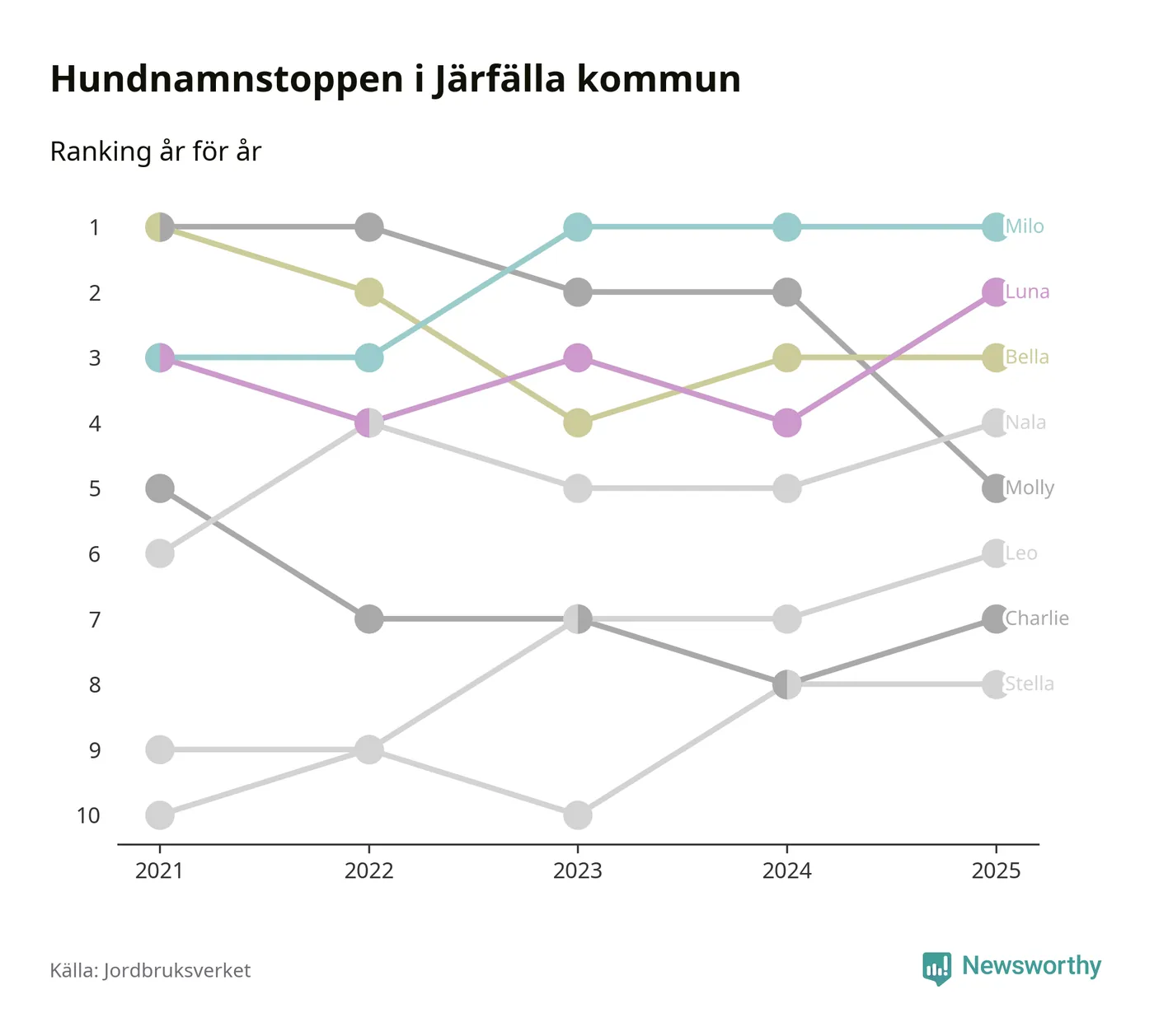 Molly är fortsatt ohotad etta bland hundnamnen i Sverige, följt av Bella och Charlie. Så har det sett ut flera år i rad, men bland Järfällahundarna är Milo populärast. Det gör Järfälla till den enda kommun i landet där Milo är vanligast.