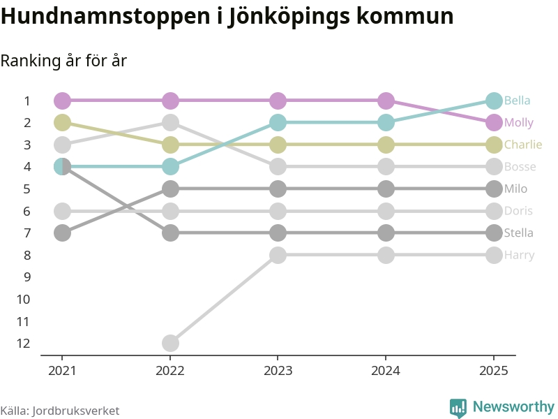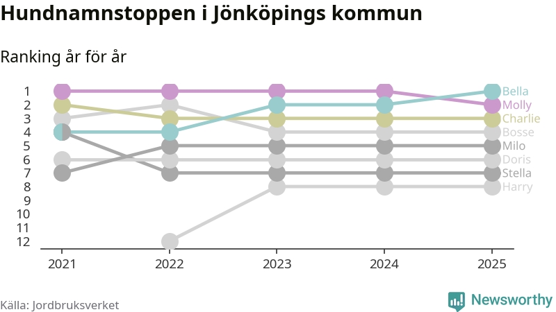 I hela landet är Molly det ohotat populäraste tilltalsnamnet för hundar sedan flera år, följt av Bella och Charlie. Något av de tre namnen toppar listan i 243 av 290 kommuner, och de har varit de vanligaste namnen sedan åtminstone 2018. Men det fjärde populäraste namnet, Doris, knappade in på ledartrion och kommer snart kunna utmana Charlie om tredjeplatsen, om trenden håller i sig.