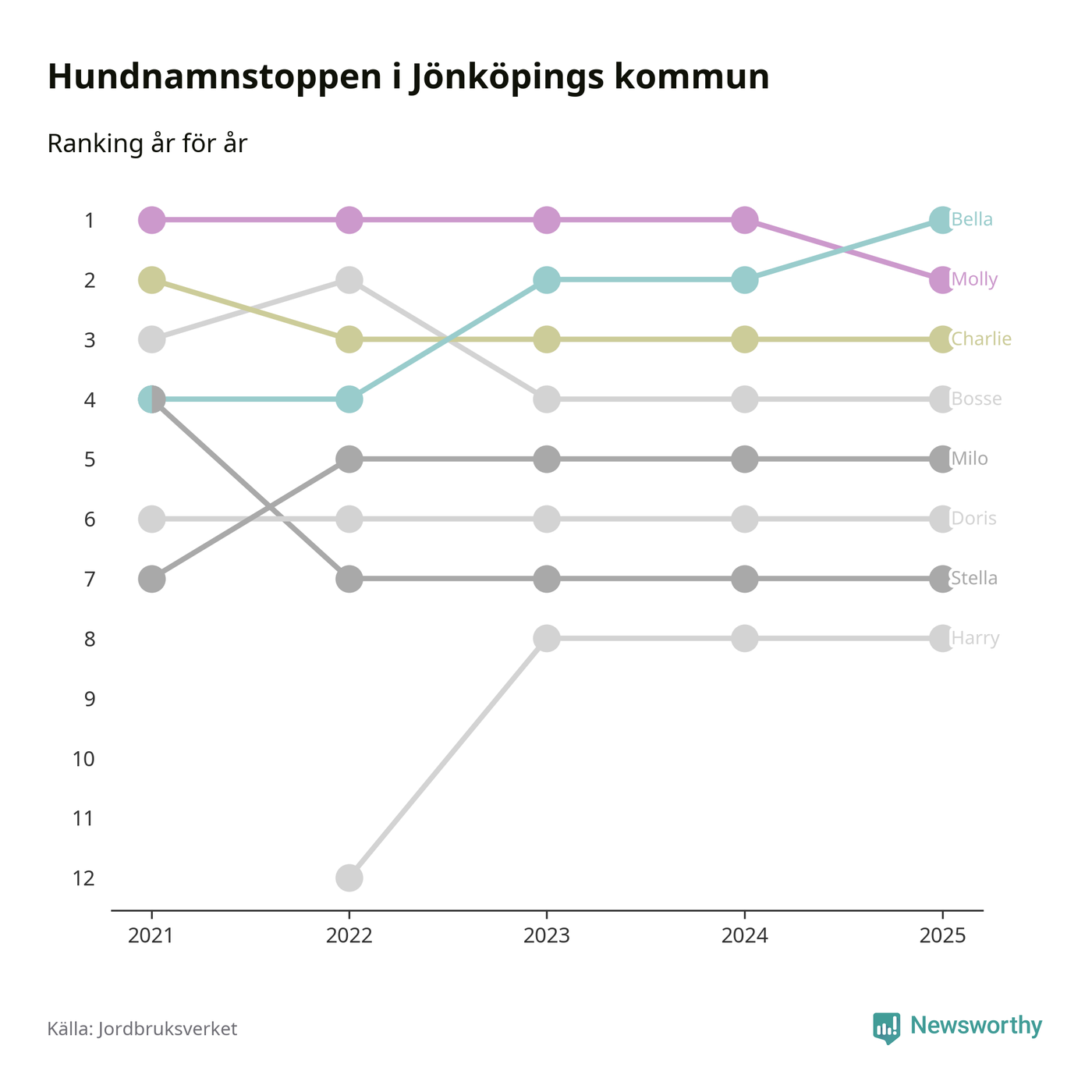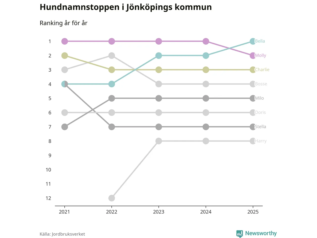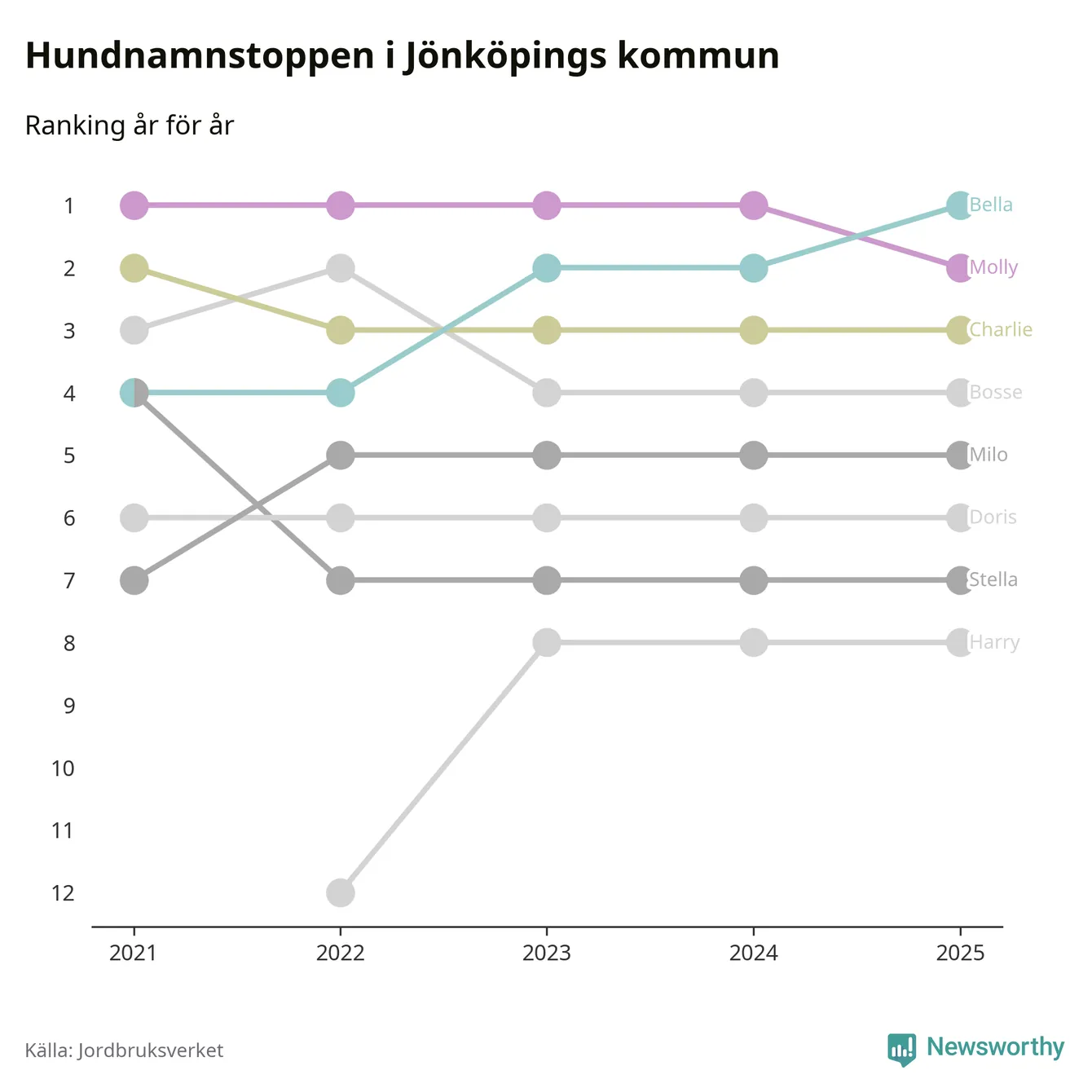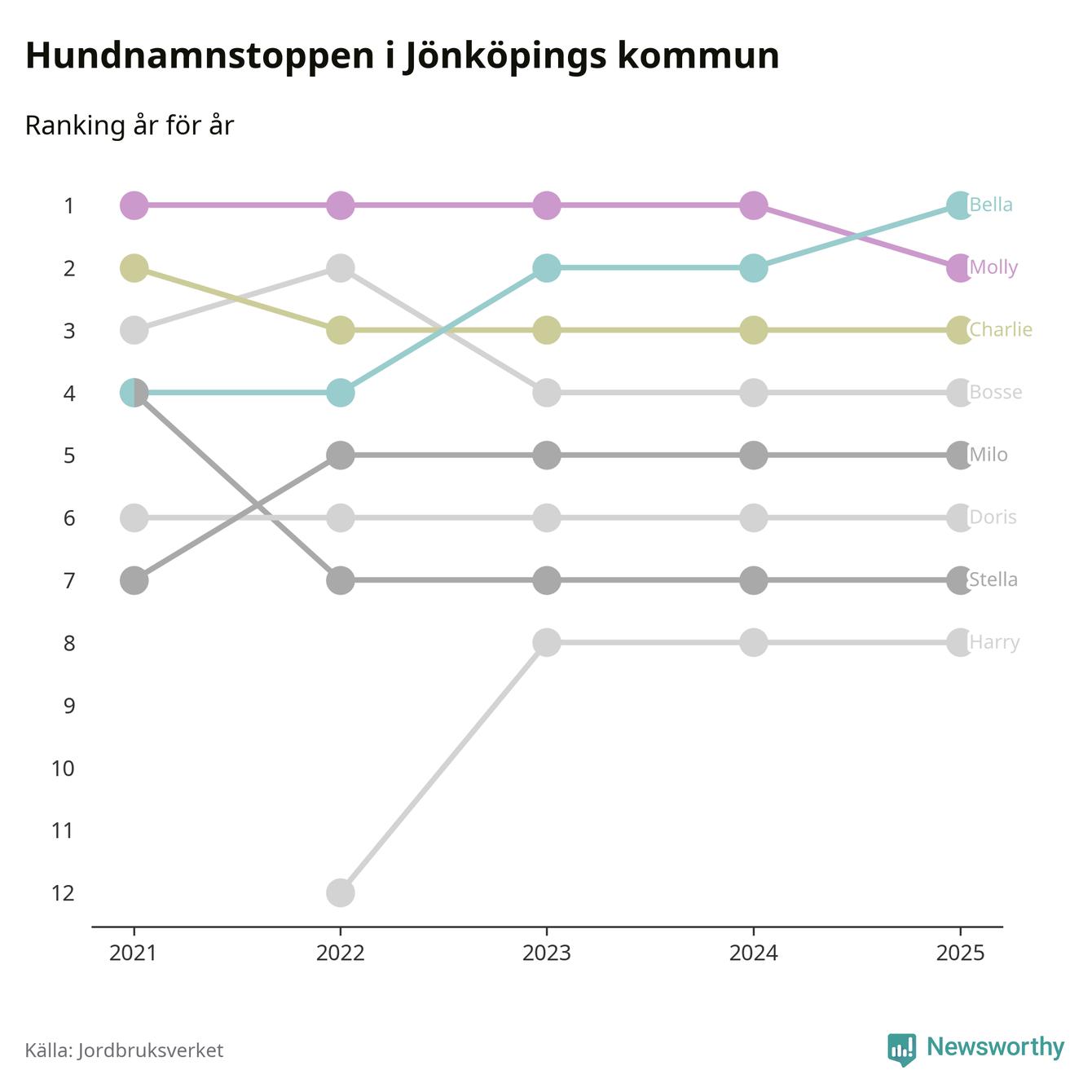 Molly är fortsatt ohotad etta bland hundnamnen i Sverige, följt av Bella och Charlie. Så har det sett ut flera år i rad, men bland Jönköpingshundarna är Bella populärast.