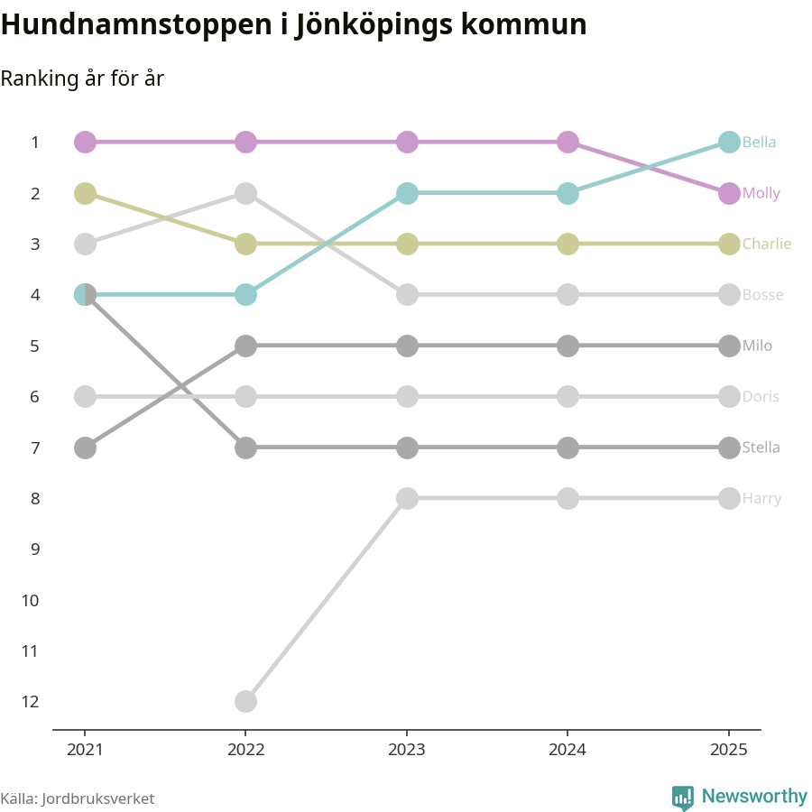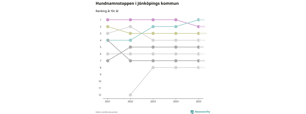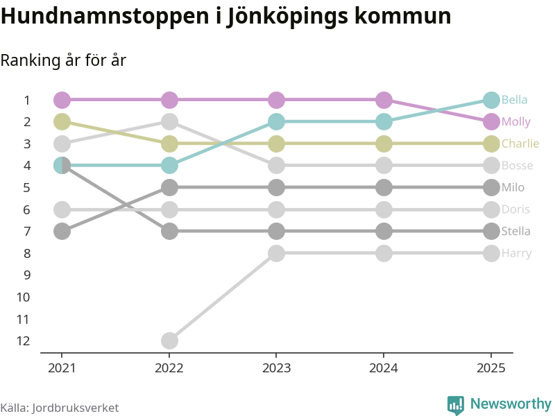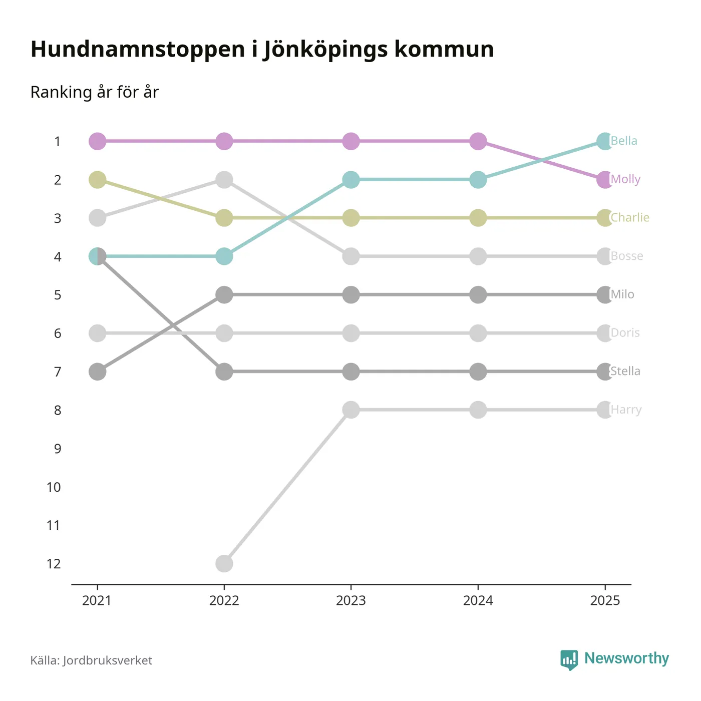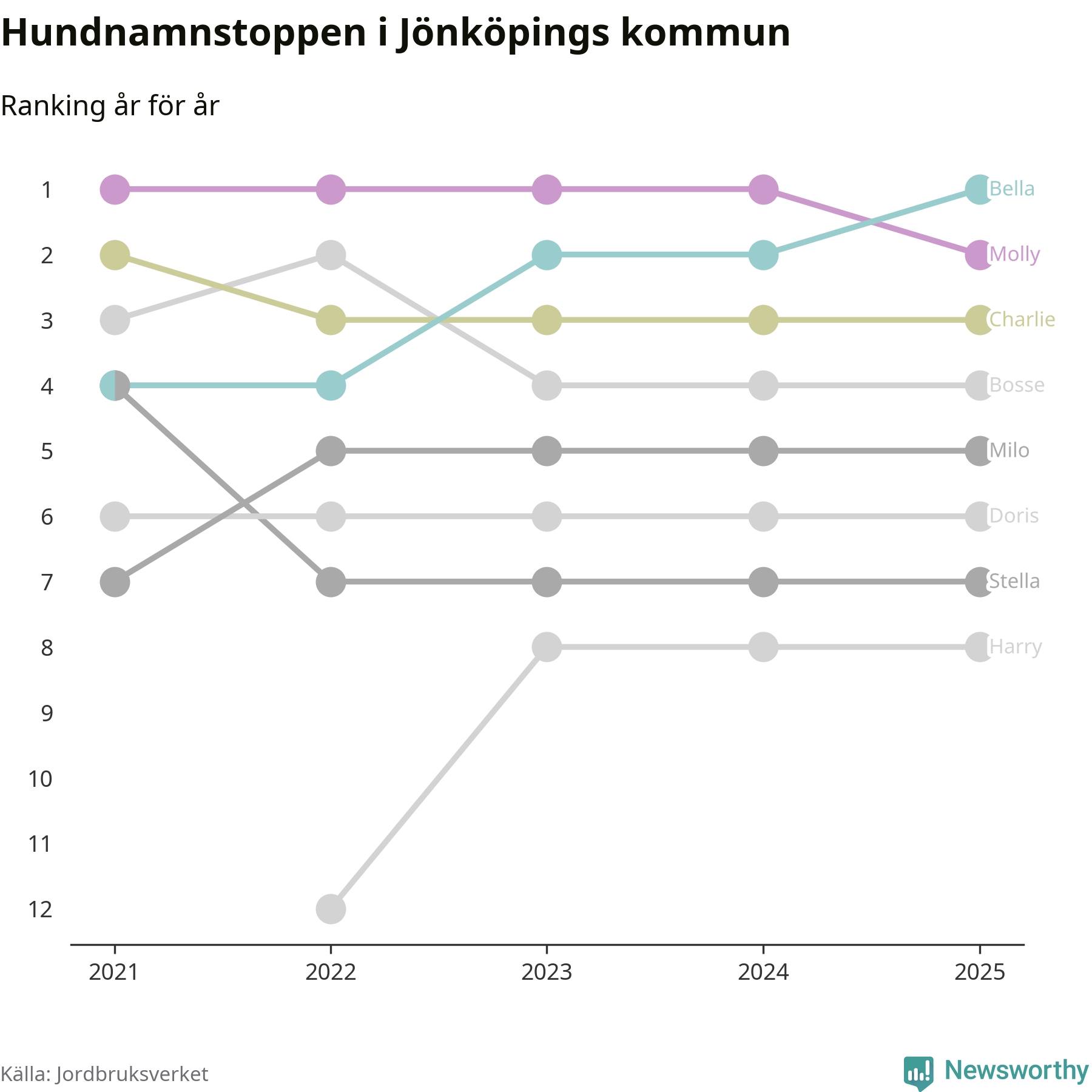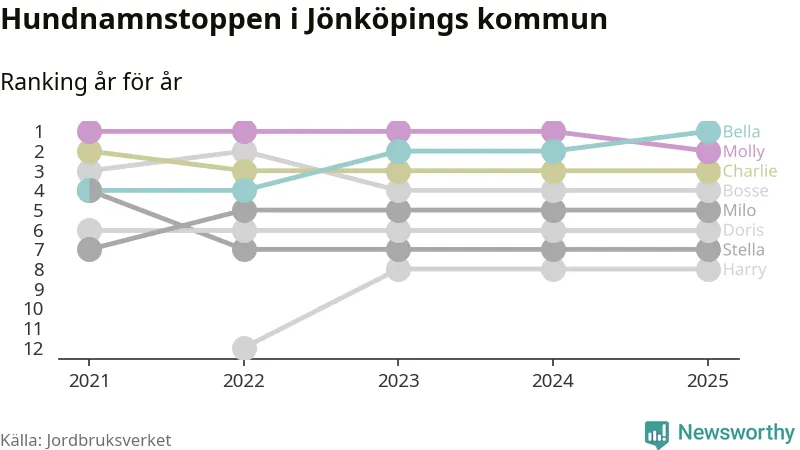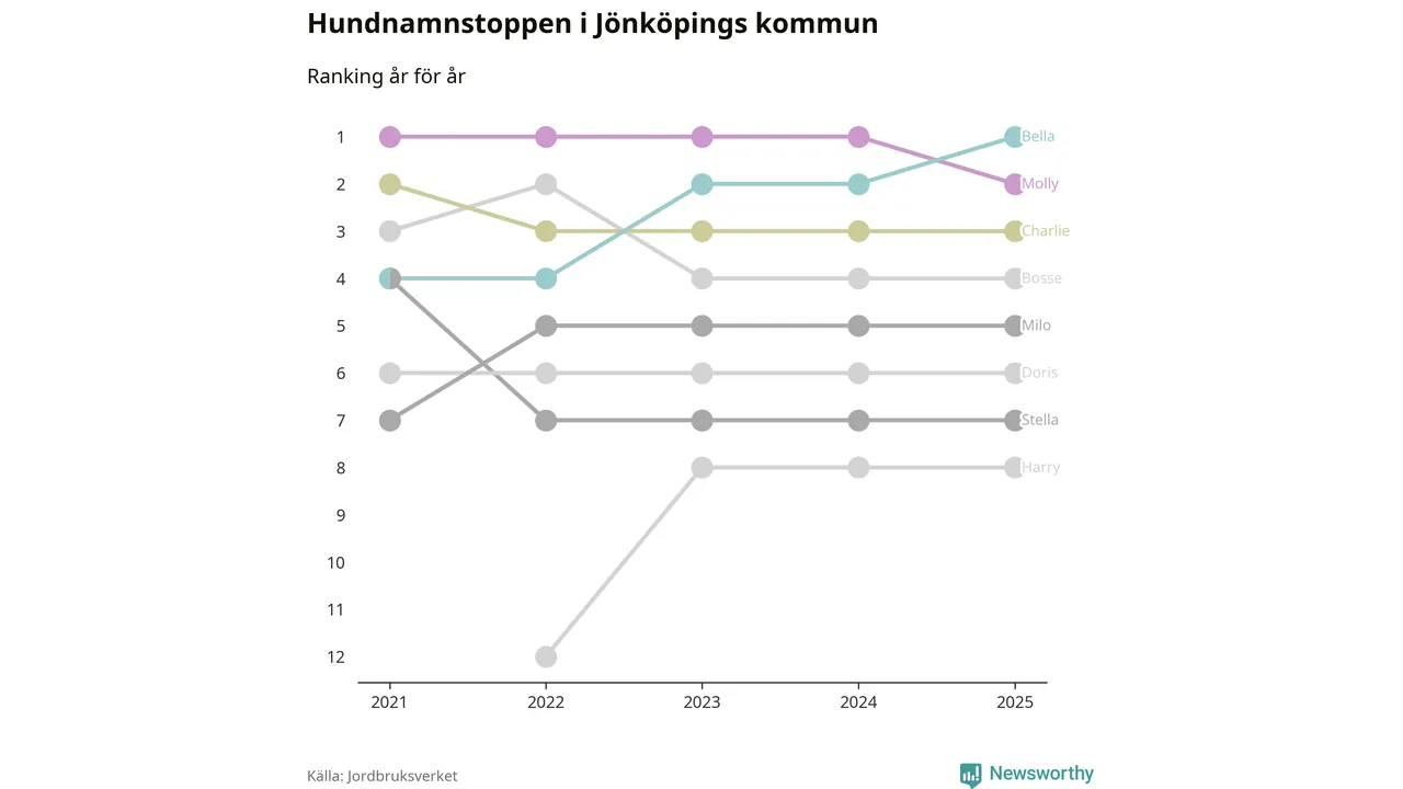 Molly är fortsatt ohotad etta bland hundnamnen i Sverige, följt av Bella och Charlie. Så har det sett ut flera år i rad, men bland Jönköpingshundarna är Bella populärast.