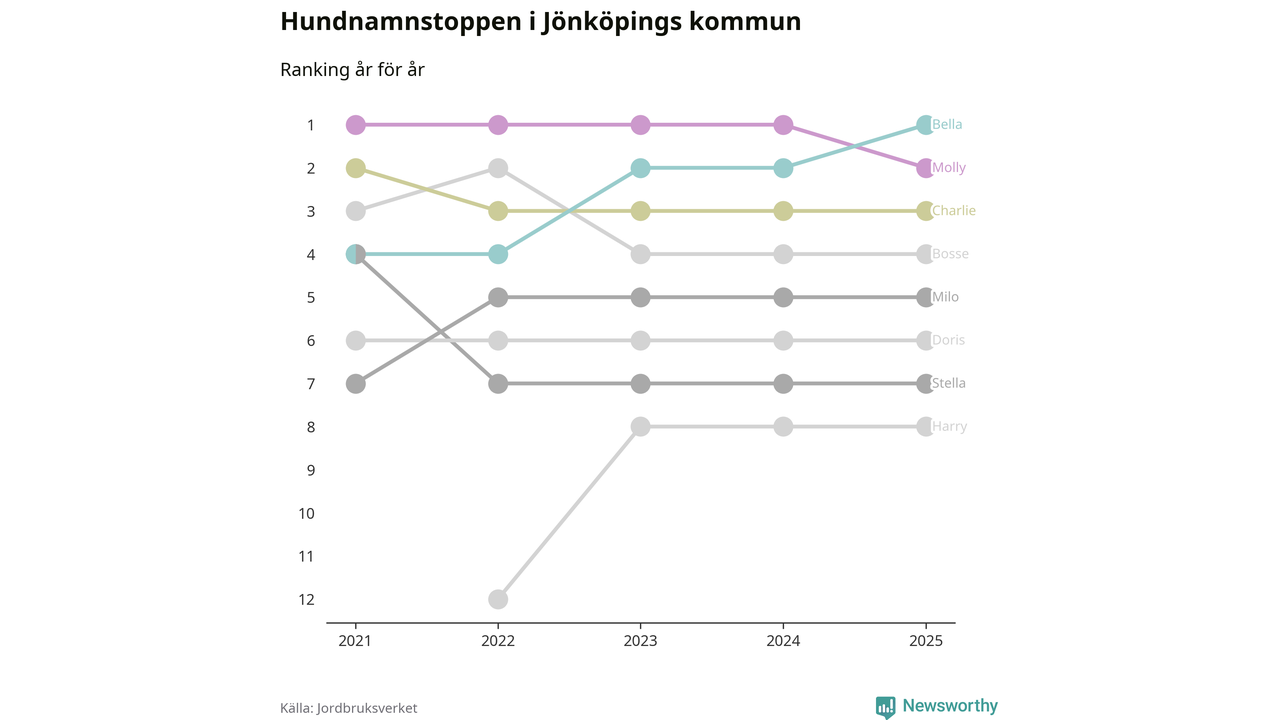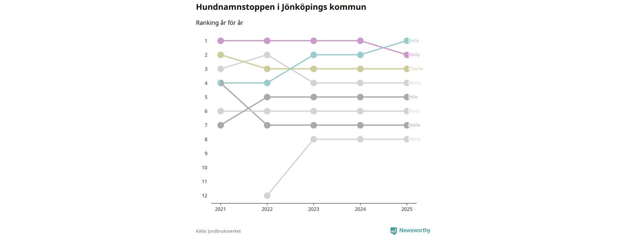 Bella är ny etta på topplistan över Jönköpings kommuns hundnamn, visar ny statistik från Jordbruksverkets hundregister. Bella finns också bland hela landets allra populäraste namn.
