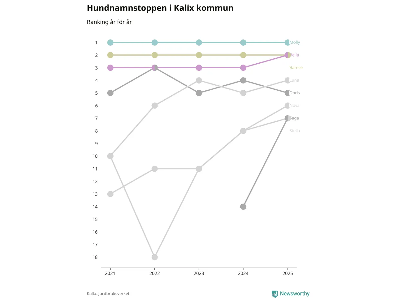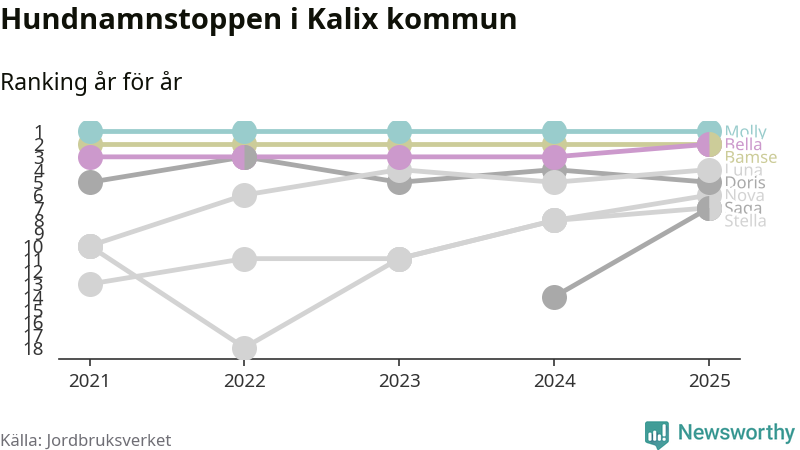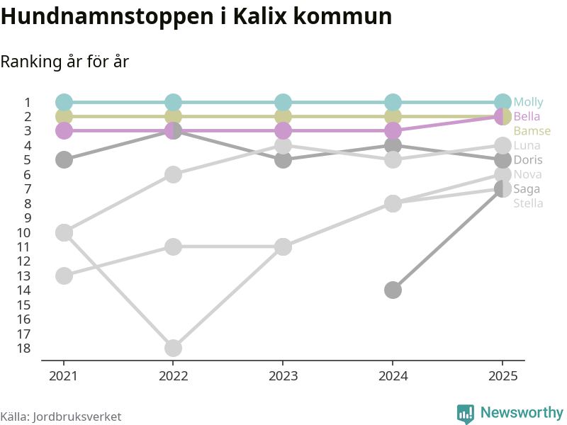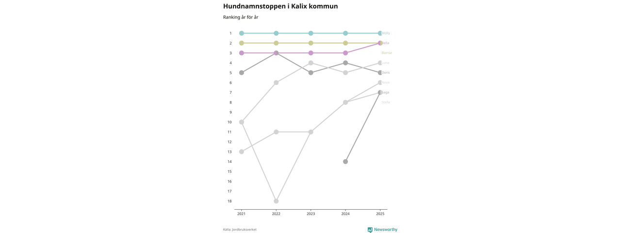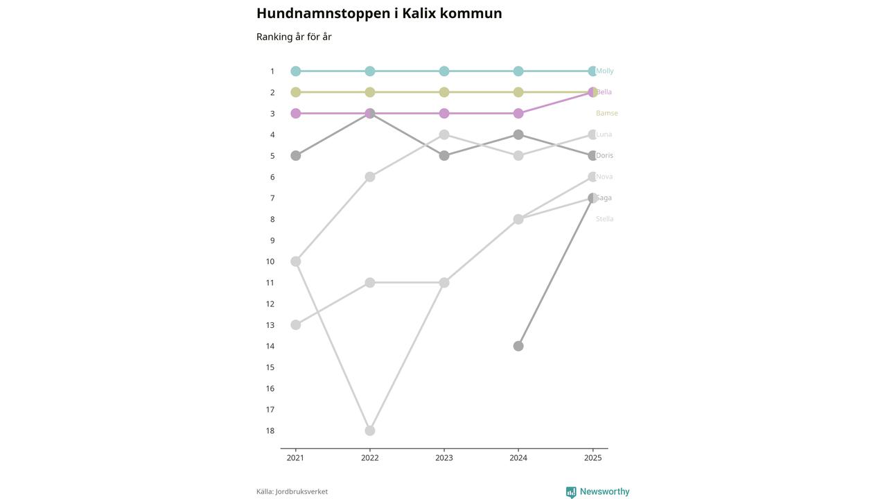 I hela landet är Molly det ohotat populäraste tilltalsnamnet för hundar sedan flera år, följt av Bella och Charlie. Något av de tre namnen toppar listan i 243 av 290 kommuner, och de har varit de vanligaste namnen sedan åtminstone 2018. Men det fjärde populäraste namnet, Doris, knappade in på ledartrion och kommer snart kunna utmana Charlie om tredjeplatsen, om trenden håller i sig.