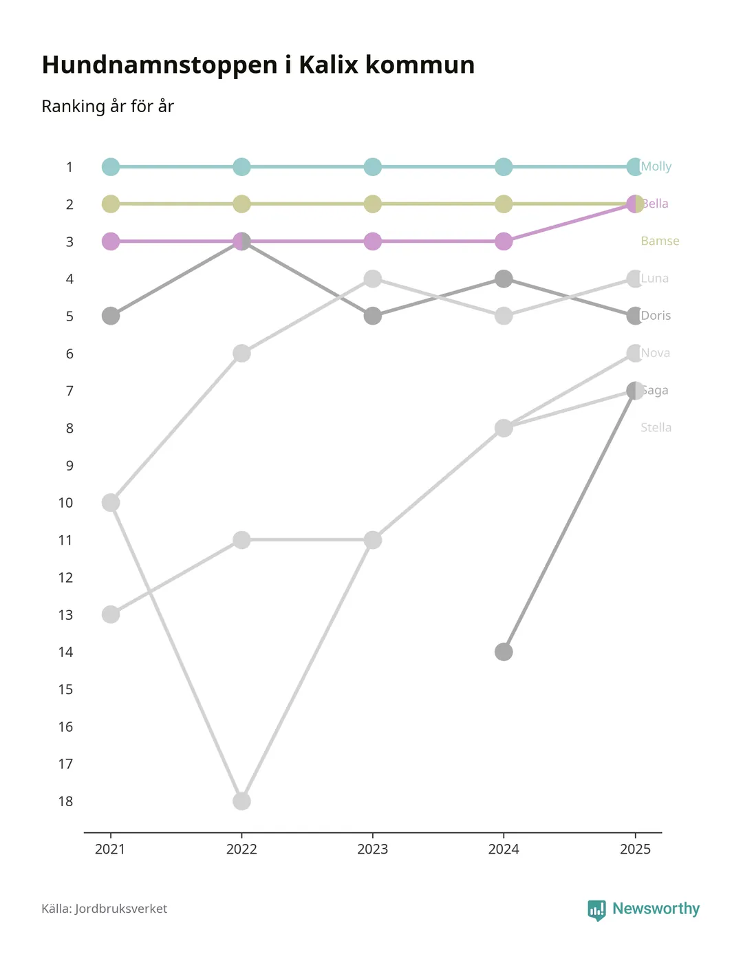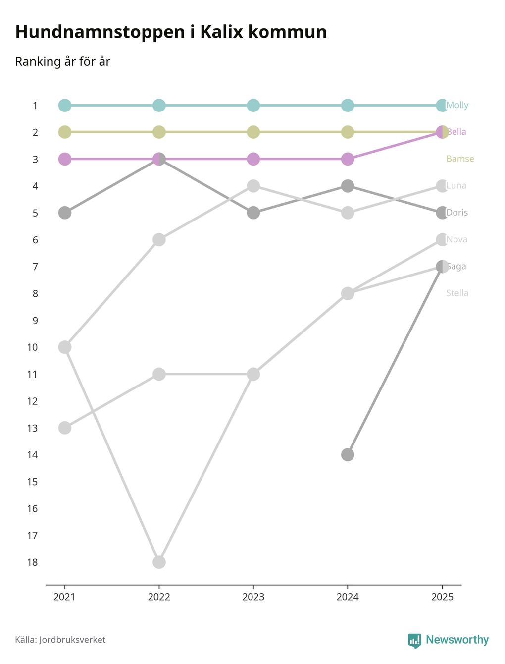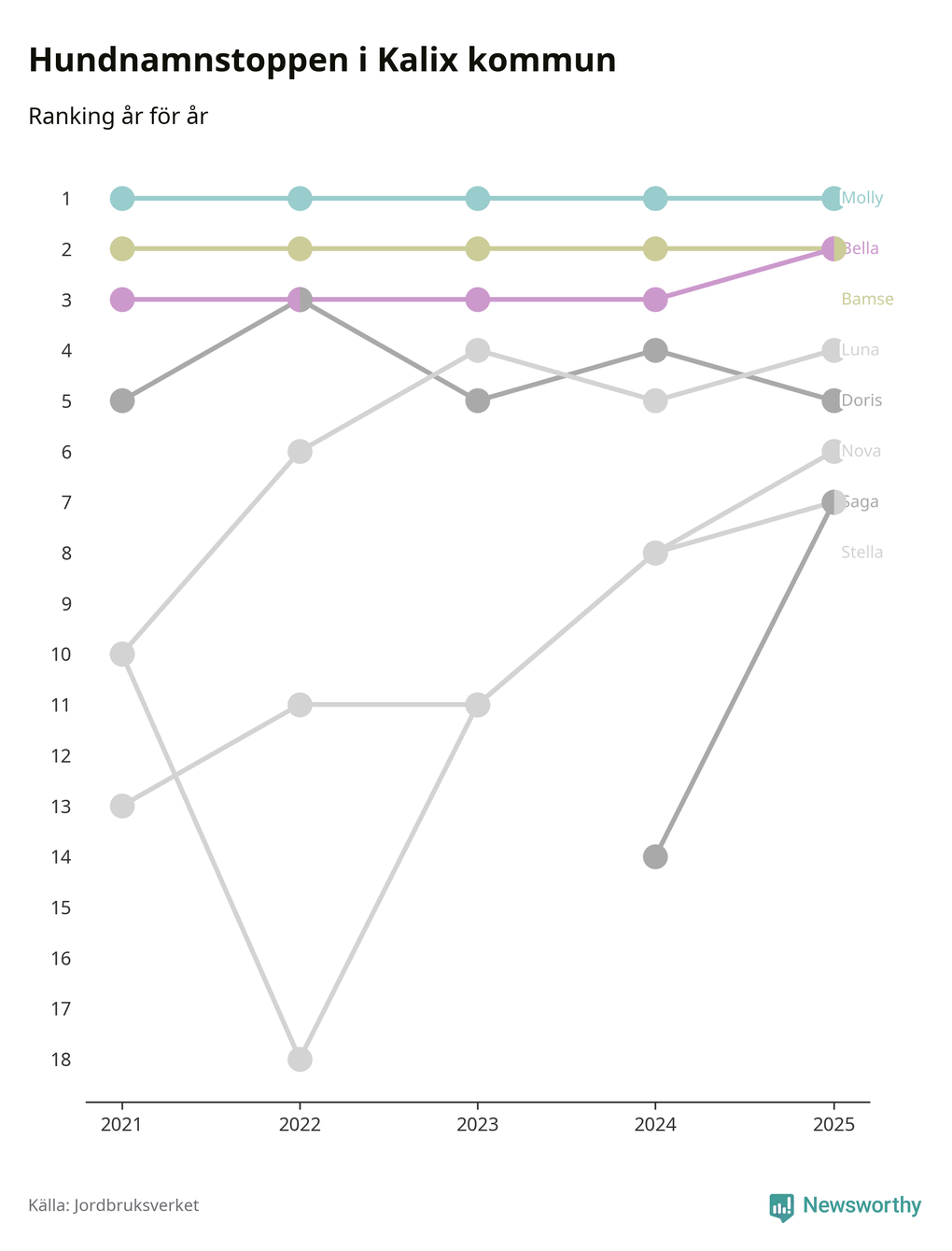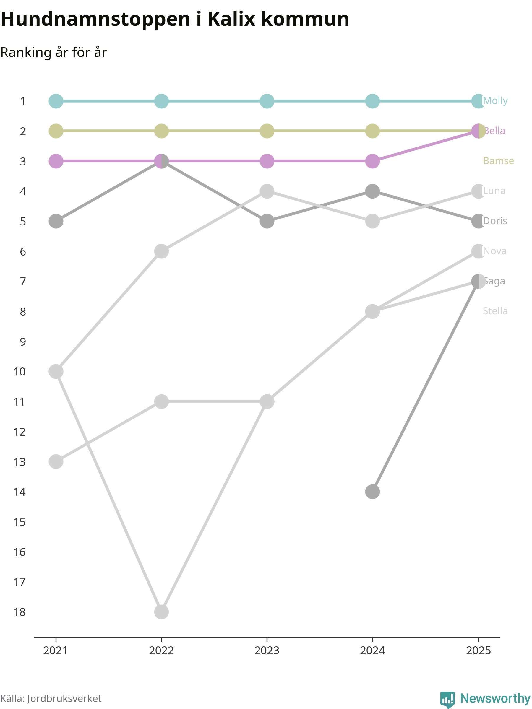 I hela landet är Molly det ohotat populäraste tilltalsnamnet för hundar sedan flera år, följt av Bella och Charlie. Något av de tre namnen toppar listan i 243 av 290 kommuner, och de har varit de vanligaste namnen sedan åtminstone 2018. Men det fjärde populäraste namnet, Doris, knappade in på ledartrion och kommer snart kunna utmana Charlie om tredjeplatsen, om trenden håller i sig.