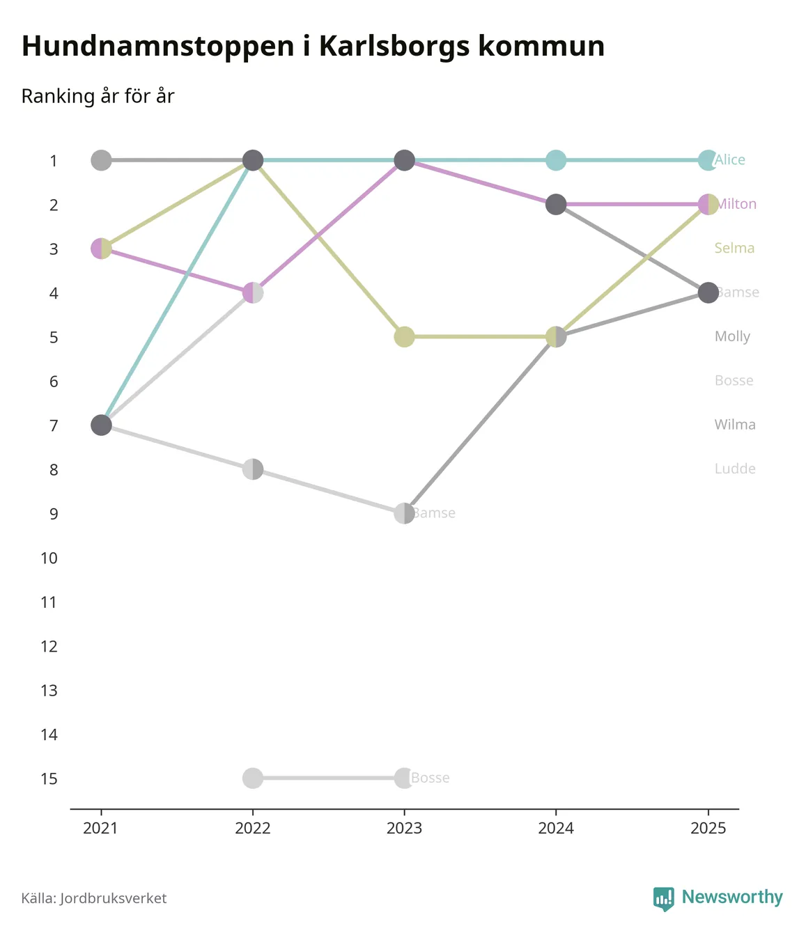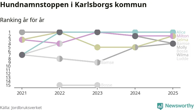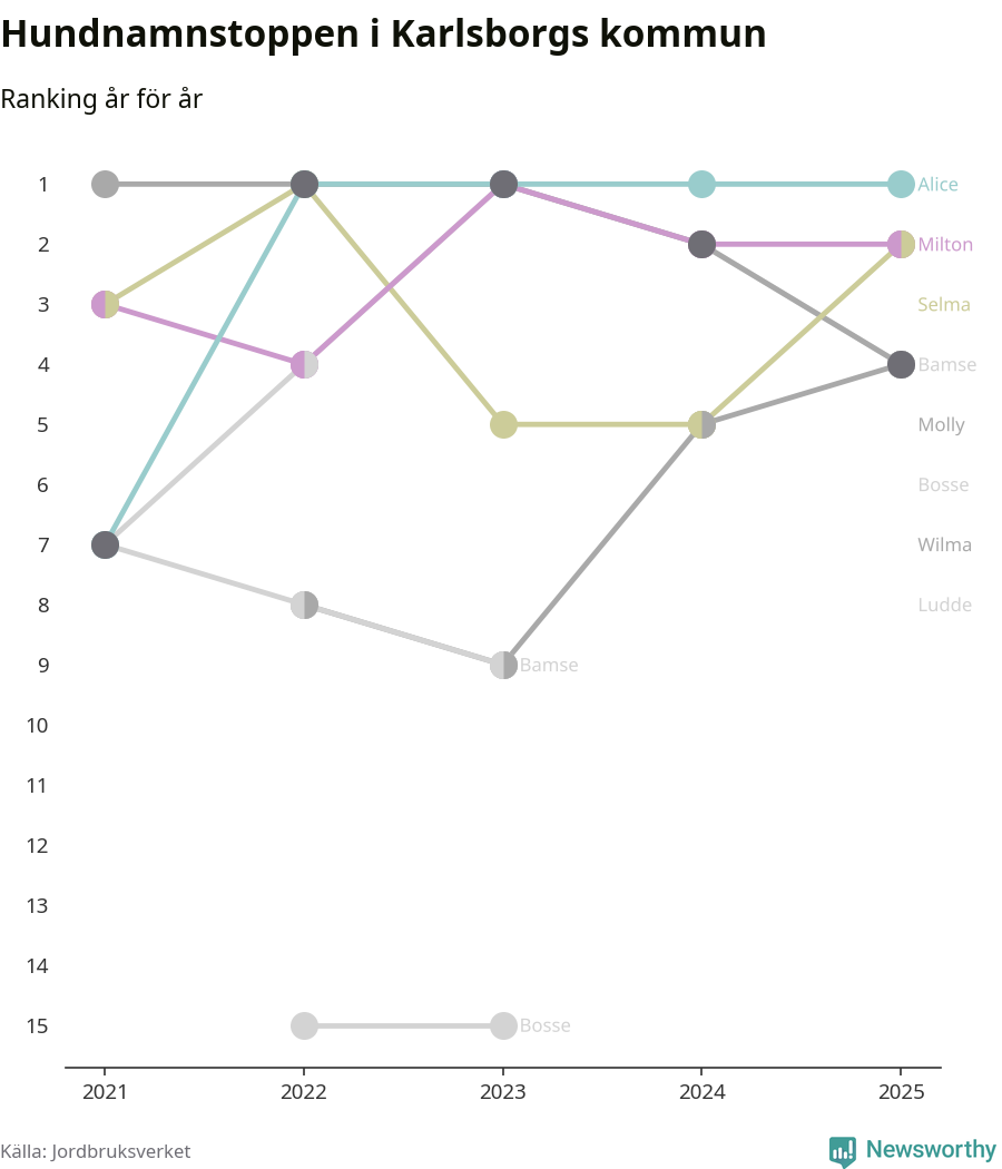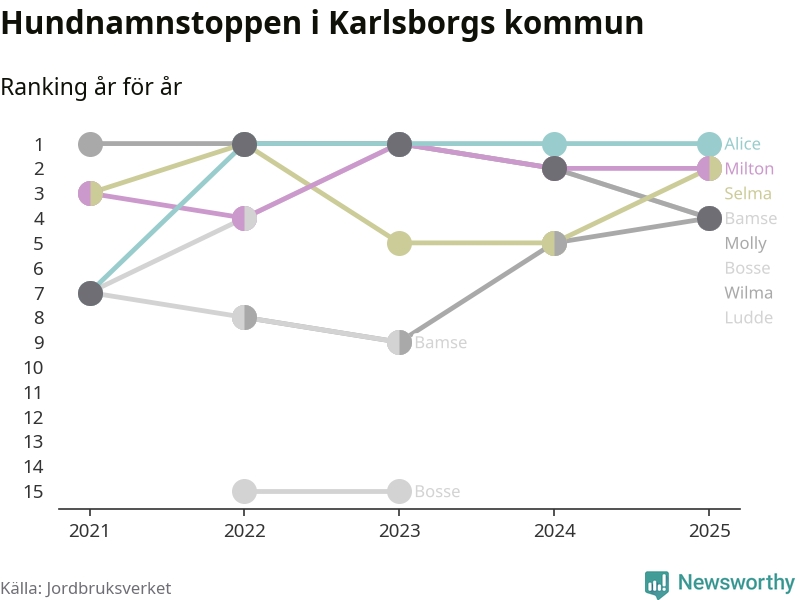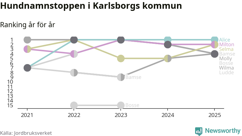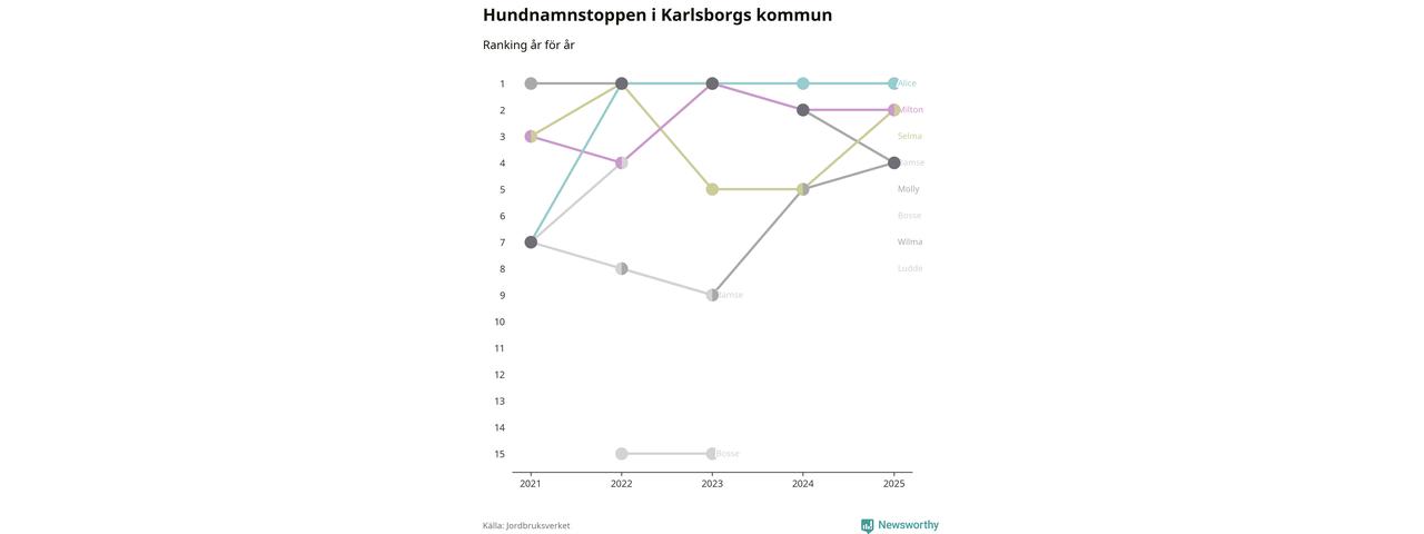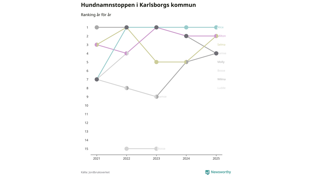Alice är, liksom i fjol, det vanligaste hundnamnet i Karlsborgs kommun, enligt färsk statistik från Jordbruksverket. Det gör Karlsborg till en av de kommuner där något av landets allra vanligaste hundnamn, Molly, Bella och Charlie, inte toppar listan.