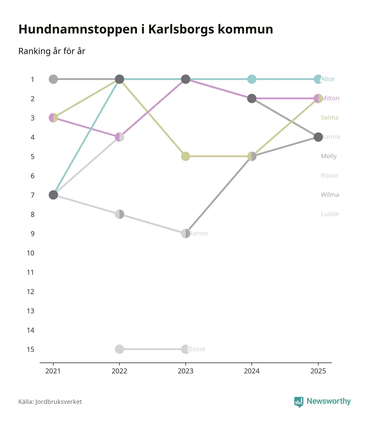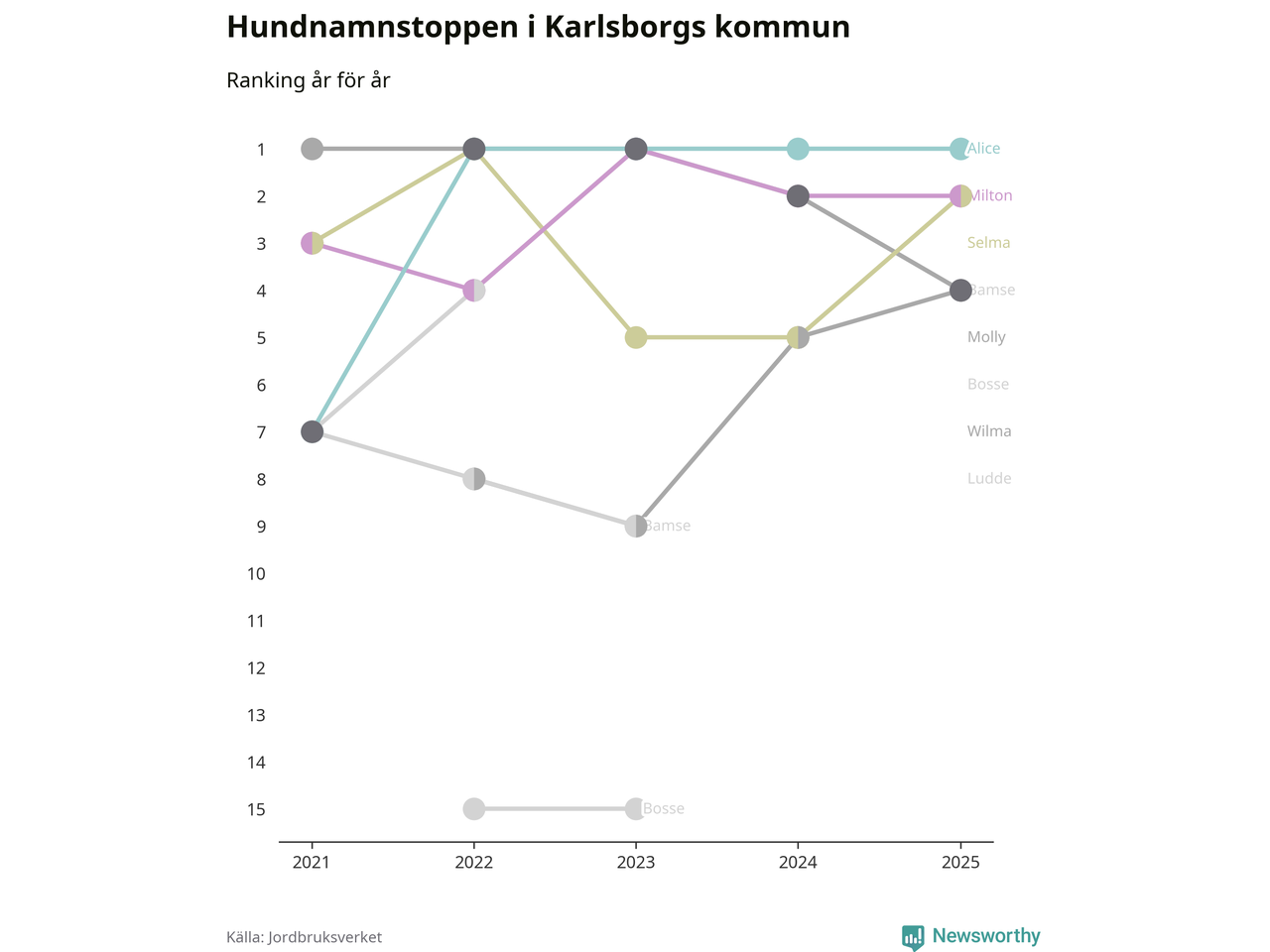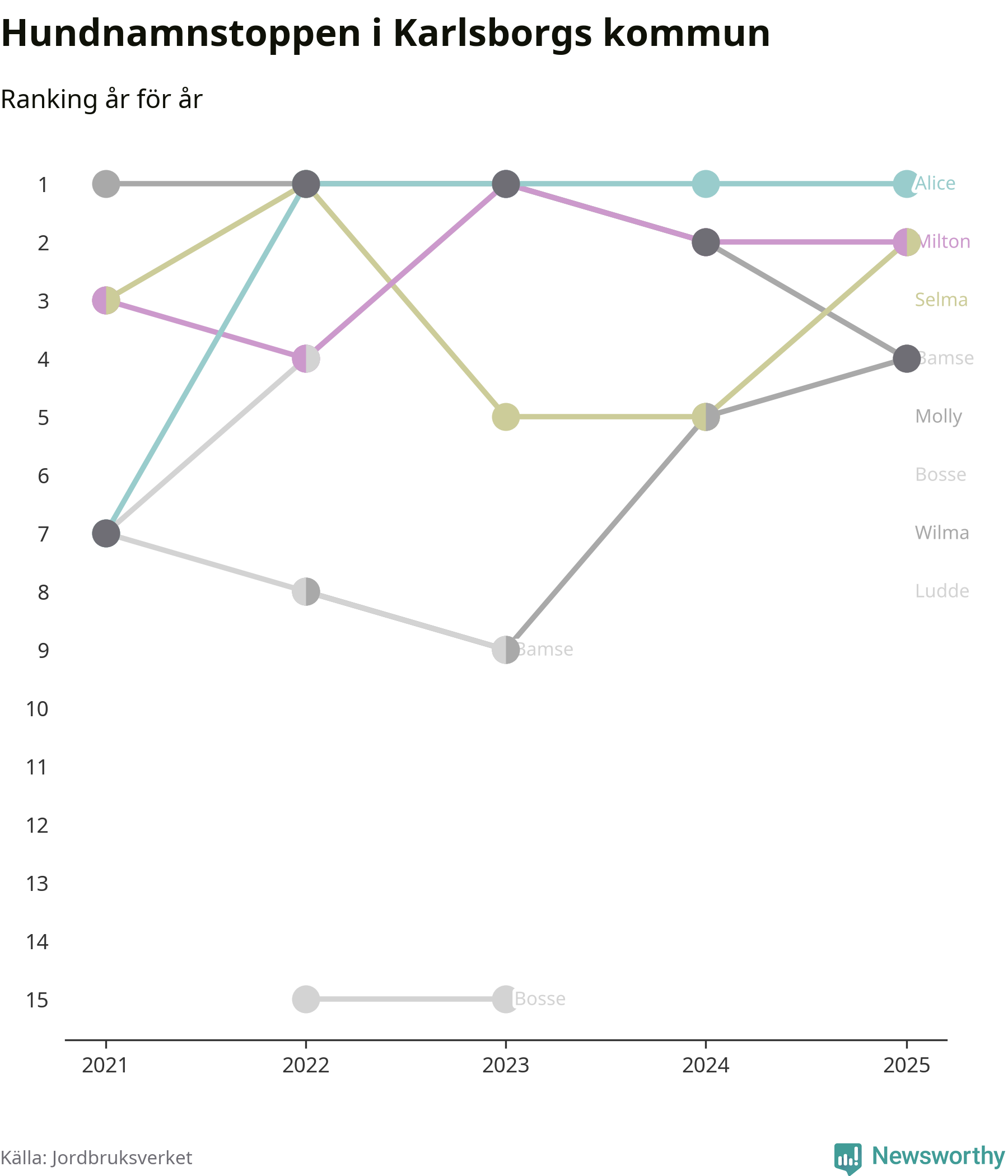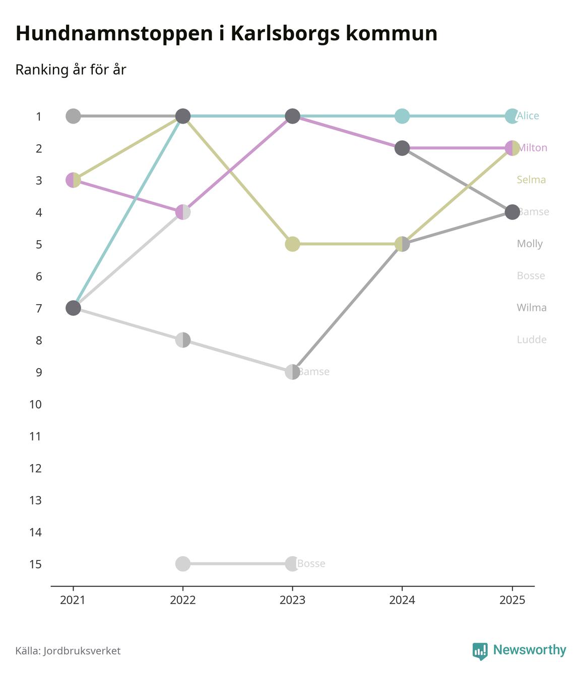 Alice är, liksom i fjol, det vanligaste hundnamnet i Karlsborgs kommun, enligt färsk statistik från Jordbruksverket. Det gör Karlsborg till en av de kommuner där något av landets allra vanligaste hundnamn, Molly, Bella och Charlie, inte toppar listan.