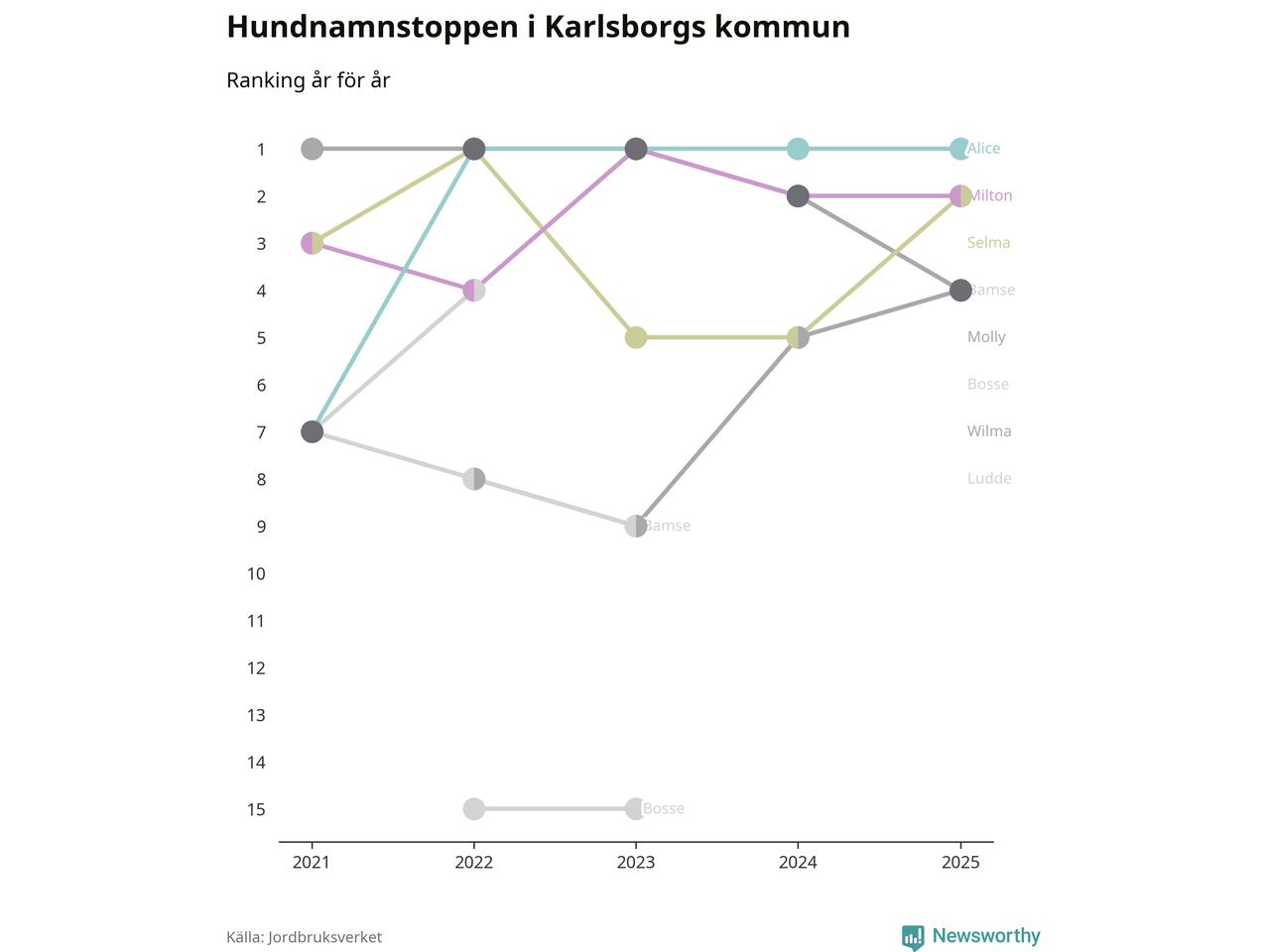 Molly är fortsatt ohotad etta bland hundnamnen i Sverige, följt av Bella och Charlie. Så har det sett ut flera år i rad, men bland Karlsborgshundarna är Alice populärast. Karlsborg är en av fyra kommuner i landet där Alice är vanligast, eller på delad förstaplats.