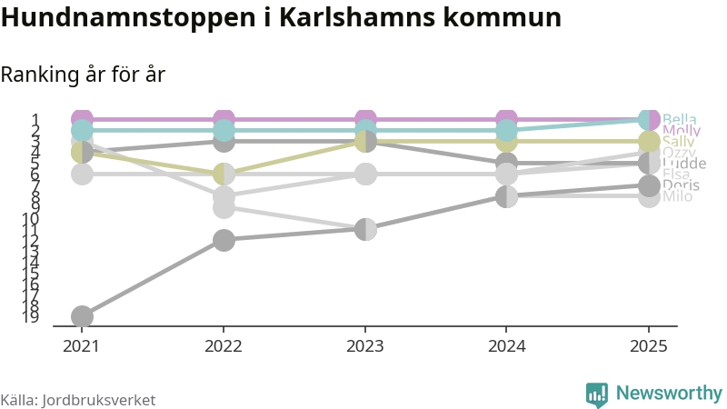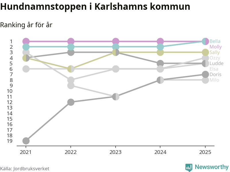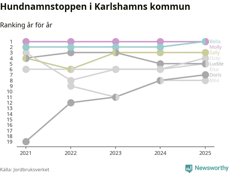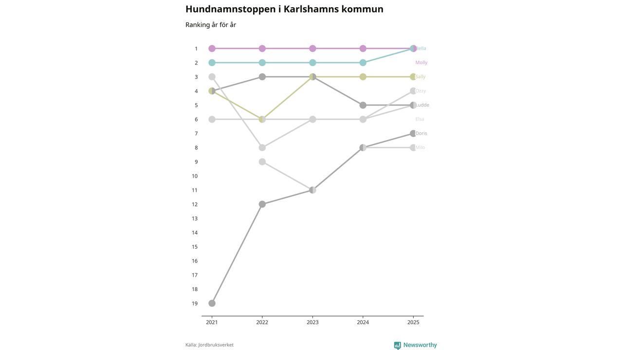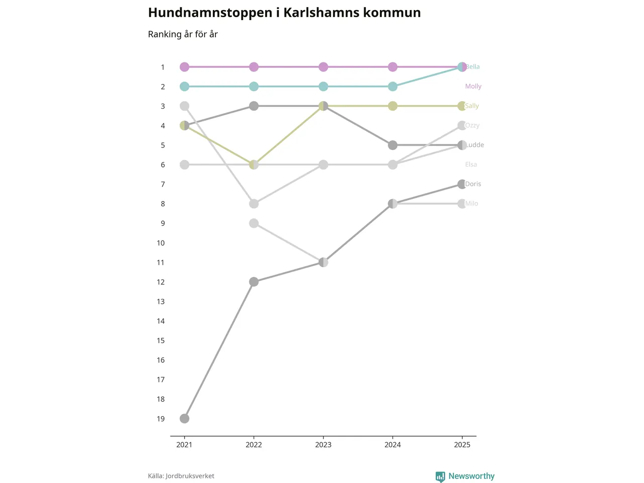 Bella utmanar Molly om förstaplatsen på topplistan över Karlshamns hundnamn, visar ny statistik från Jordbruksverkets hundregister. Namnet delar nu topplaceringen. Bella är också ett av hela landets allra populäraste namn.