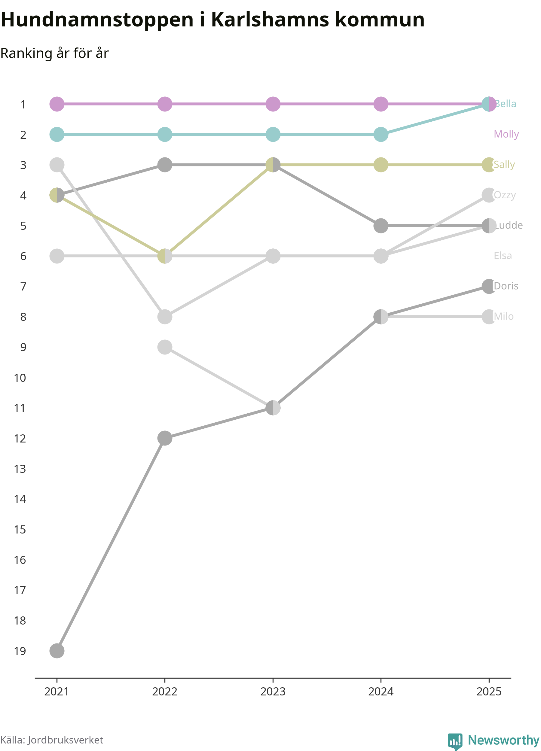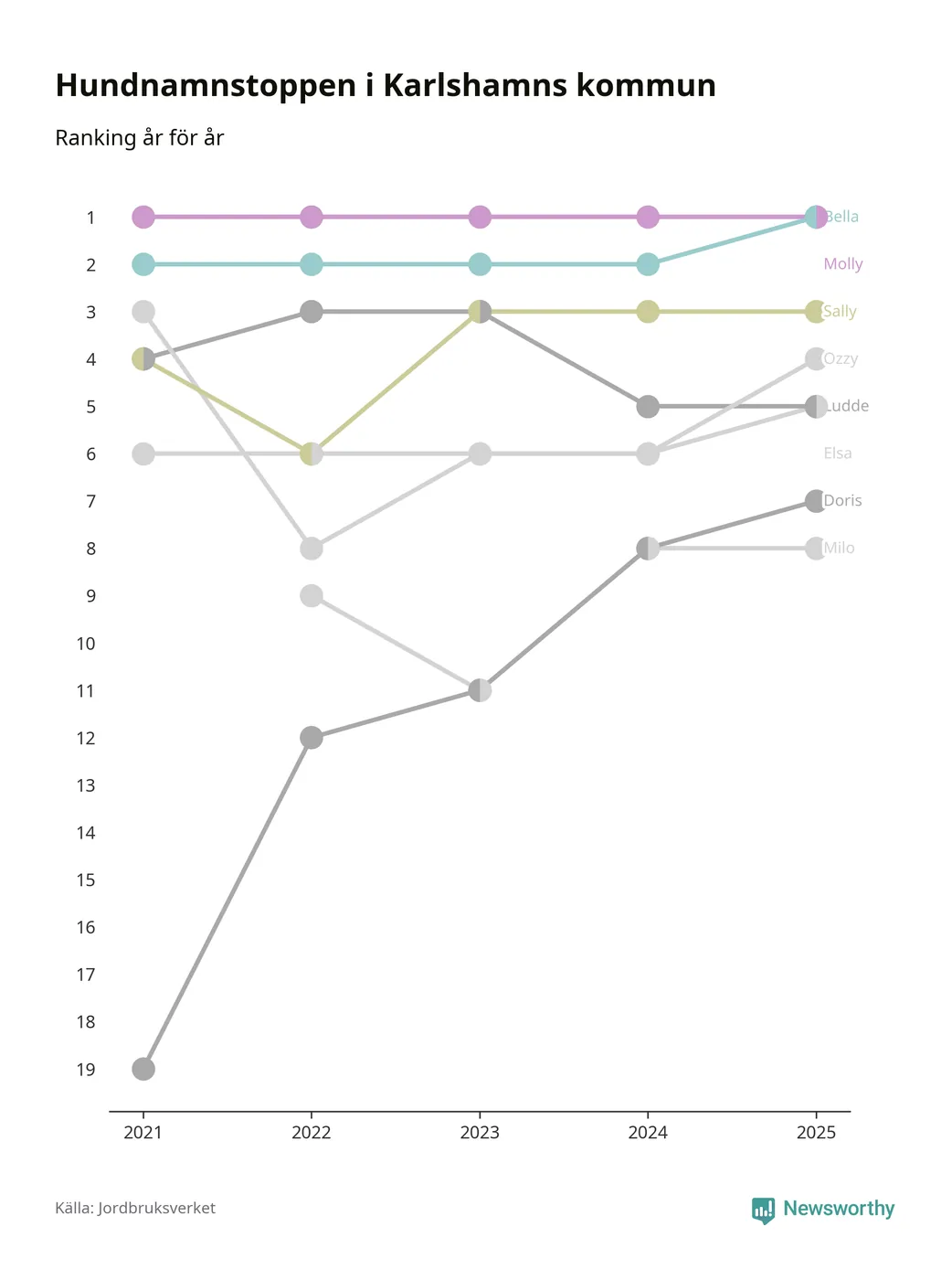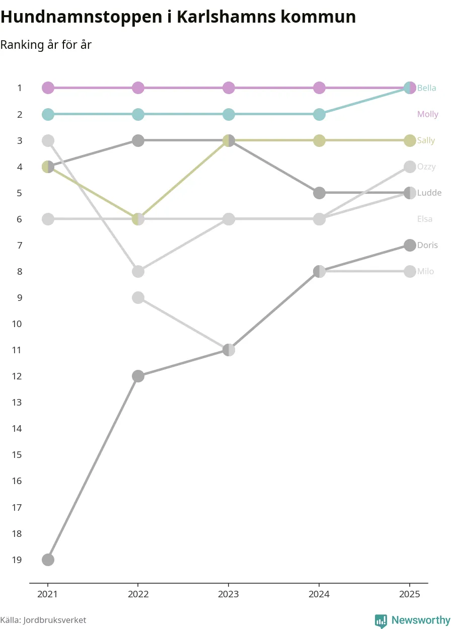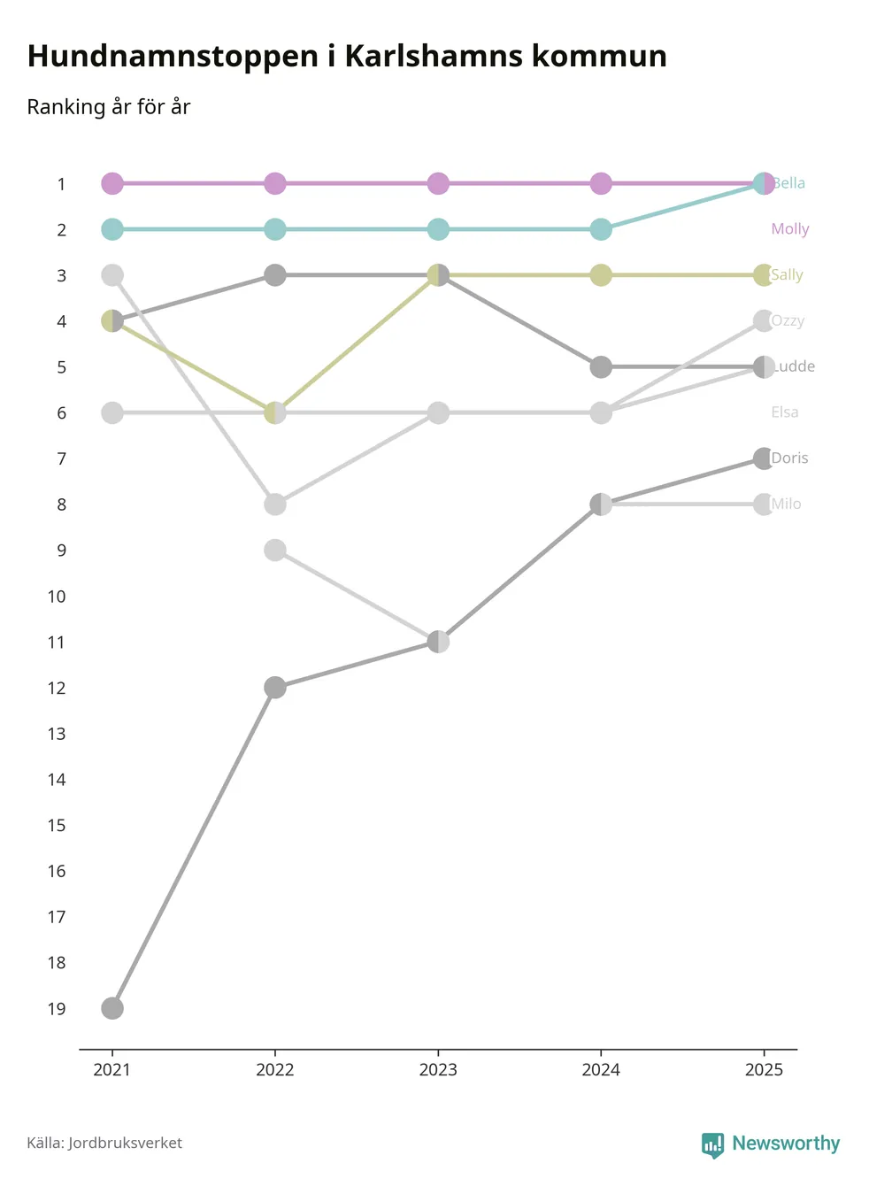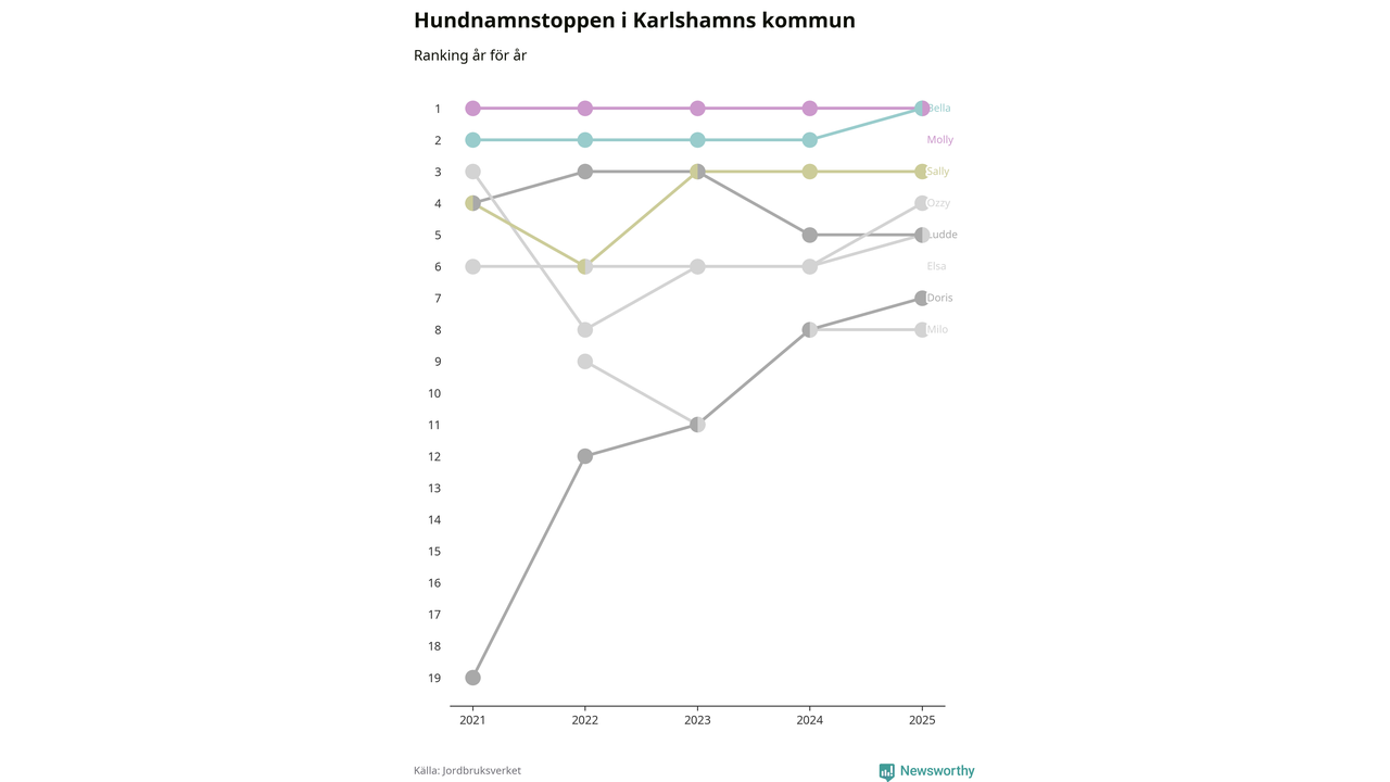 I hela landet är Molly det ohotat populäraste tilltalsnamnet för hundar sedan flera år, följt av Bella och Charlie. Något av de tre namnen toppar listan i 243 av 290 kommuner, och de har varit de vanligaste namnen sedan åtminstone 2018. Men det fjärde populäraste namnet, Doris, knappade in på ledartrion och kommer snart kunna utmana Charlie om tredjeplatsen, om trenden håller i sig.