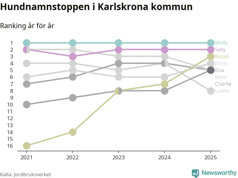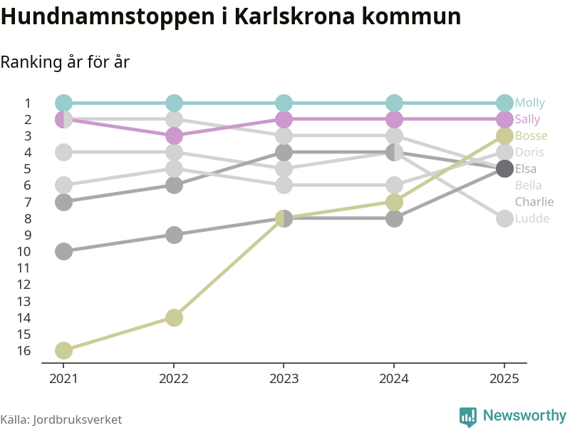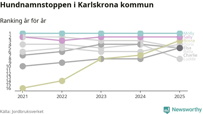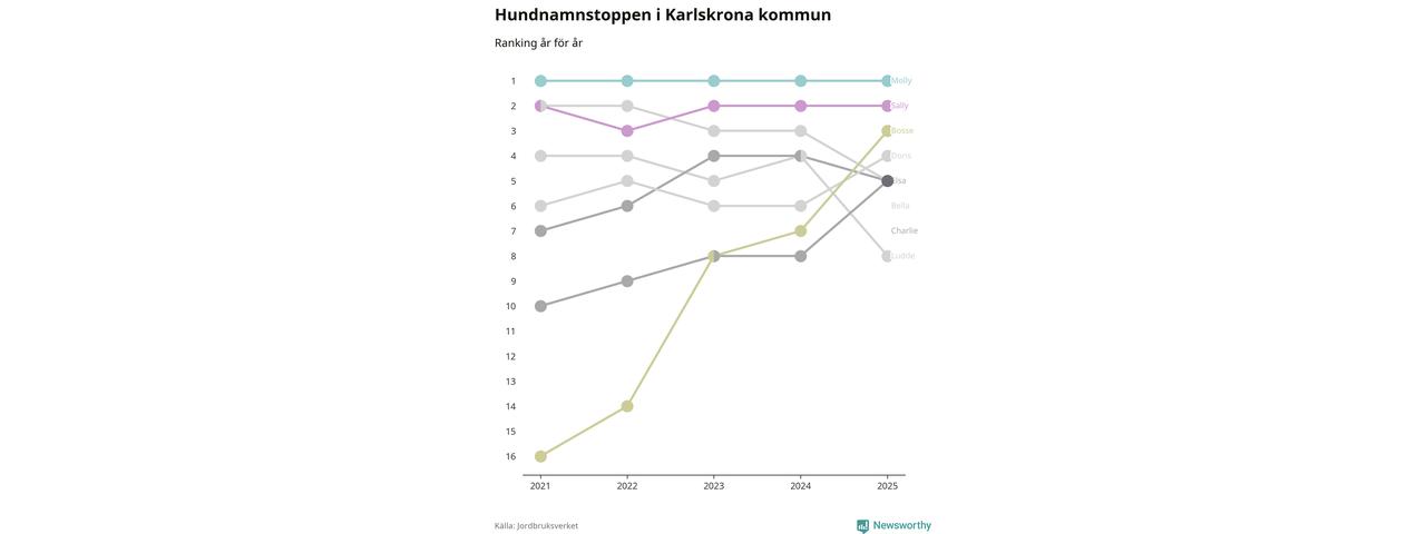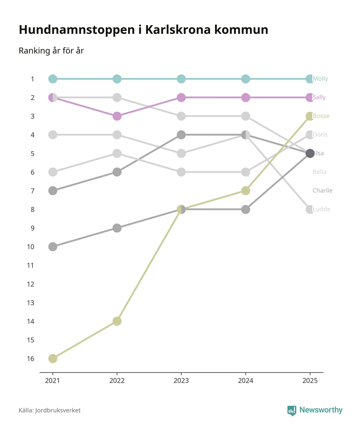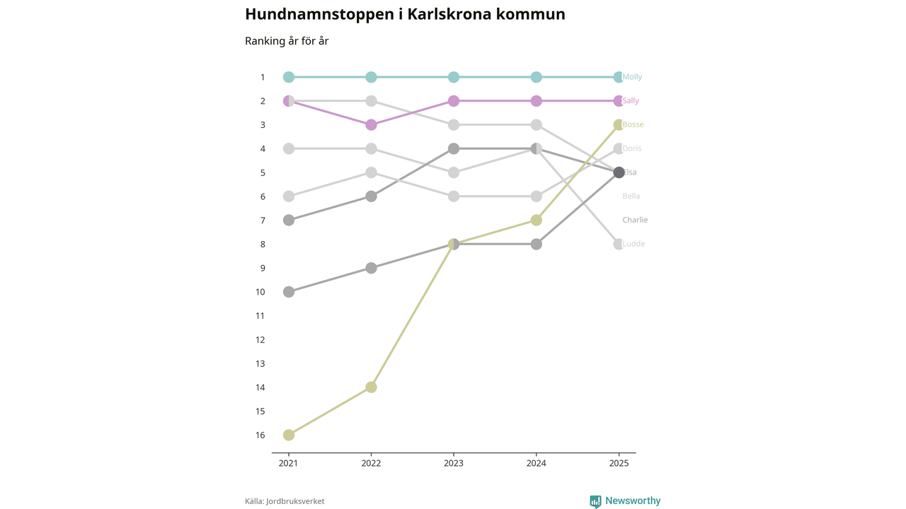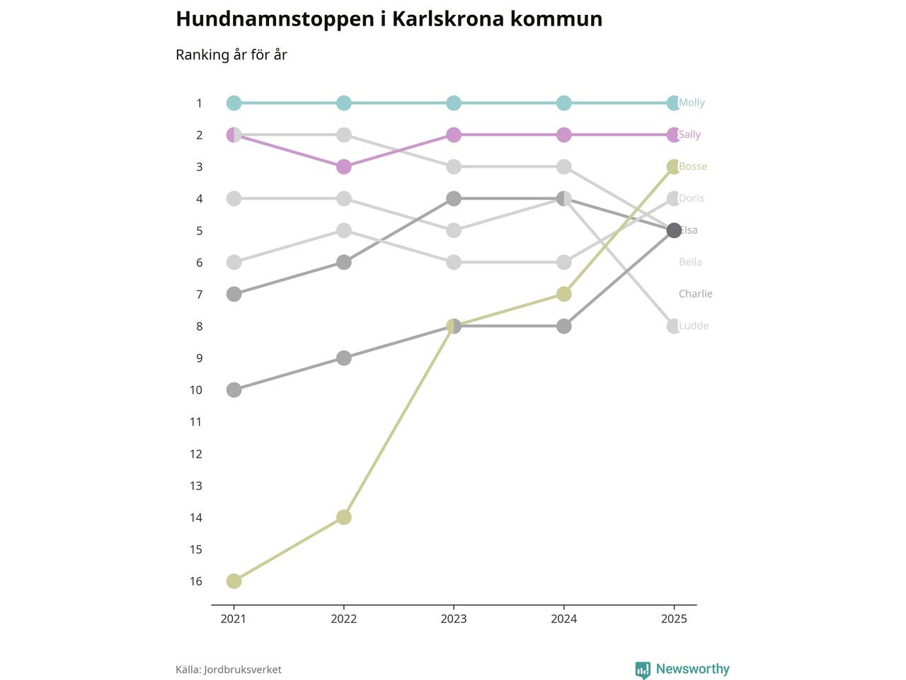 Molly toppar hundnamnsligan i Karlskrona kommun, precis som i landet som helhet. Det visar färsk statistik från Jordbruksverket. Här finns hela topplistan för kommunen.