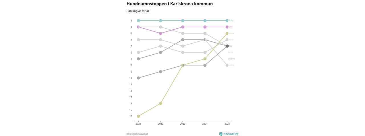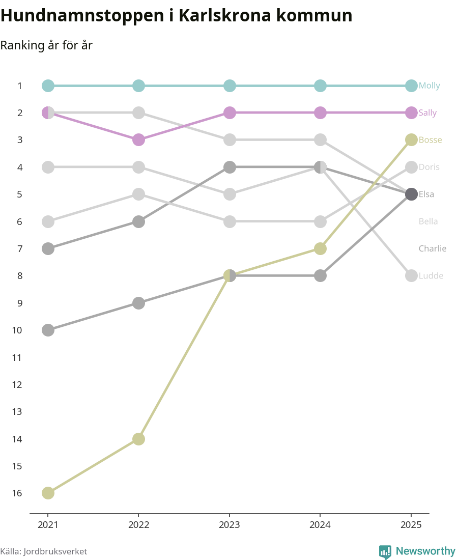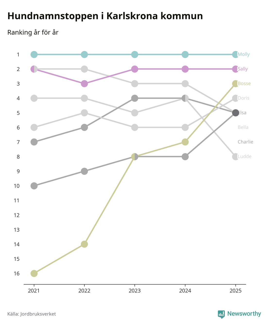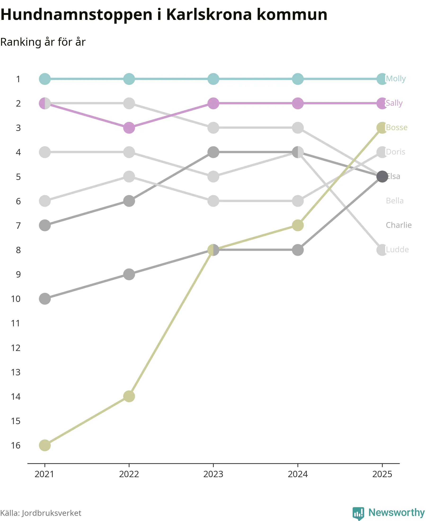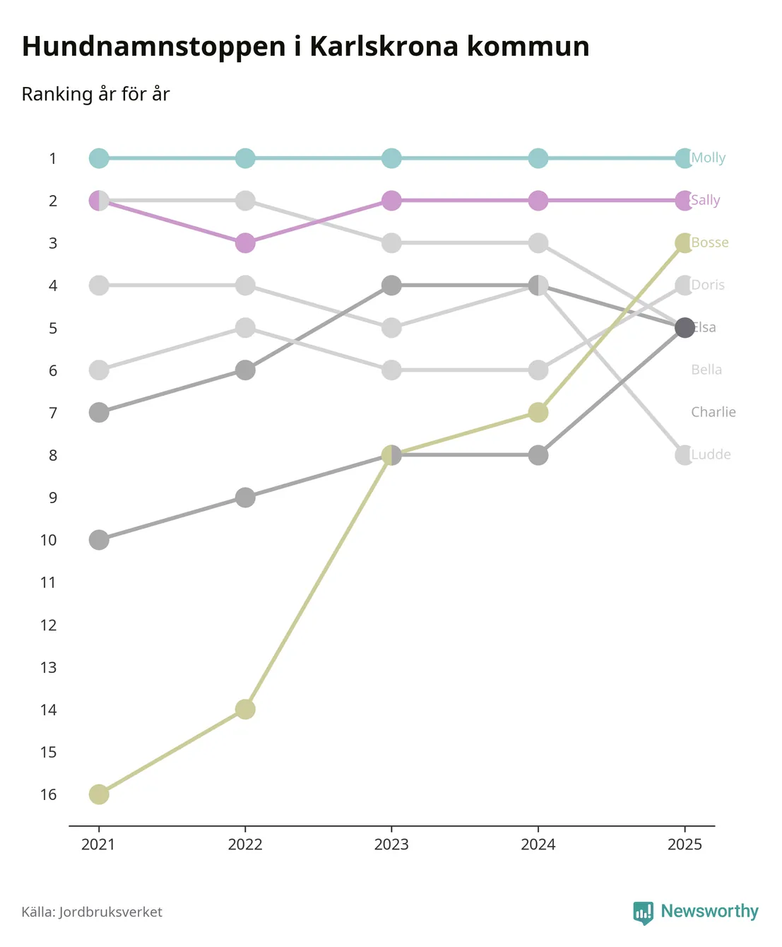 Molly toppar hundnamnsligan i Karlskrona kommun, precis som i landet som helhet. Det visar färsk statistik från Jordbruksverket. Här finns hela topplistan för kommunen.