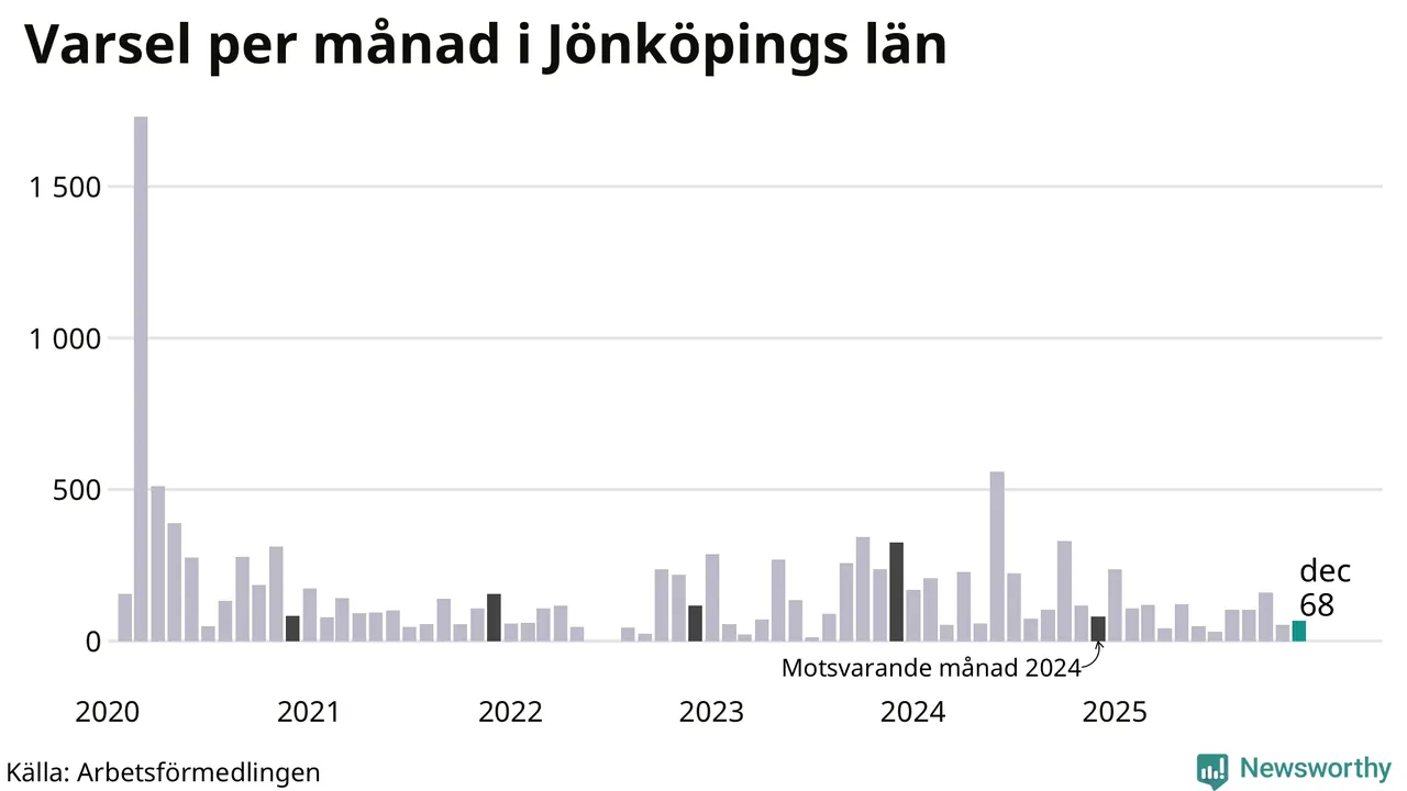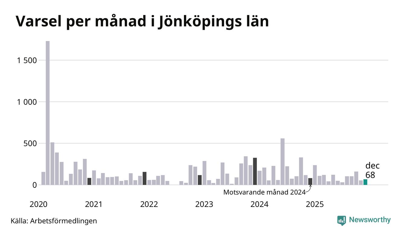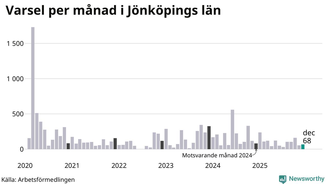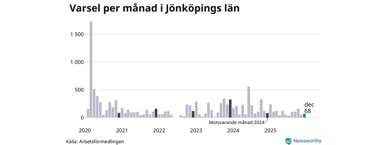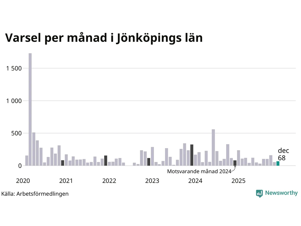 68 personer varslades om uppsägning i Jönköpings län under december 2025. Det är 15 fler än i november. För ett år sedan var antalet varsel 81 i länet. Sett över de tre senaste månaderna har totalt 281 varsel rapporterats i Jönköpings län, vilket är 246 färre än motsvarande period 2024. I början av pandemin, i mars 2020, varslades som mest 1 729 personer under en månad i Jönköpings län.