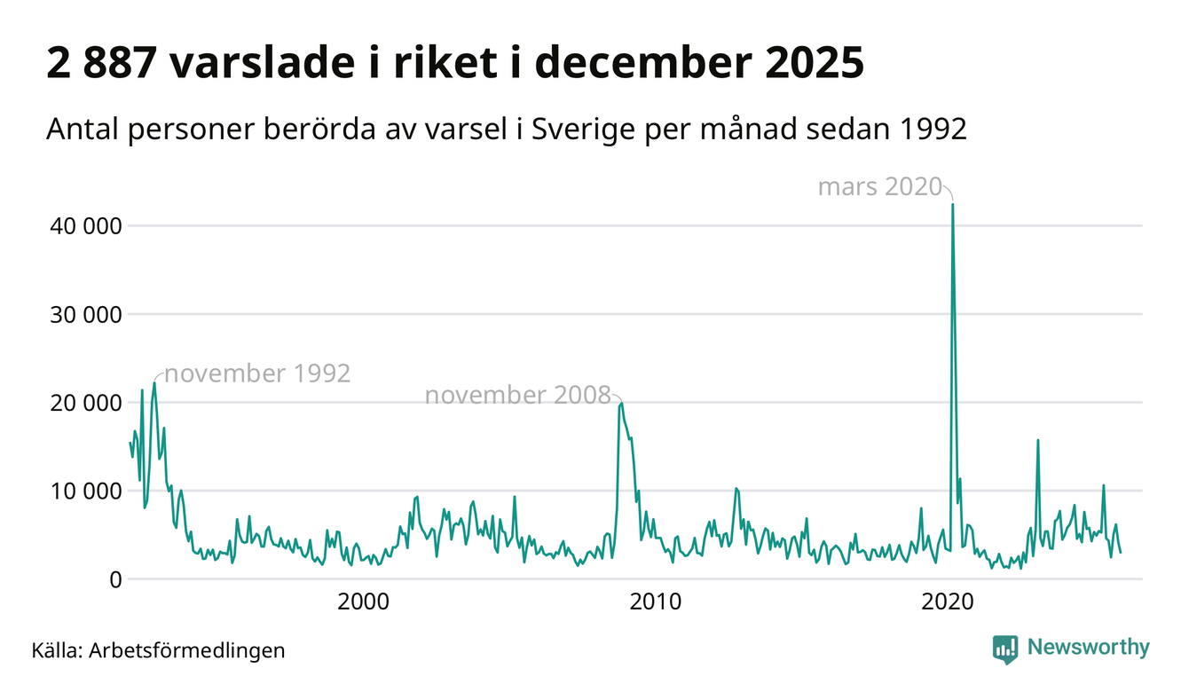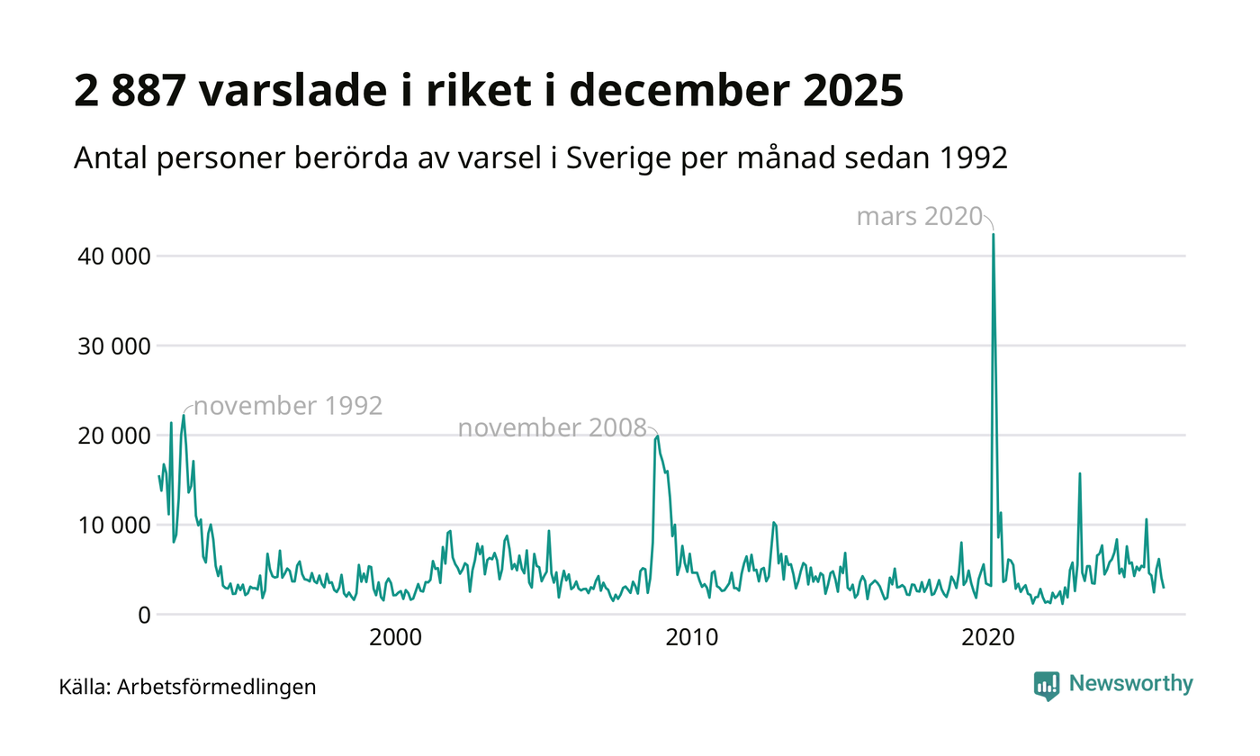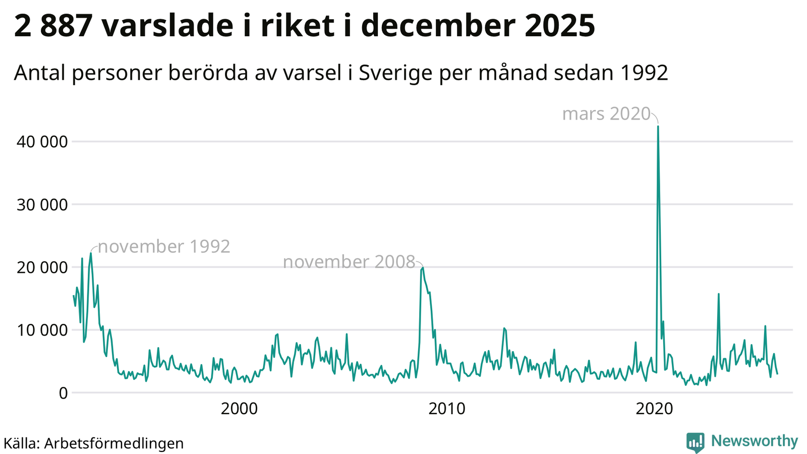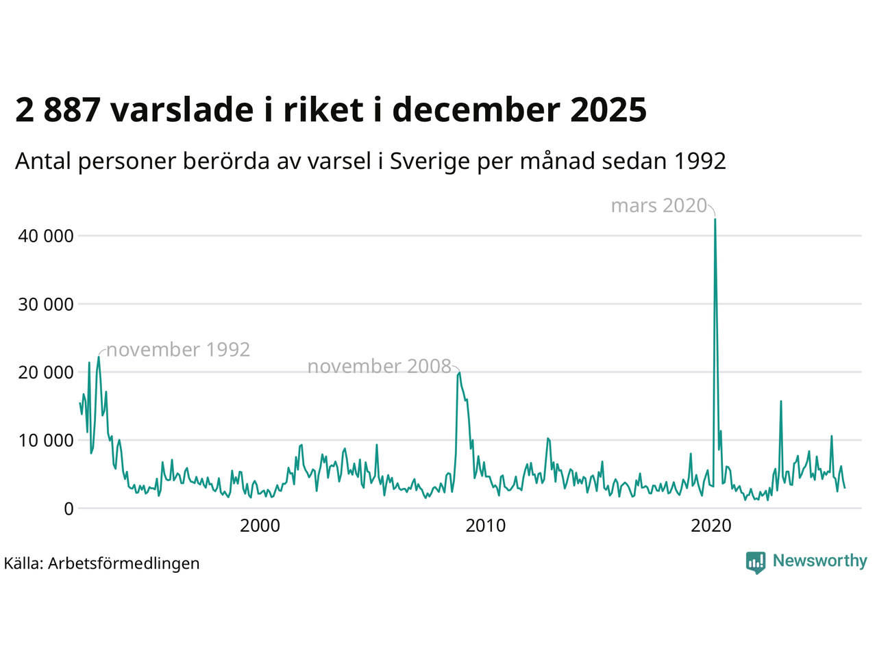 I hela riket varslades 2 887 personer under december 2025, vilket är omkring 1 200 färre än i november och omkring 1 400 färre än i december 2024. Under de tre senaste månaderna har totalt omkring 13 200 varslats om uppsägning i Sverige. Det är omkring 2 600 färre än motsvarande period 2024.