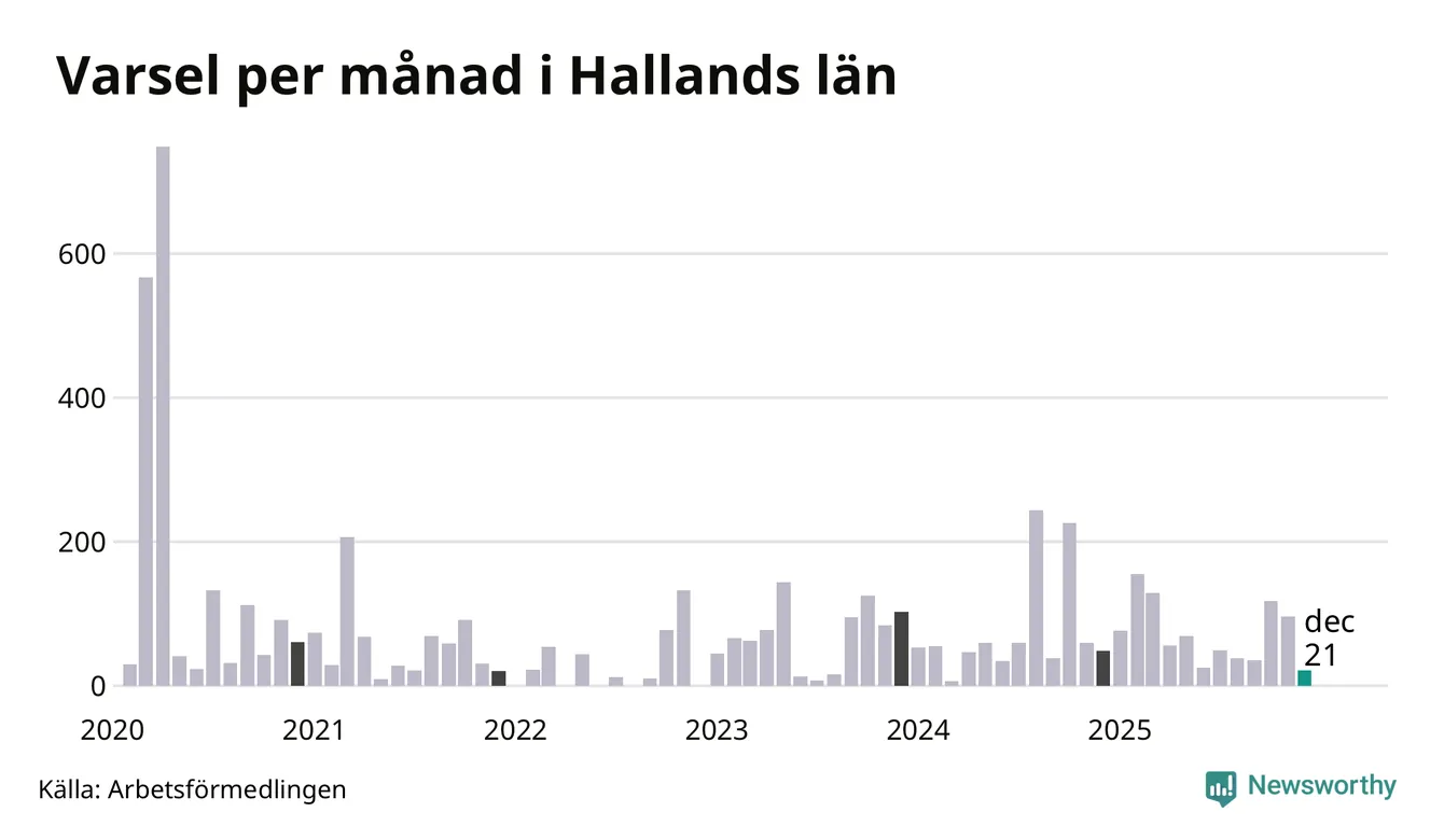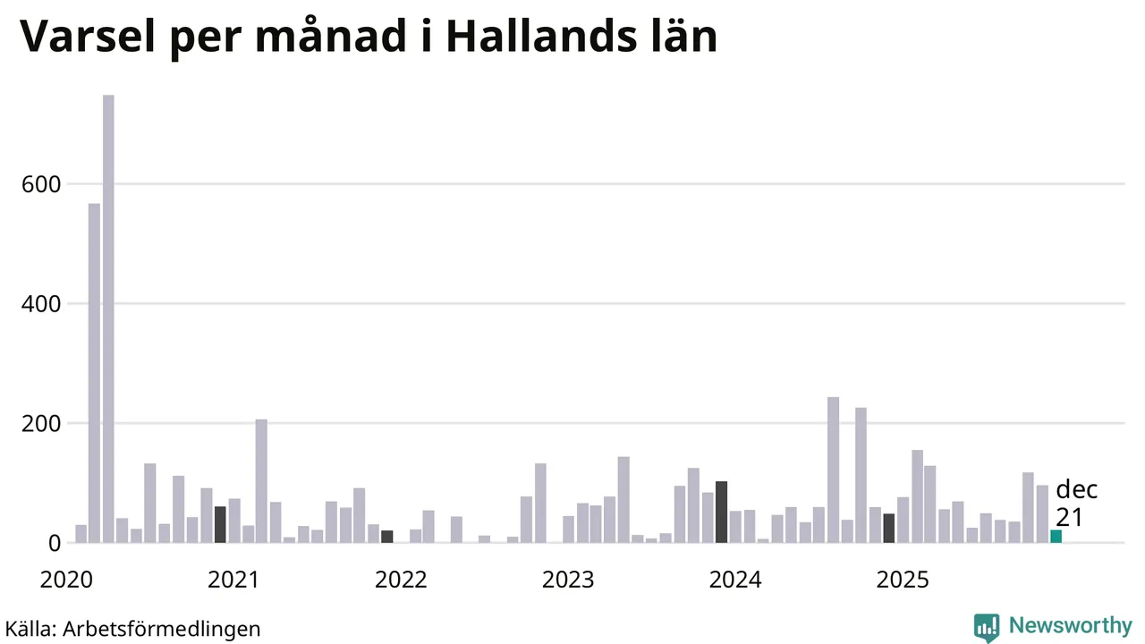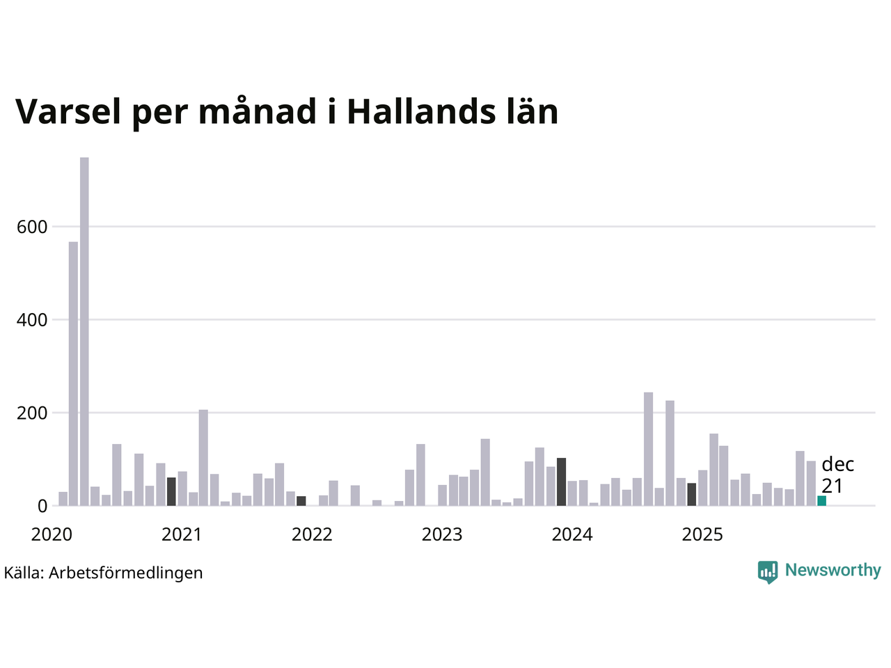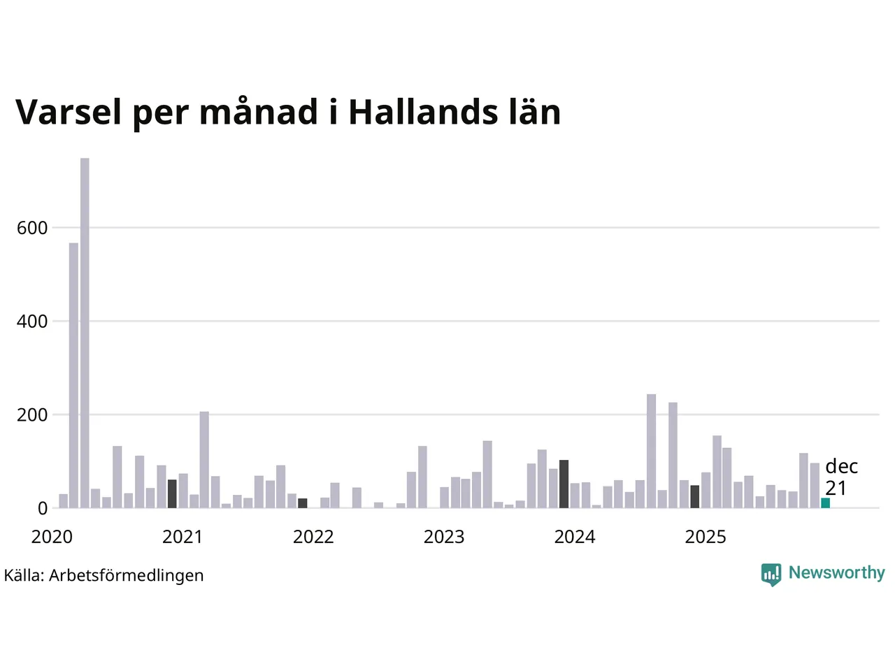 21 personer varslades om uppsägning i Halland under december 2025. Det är 75 färre än i november och den lägsta siffran sedan mars 2024. Då lades sex varsel i Halland. Sett över de tre senaste månaderna har totalt 235 varsel rapporterats i Halland, vilket är 99 färre än motsvarande period 2024. I början av pandemin, i april 2020, varslades som mest 748 personer under en månad i Halland.