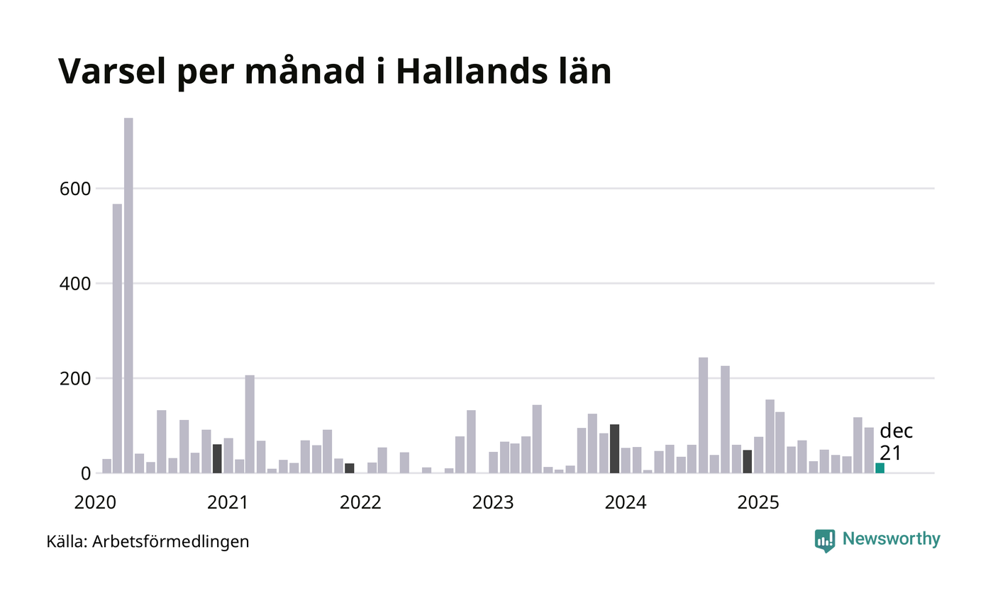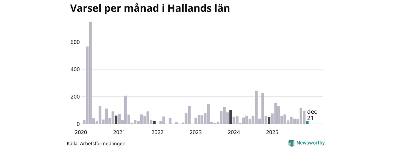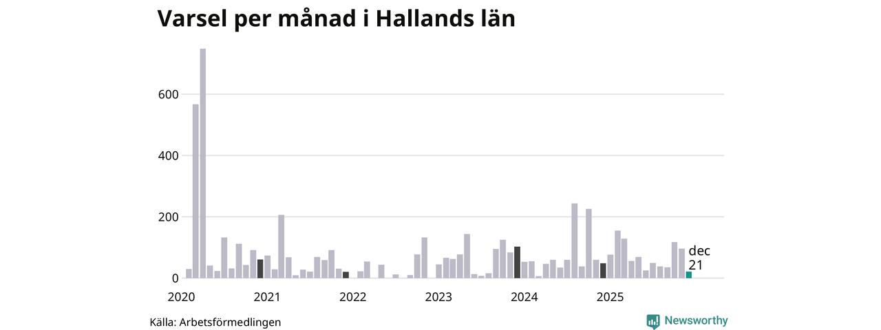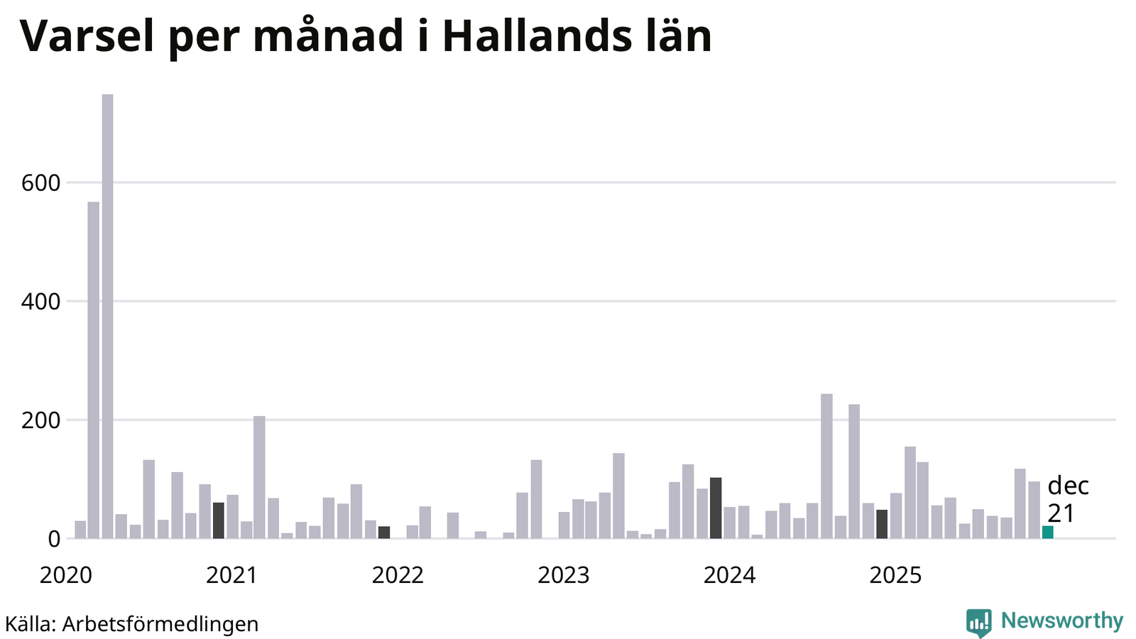 21 personer varslades om uppsägning i Halland under december 2025. Det är 75 färre än i november och den lägsta siffran sedan mars 2024. Då lades sex varsel i Halland. Sett över de tre senaste månaderna har totalt 235 varsel rapporterats i Halland, vilket är 99 färre än motsvarande period 2024. I början av pandemin, i april 2020, varslades som mest 748 personer under en månad i Halland.