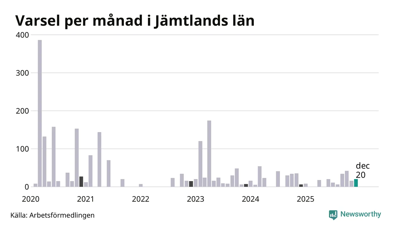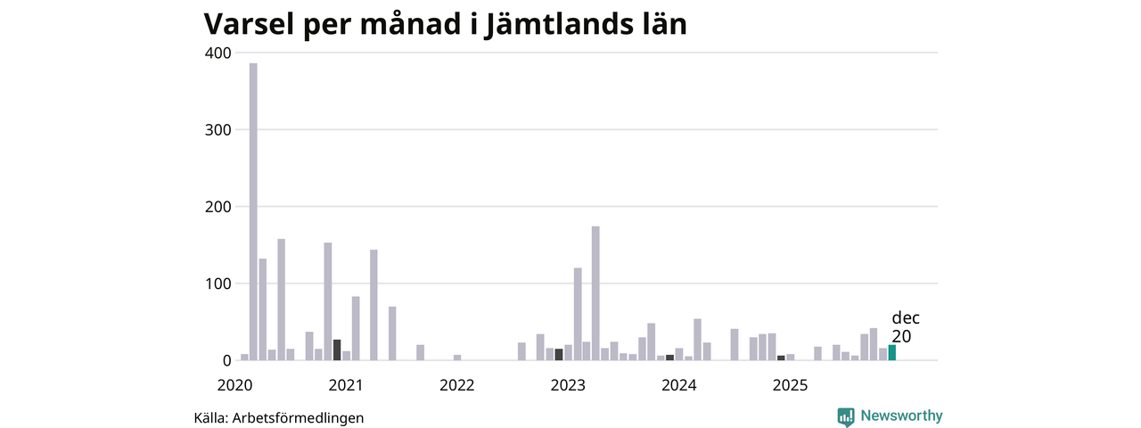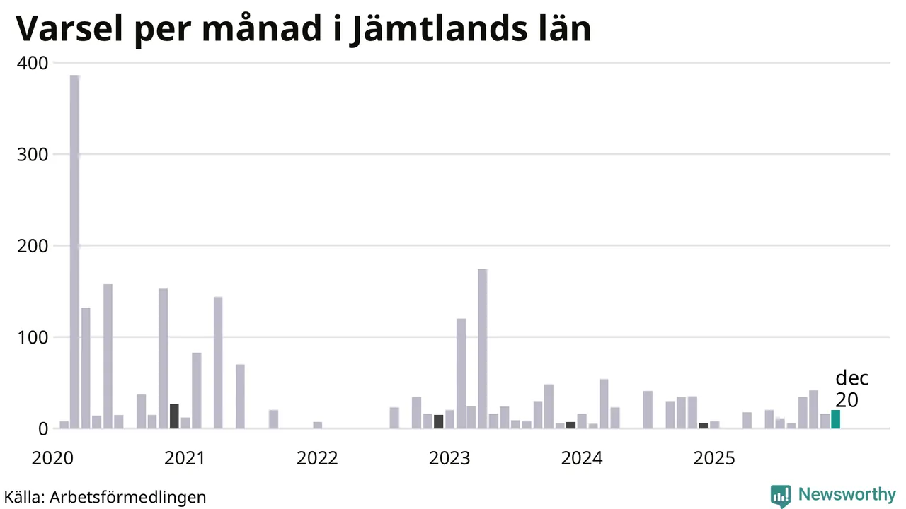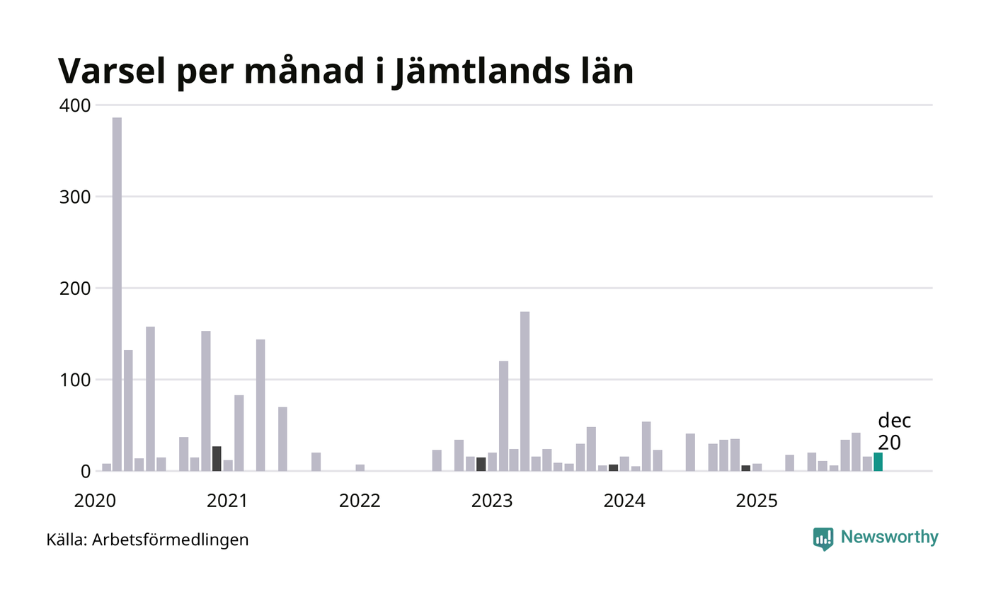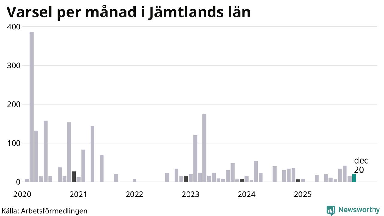 20 personer varslades om uppsägning i Jämtland under december 2025. Det är fyra fler än i november. För ett år sedan var antalet varsel sex i länet. Sett över de tre senaste månaderna har totalt 78 varsel rapporterats i Jämtland, vilket är tre fler än motsvarande period 2024. I början av pandemin, i mars 2020, varslades som mest 386 personer under en månad i Jämtland.
