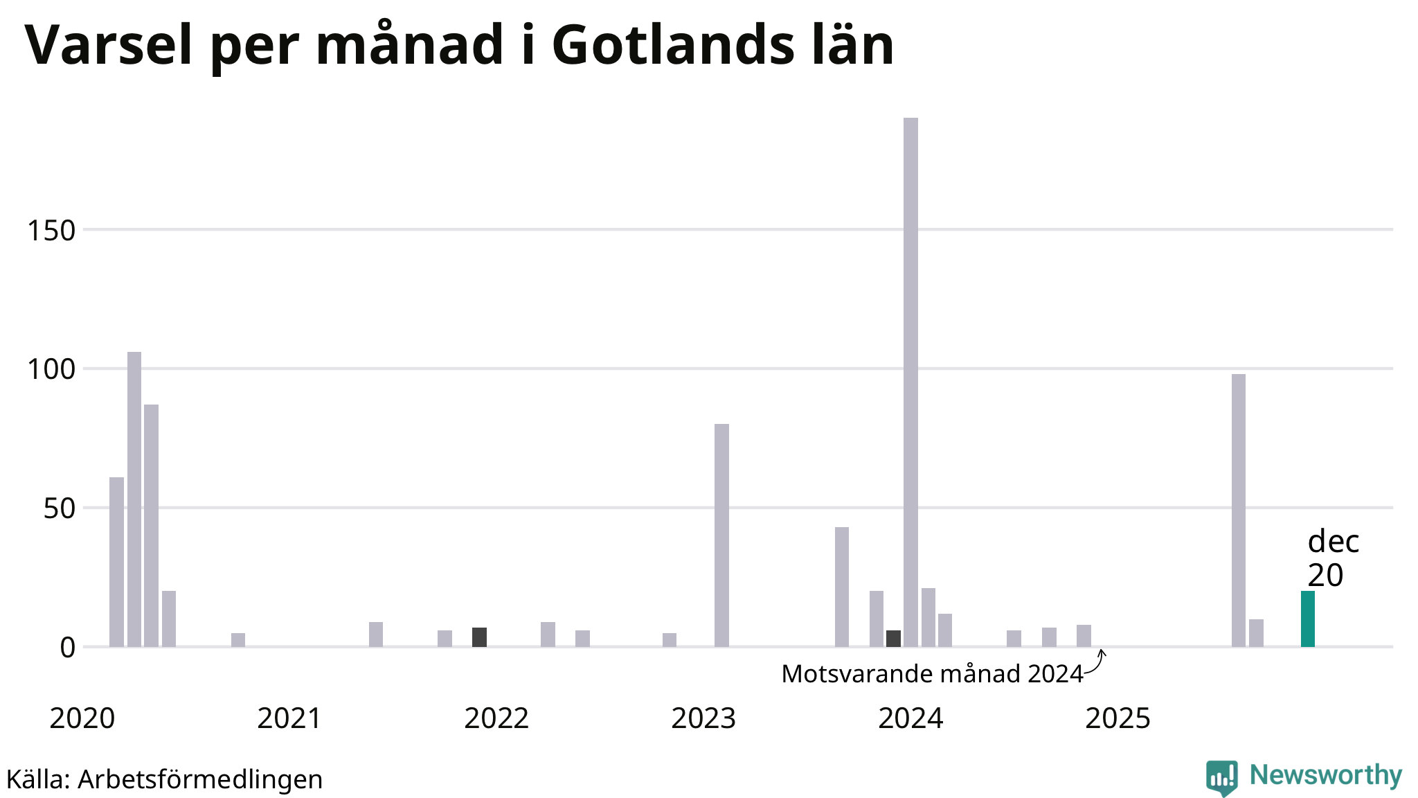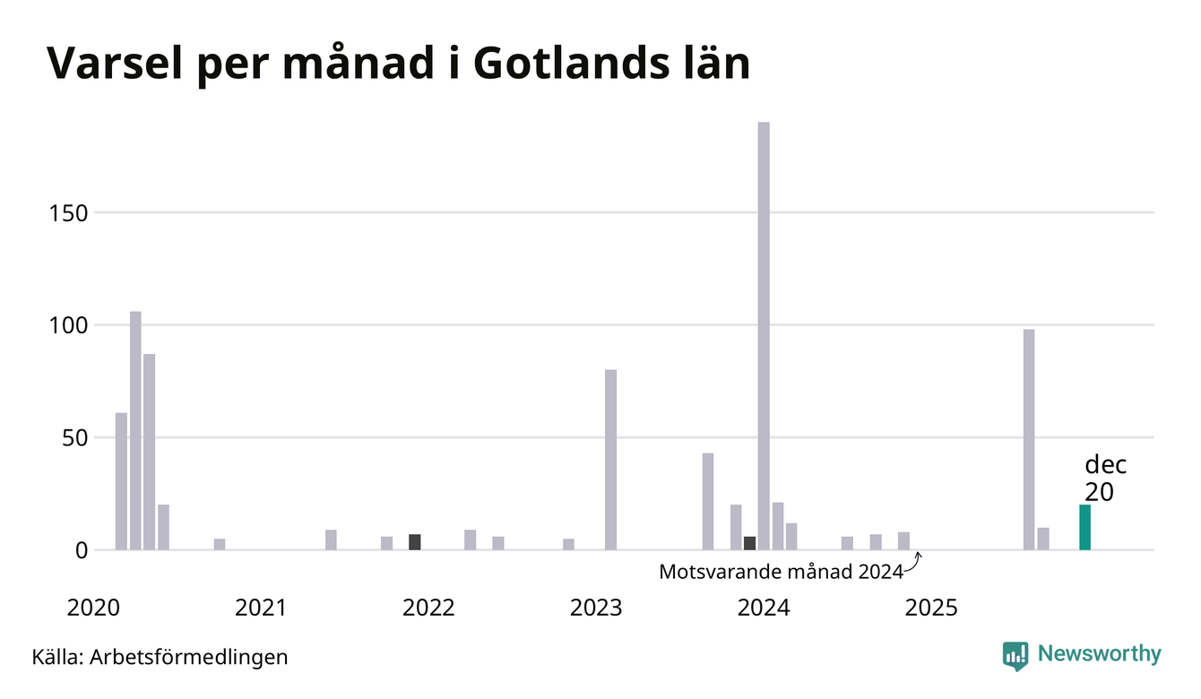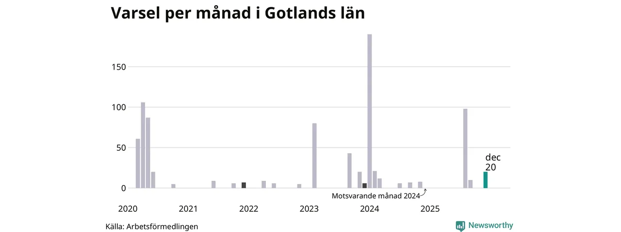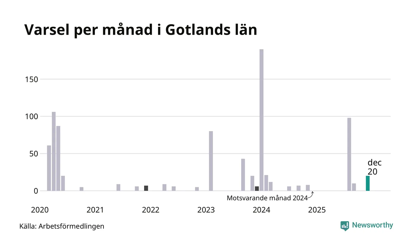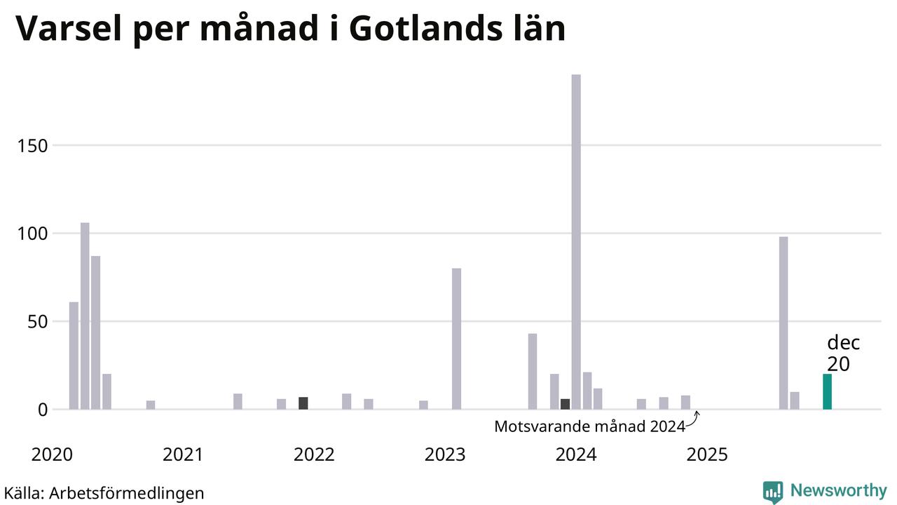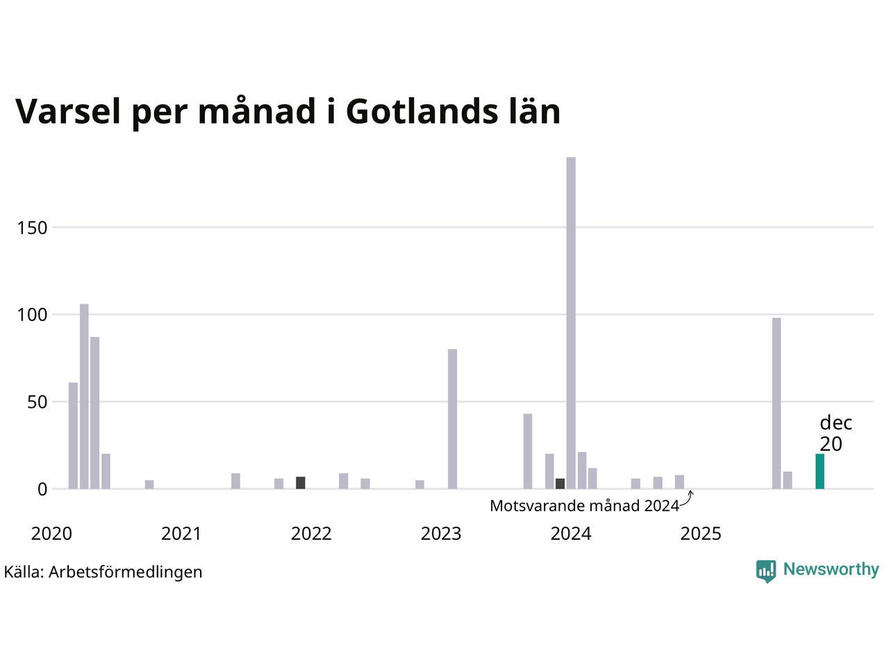 Efter två månader utan rapporterade varsel i länet varslades 20 personer på Gotland under december 2025. Sett över de tre senaste månaderna har totalt 20 varsel rapporterats på Gotland, vilket är nästan tre gånger så många som under motsvarande period 2024. I början av pandemin, i april 2020, varslades som mest 106 personer under en månad på Gotland.