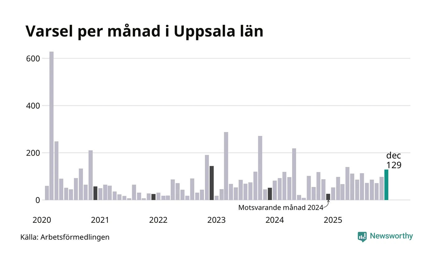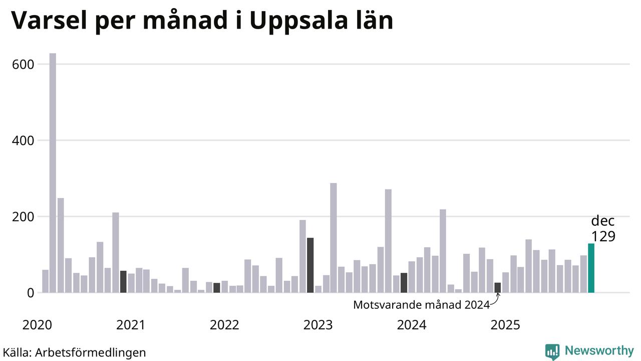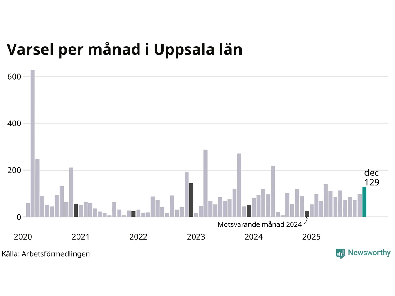 129 personer varslades om uppsägning i Uppsala län under december 2025. Det är 31 fler än i november. För ett år sedan var antalet varsel 26 i länet. Sett över de tre senaste månaderna har totalt 298 varsel rapporterats i Uppsala län, vilket är 66 fler än motsvarande period 2024. I början av pandemin, i mars 2020, varslades som mest 628 personer under en månad i Uppsala län.