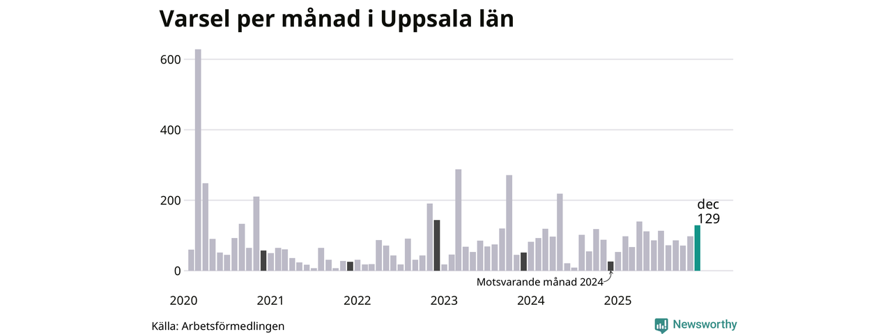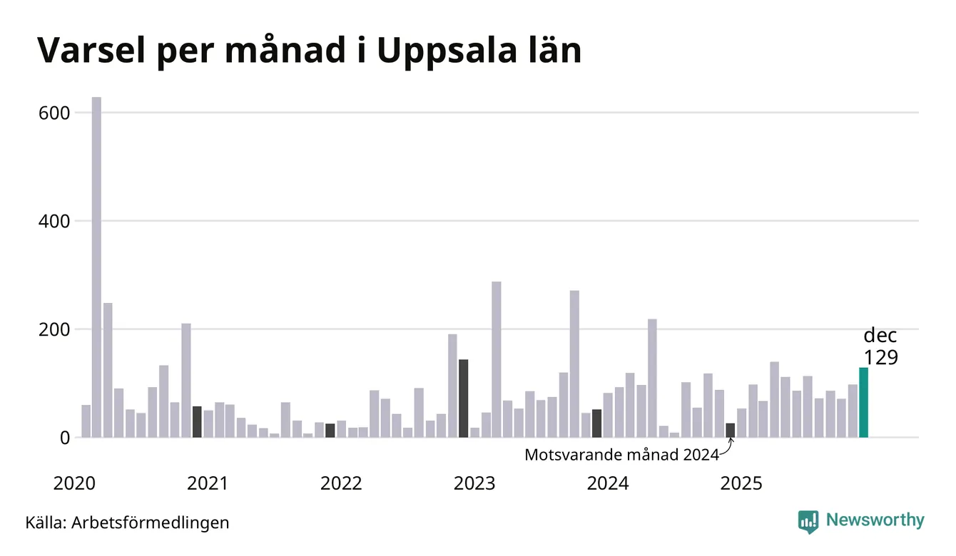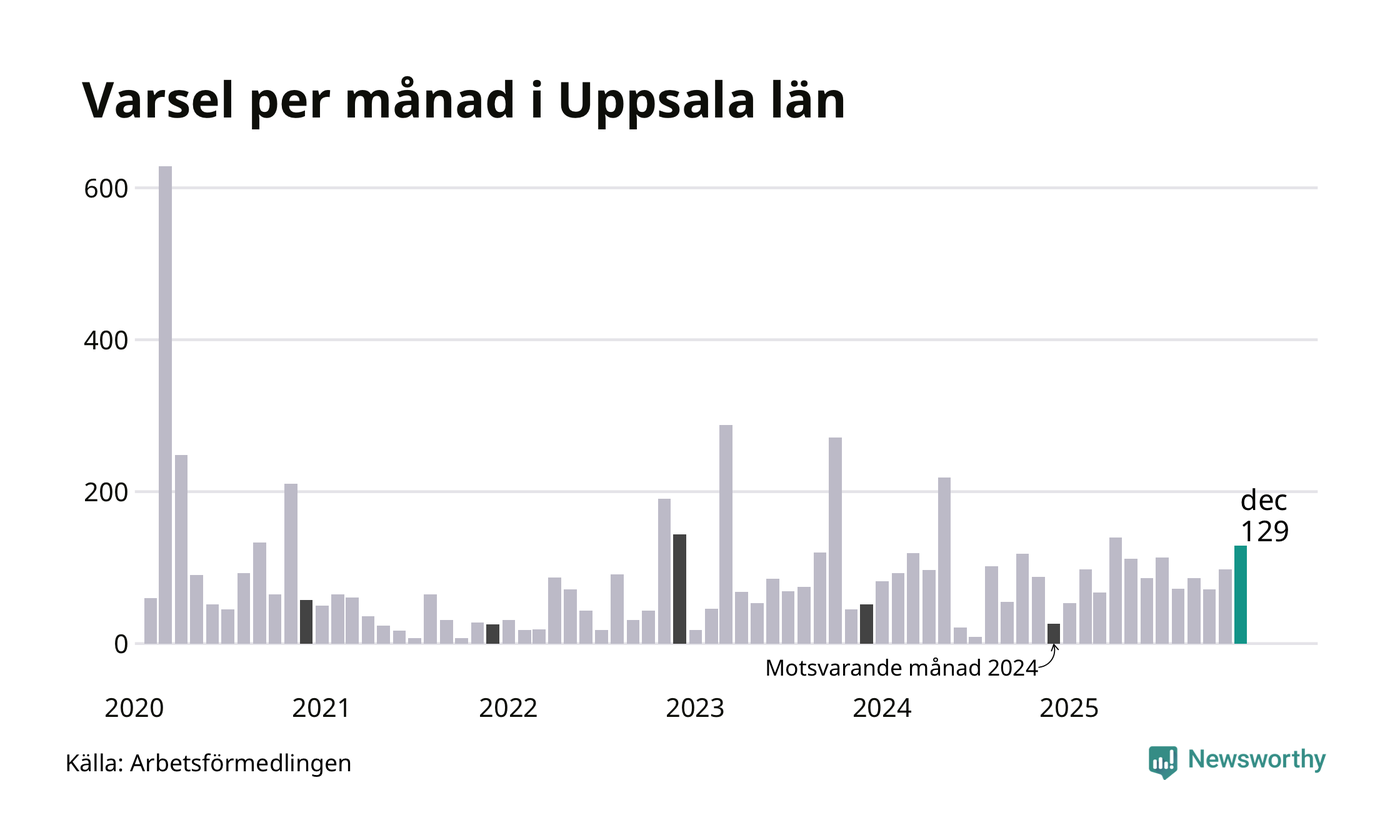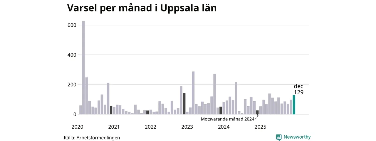 129 personer varslades om uppsägning i Uppsala län under december 2025. Det är 31 fler än i november. För ett år sedan var antalet varsel 26 i länet. Sett över de tre senaste månaderna har totalt 298 varsel rapporterats i Uppsala län, vilket är 66 fler än motsvarande period 2024. I början av pandemin, i mars 2020, varslades som mest 628 personer under en månad i Uppsala län.