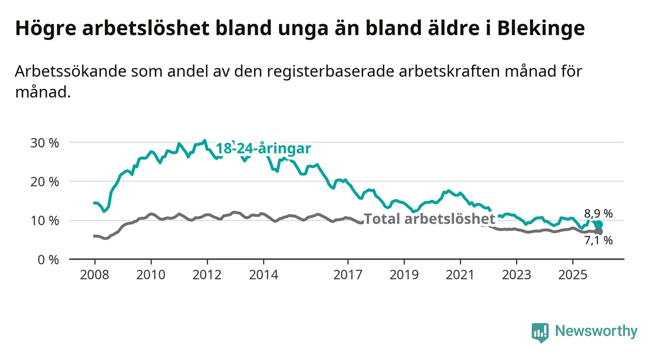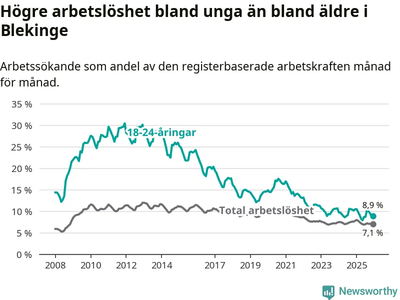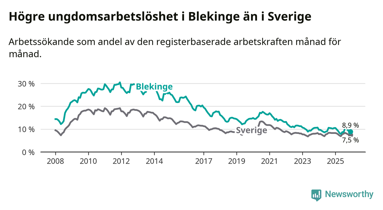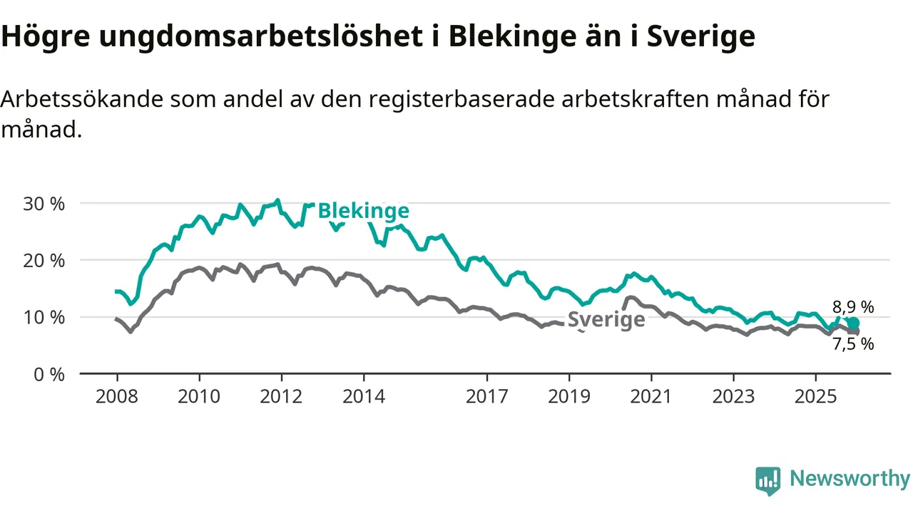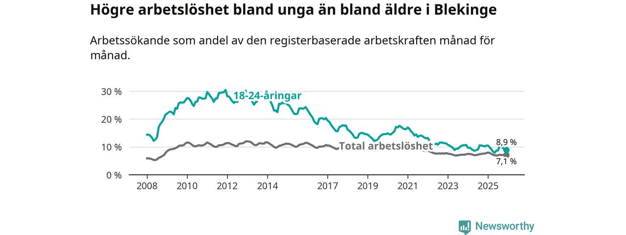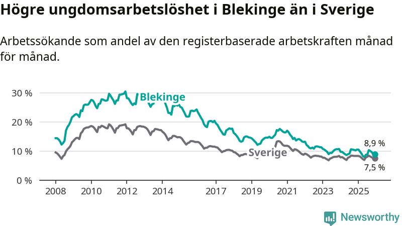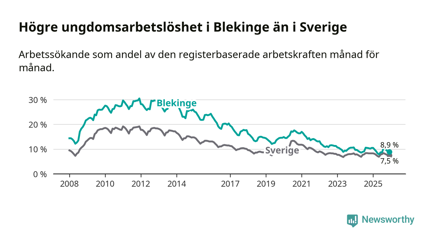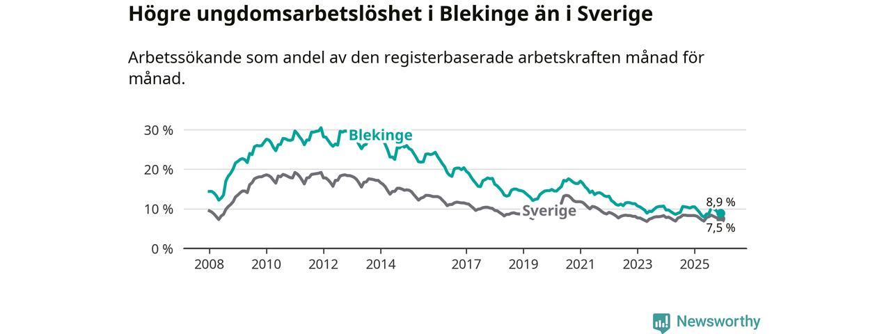 I och med den senaste månadens nedgång har de ungas arbetslöshet i Blekinge sjunkit tio månader i följd (ner från 9,8 procent i februari 2025 till 8,9 procent nu).