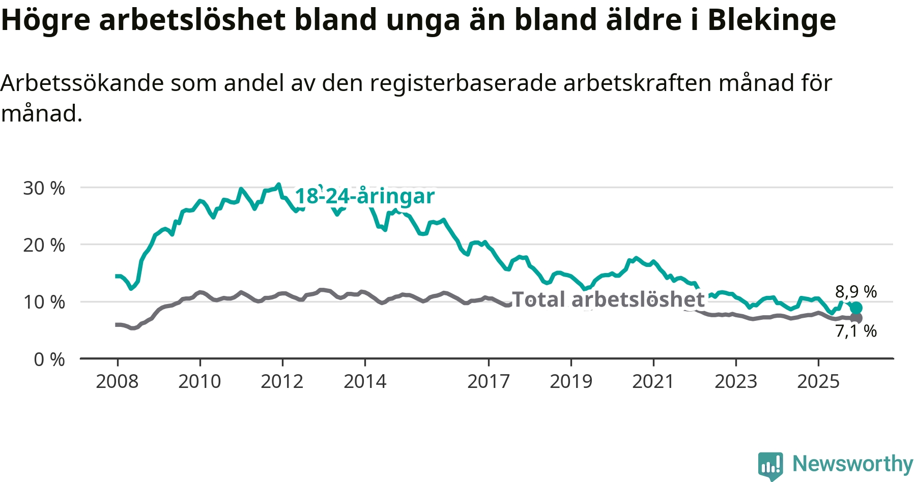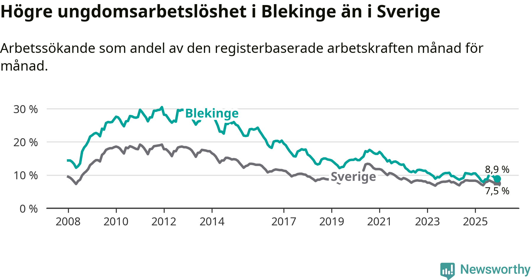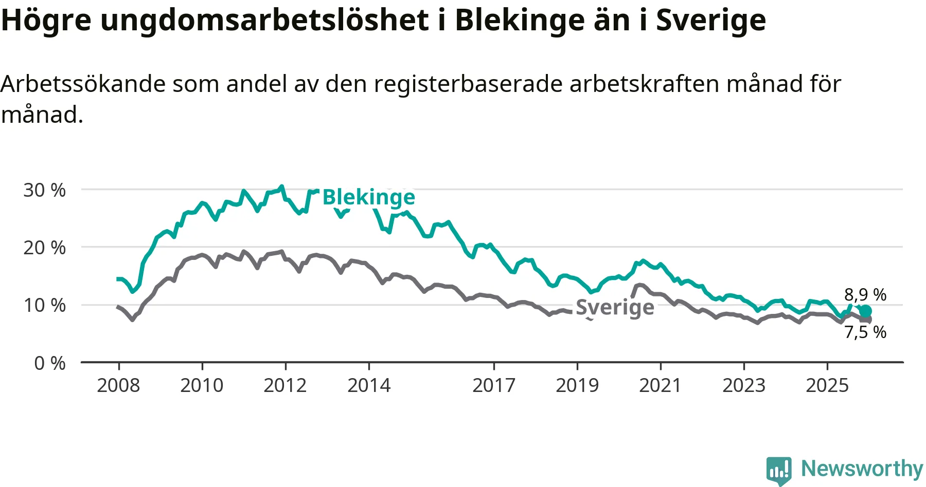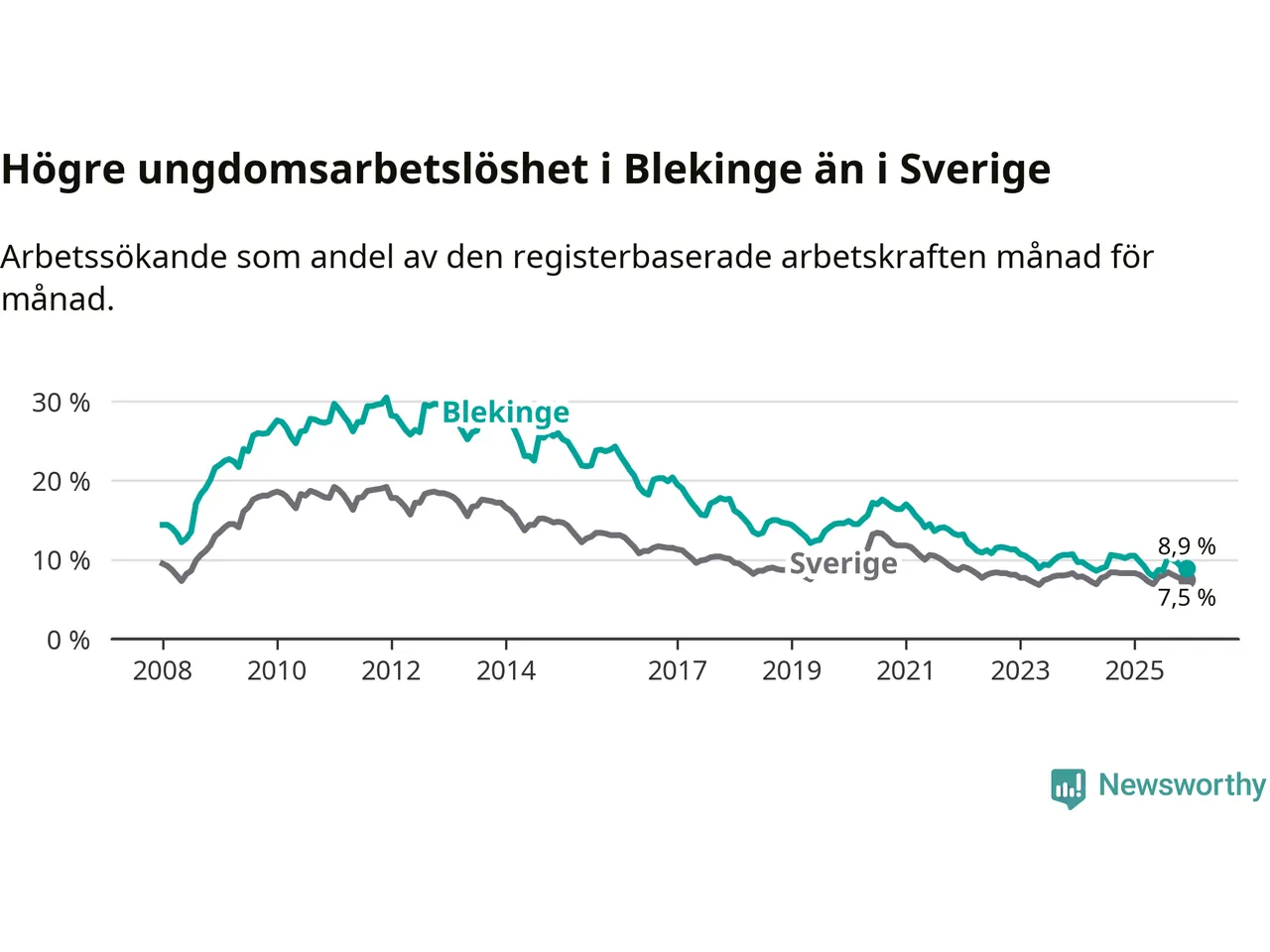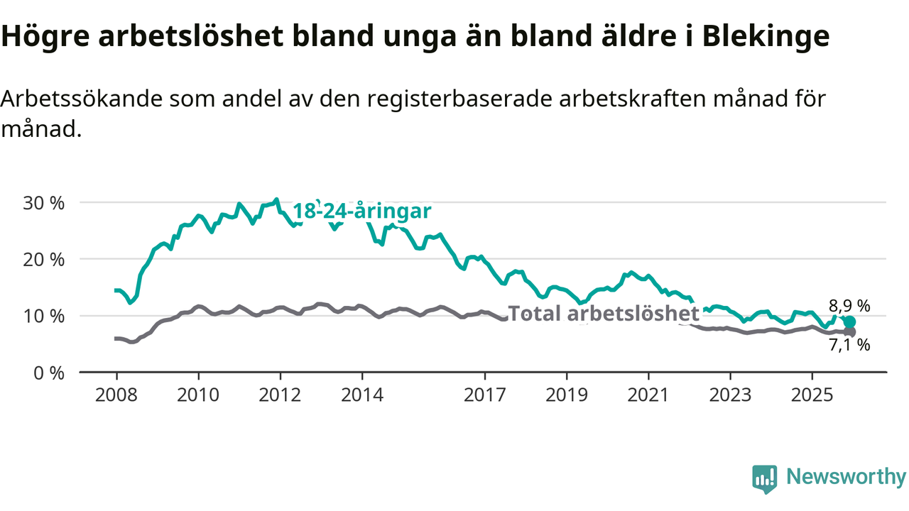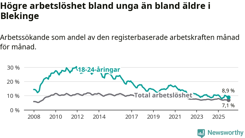 I och med den senaste månadens nedgång har de ungas arbetslöshet i Blekinge sjunkit tio månader i följd (ner från 9,8 procent i februari 2025 till 8,9 procent nu).