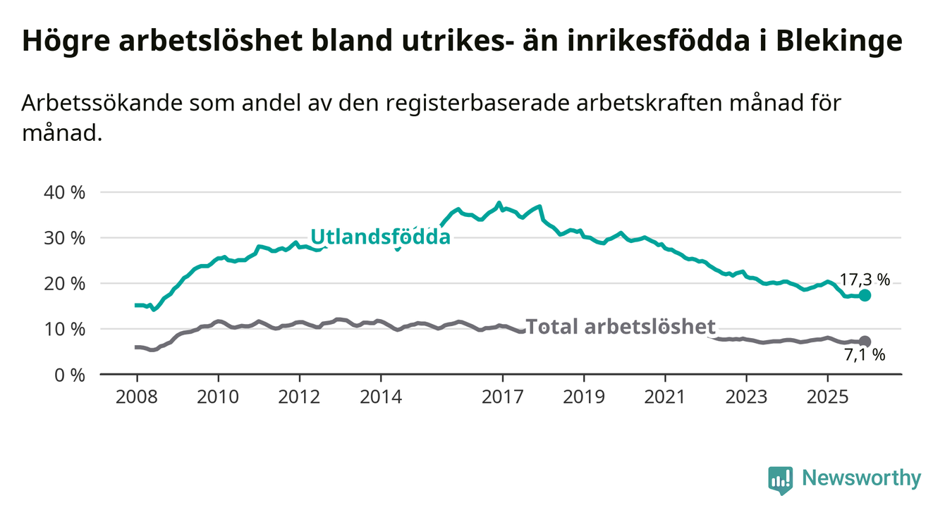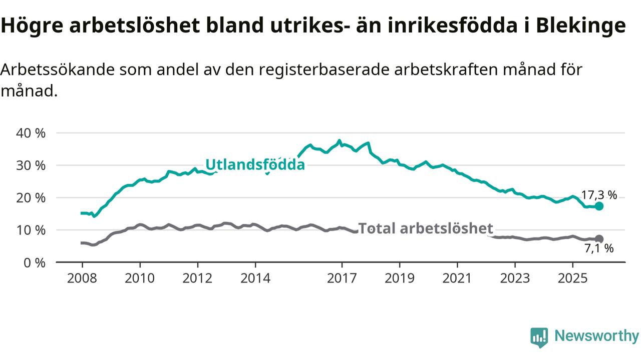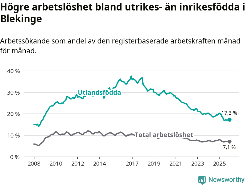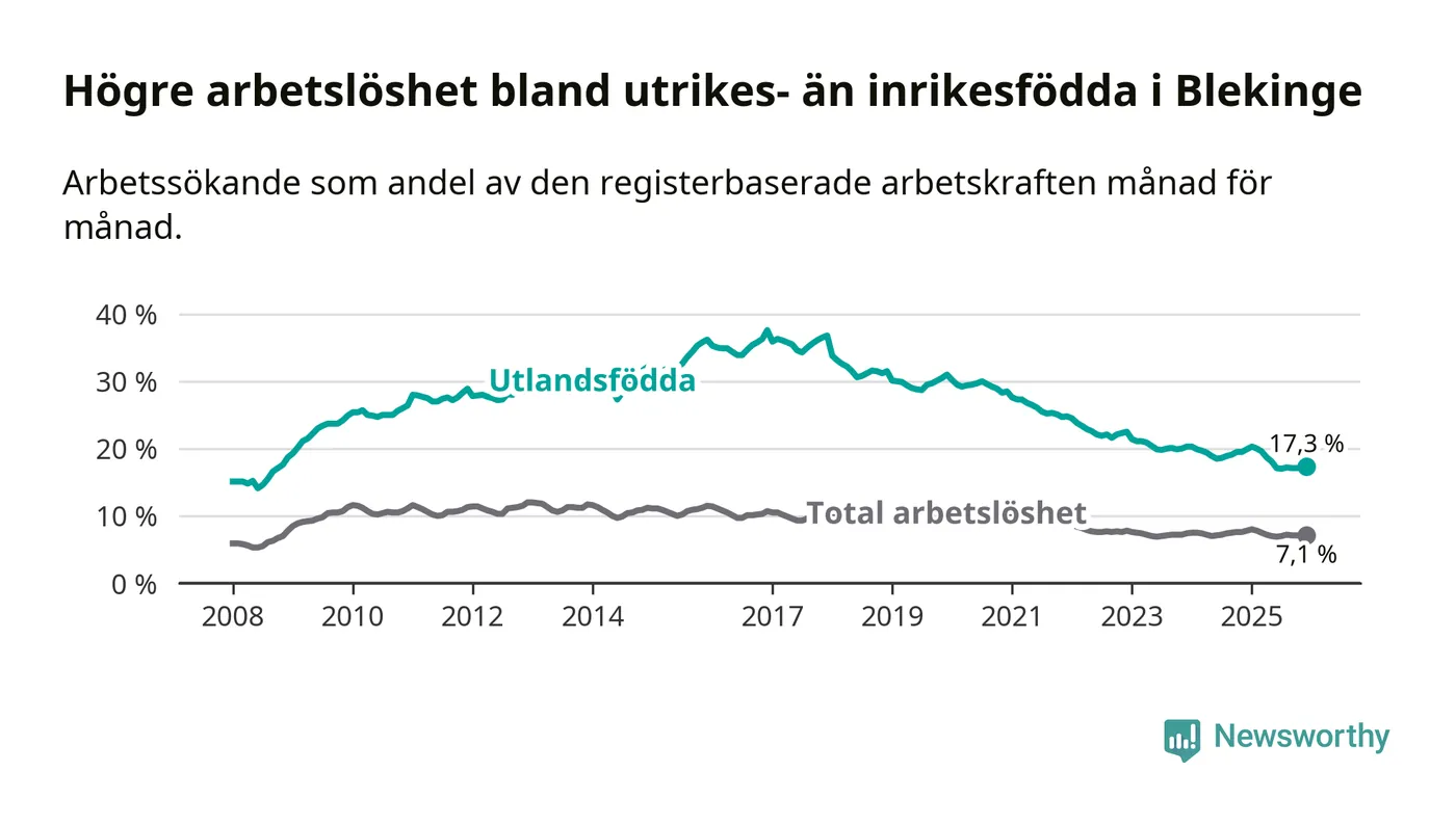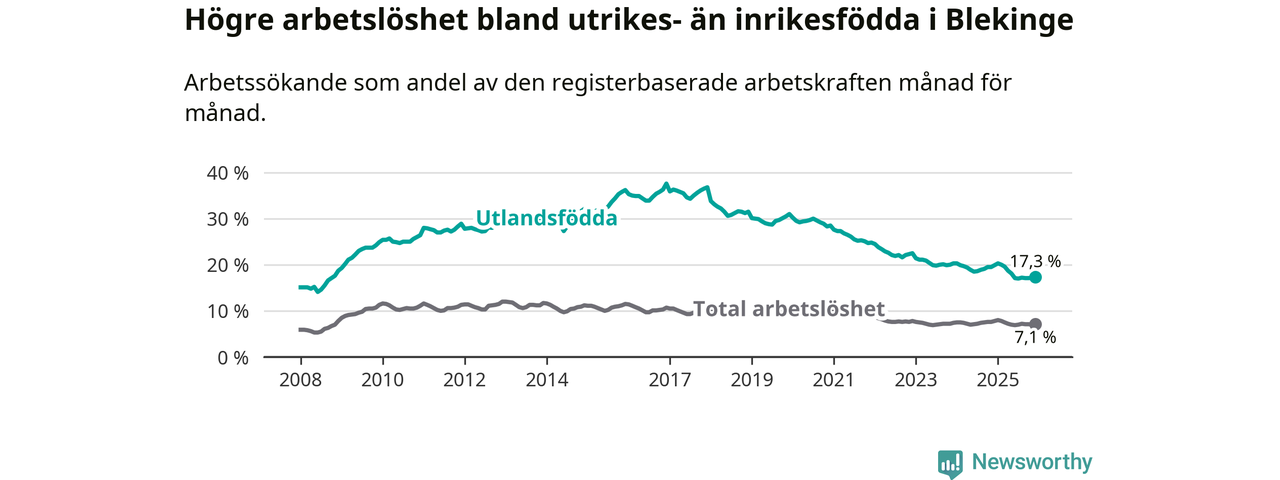 Arbetslösheten bland utlandsfödda var 17,3 procent i Blekinge under december månad, motsvarande 2 303 av 13 312 personer. Det är 2,6 procentenheter färre än vid samma tidpunkt i fjol (−342 om man räknar personer). Därmed är de utlandsföddas arbetslöshet lägre än vid samma tidpunkt i fjol för tionde månaden i följd. Sedan februari 2025 har arbetslösheten bland utlandsfödda minskat från 20,0 till 17,3 procent.