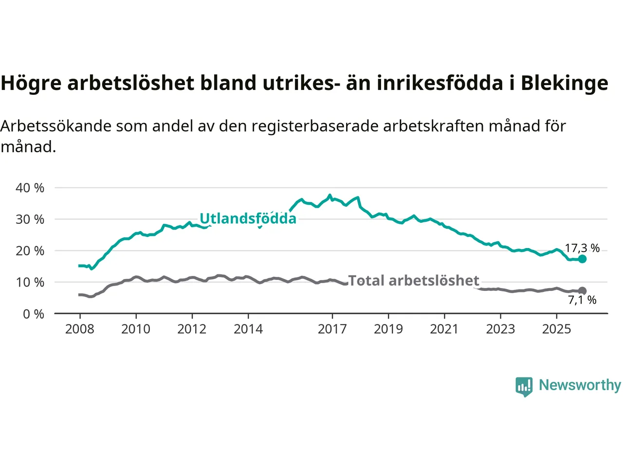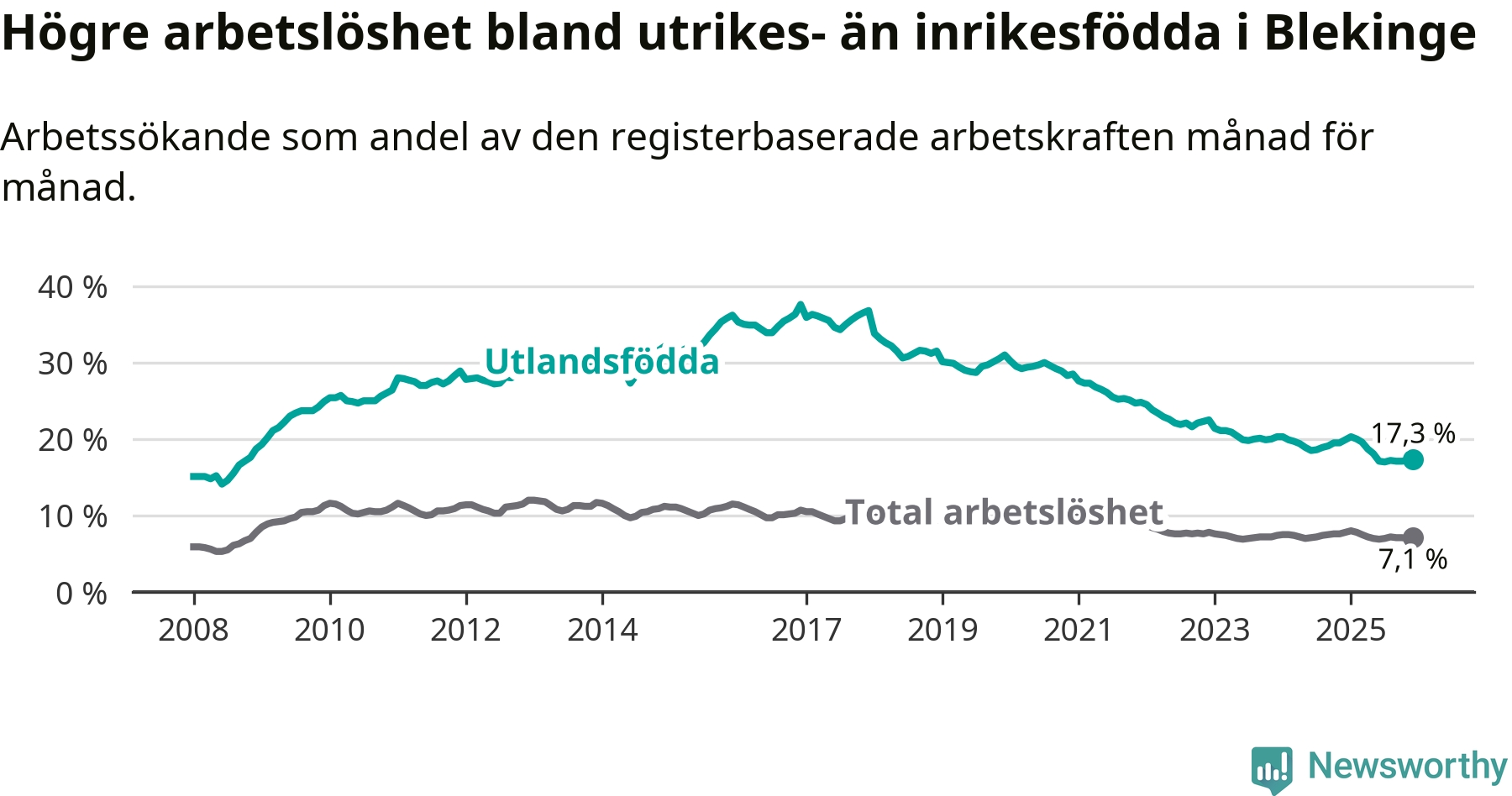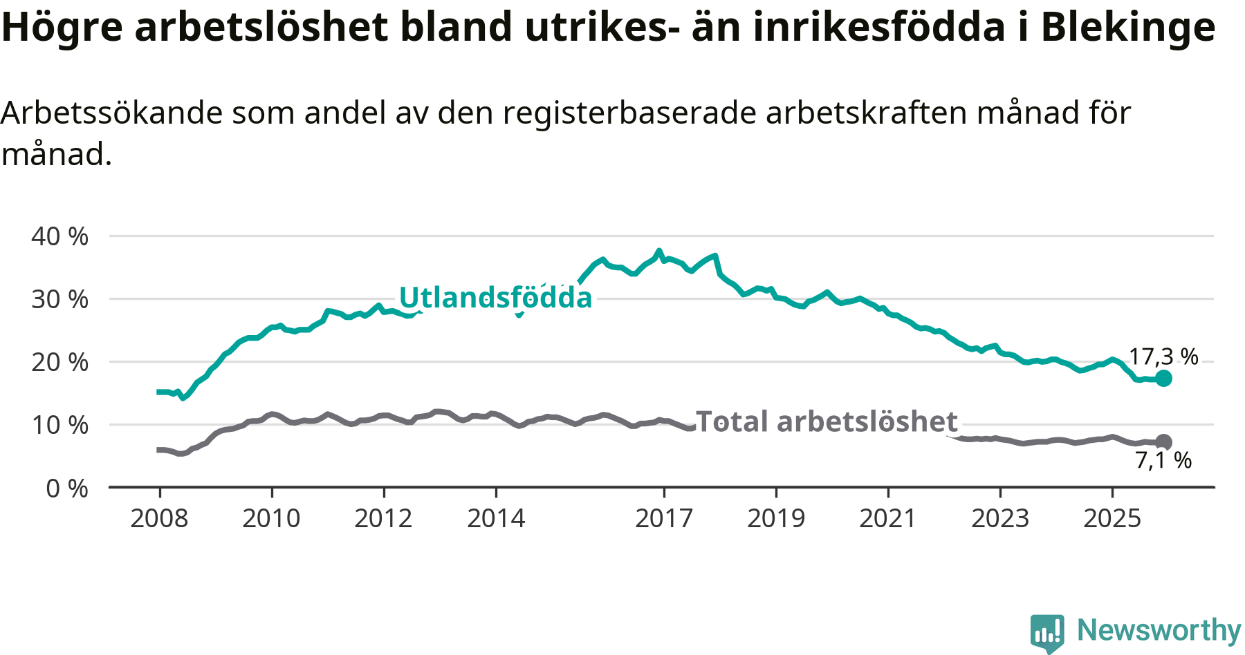 Arbetslösheten bland utlandsfödda var 17,3 procent i Blekinge under december månad, motsvarande 2 303 av 13 312 personer. Det är 2,6 procentenheter färre än vid samma tidpunkt i fjol (−342 om man räknar personer). Därmed är de utlandsföddas arbetslöshet lägre än vid samma tidpunkt i fjol för tionde månaden i följd. Sedan februari 2025 har arbetslösheten bland utlandsfödda minskat från 20,0 till 17,3 procent.