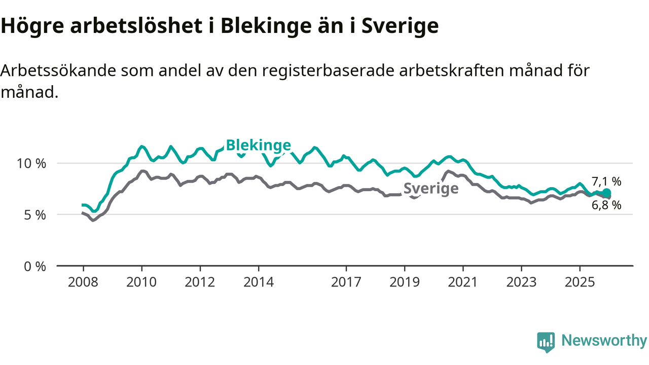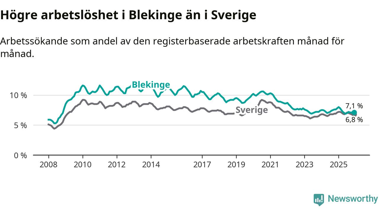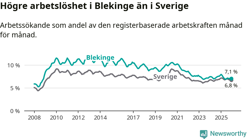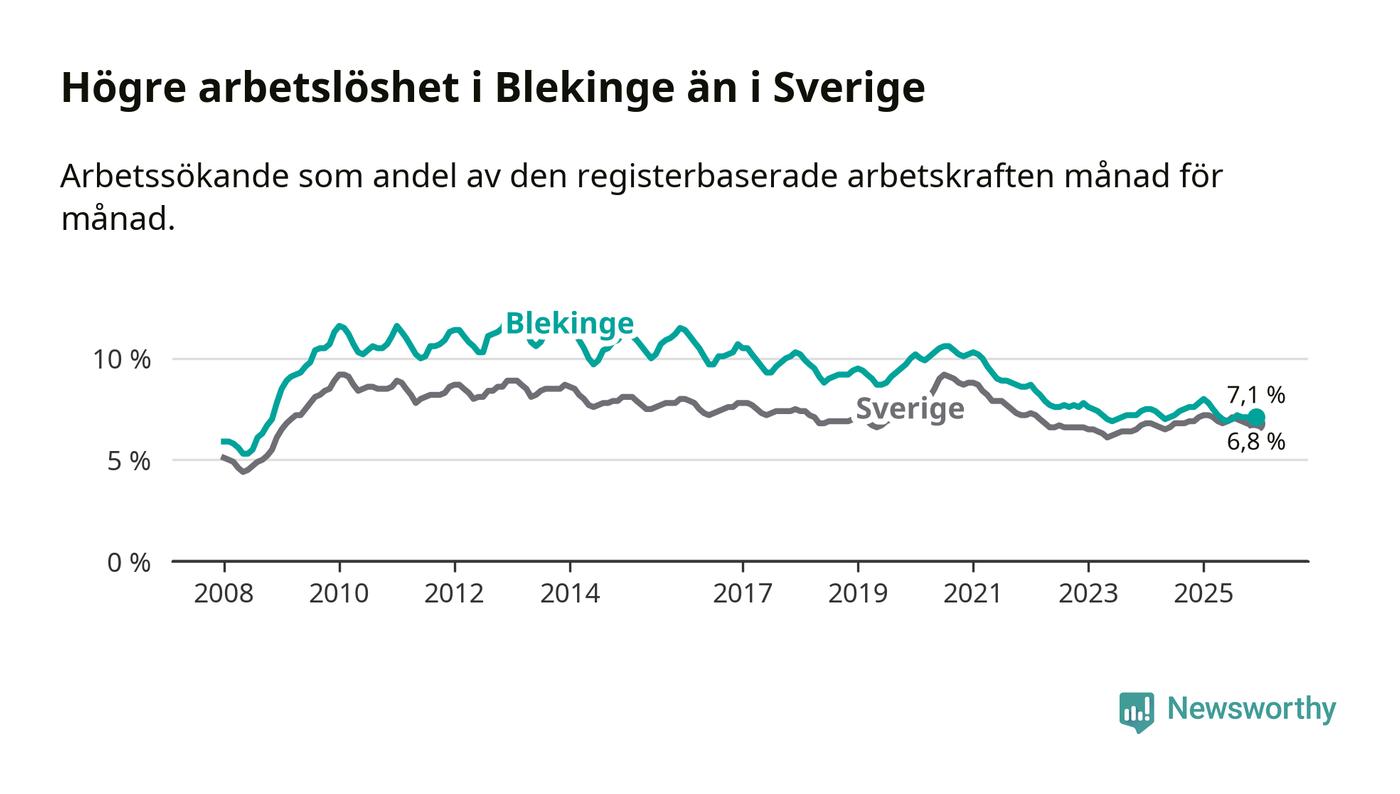 Även om arbetslösheten i Blekinge alltså minskar, så ligger den fortfarande över snittet i hela Sverige (7,1 procent i länet, jämfört med 6,8 procent i hela riket). Norrbotten har den lägsta arbetslösheten i riket (3,8 procent), medan Skåne har den högsta (8,9 procent). För att Blekinge skulle komma ner i samma arbetslöshetsnivå som Norrbotten skulle 2 501 personer behöva sysselsättas.