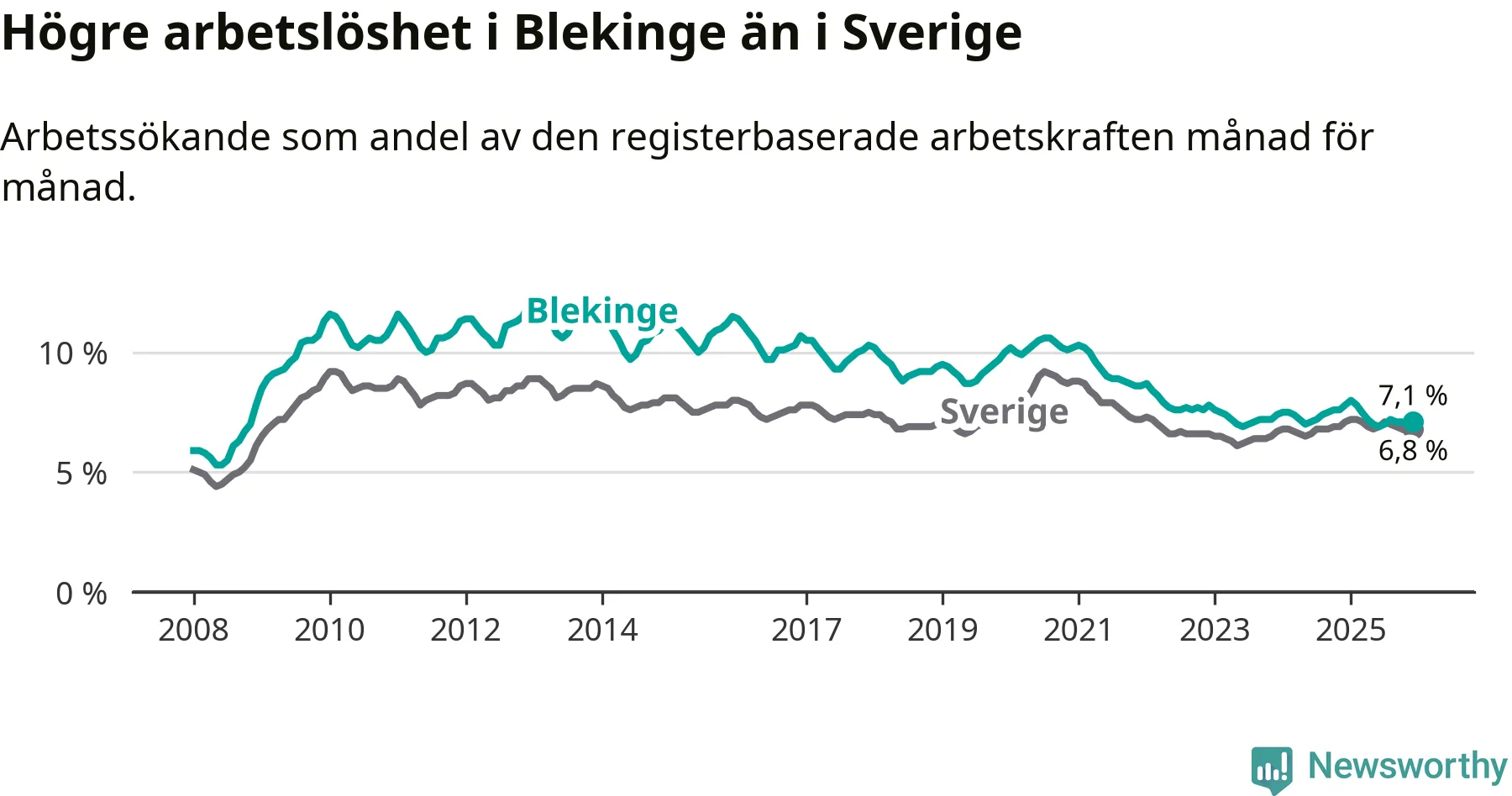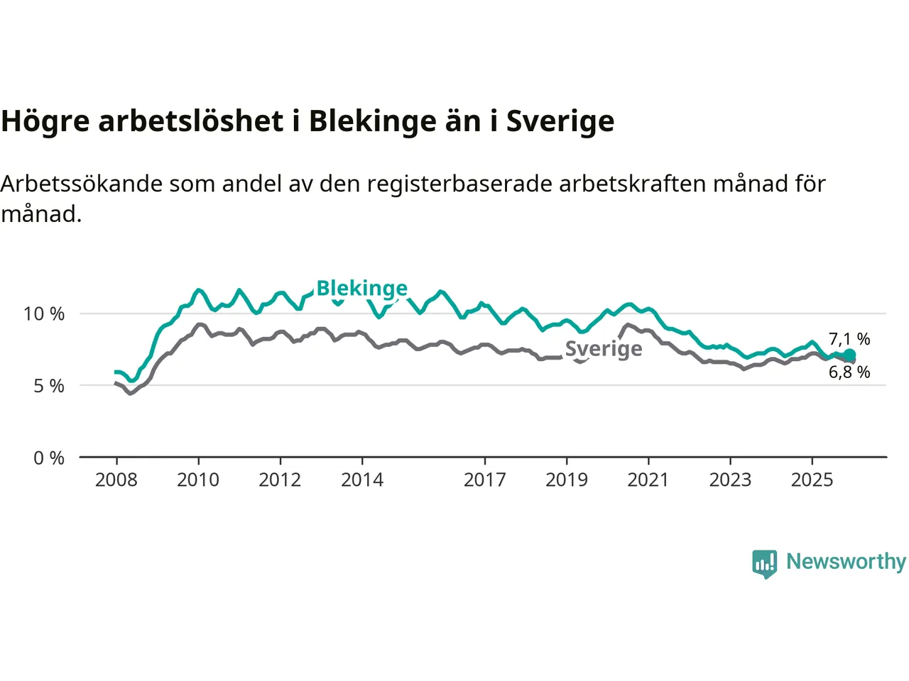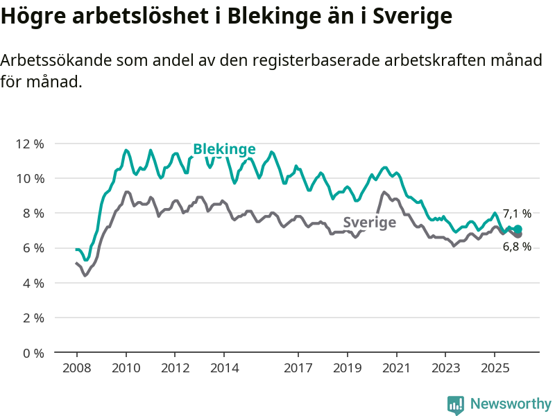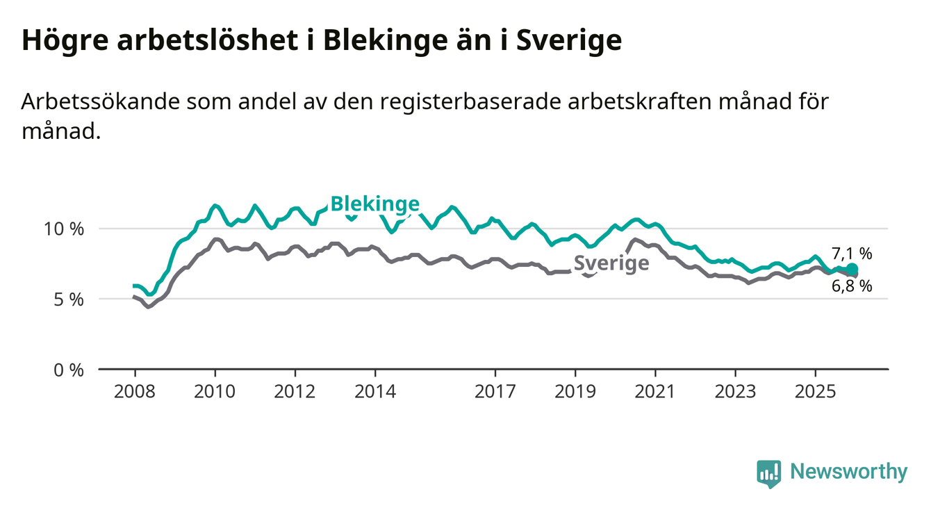 Även om arbetslösheten i Blekinge alltså minskar, så ligger den fortfarande över snittet i hela Sverige (7,1 procent i länet, jämfört med 6,8 procent i hela riket). Norrbotten har den lägsta arbetslösheten i riket (3,8 procent), medan Skåne har den högsta (8,9 procent). För att Blekinge skulle komma ner i samma arbetslöshetsnivå som Norrbotten skulle 2 501 personer behöva sysselsättas.