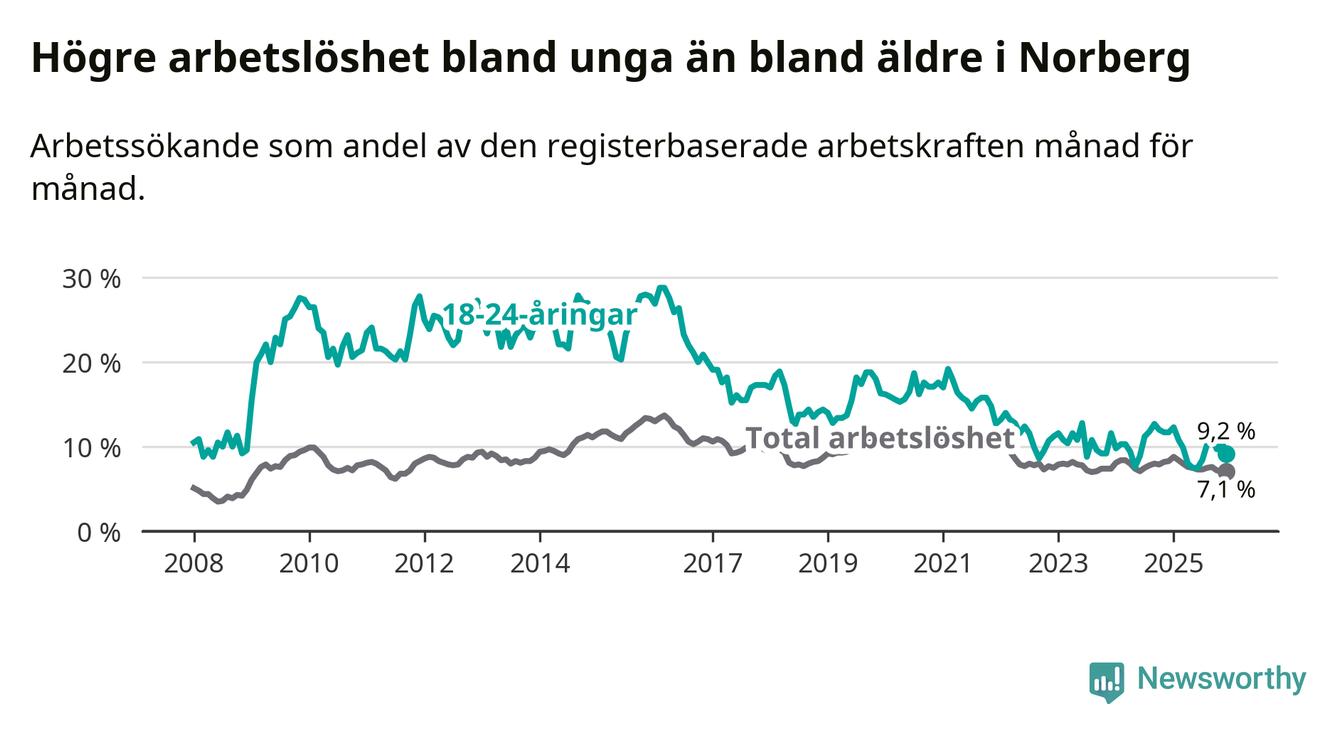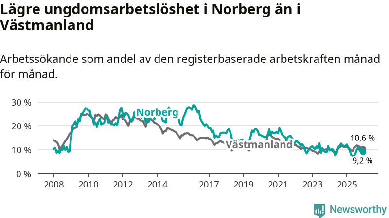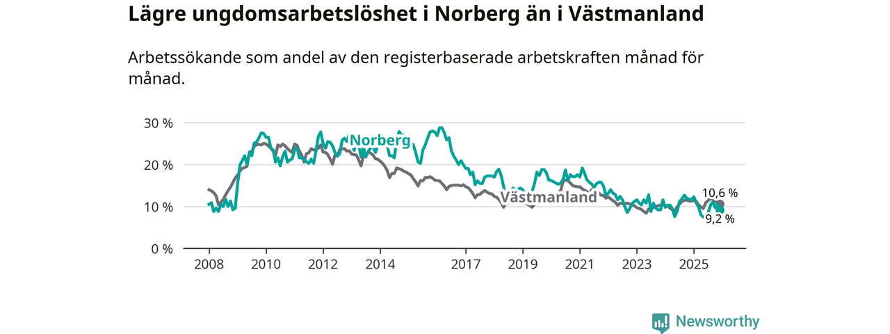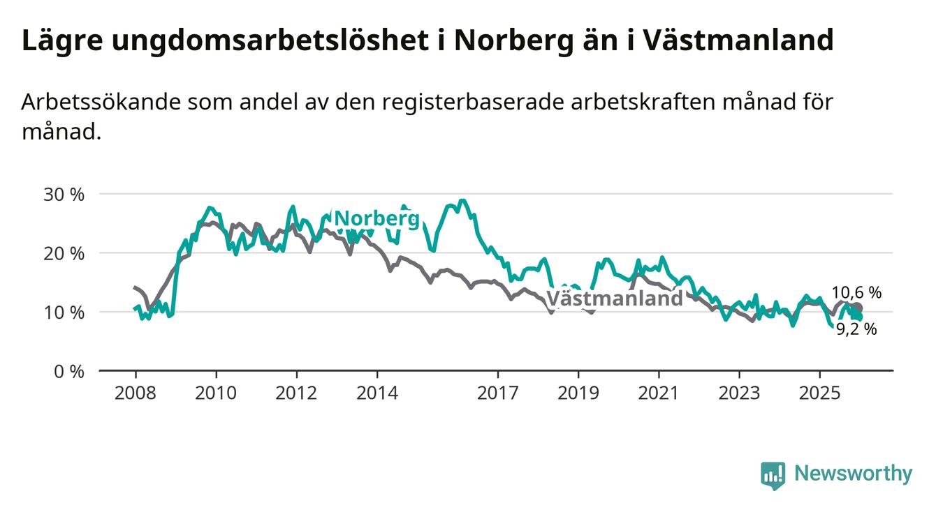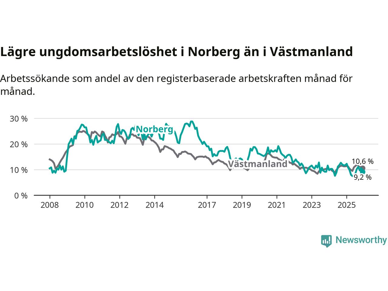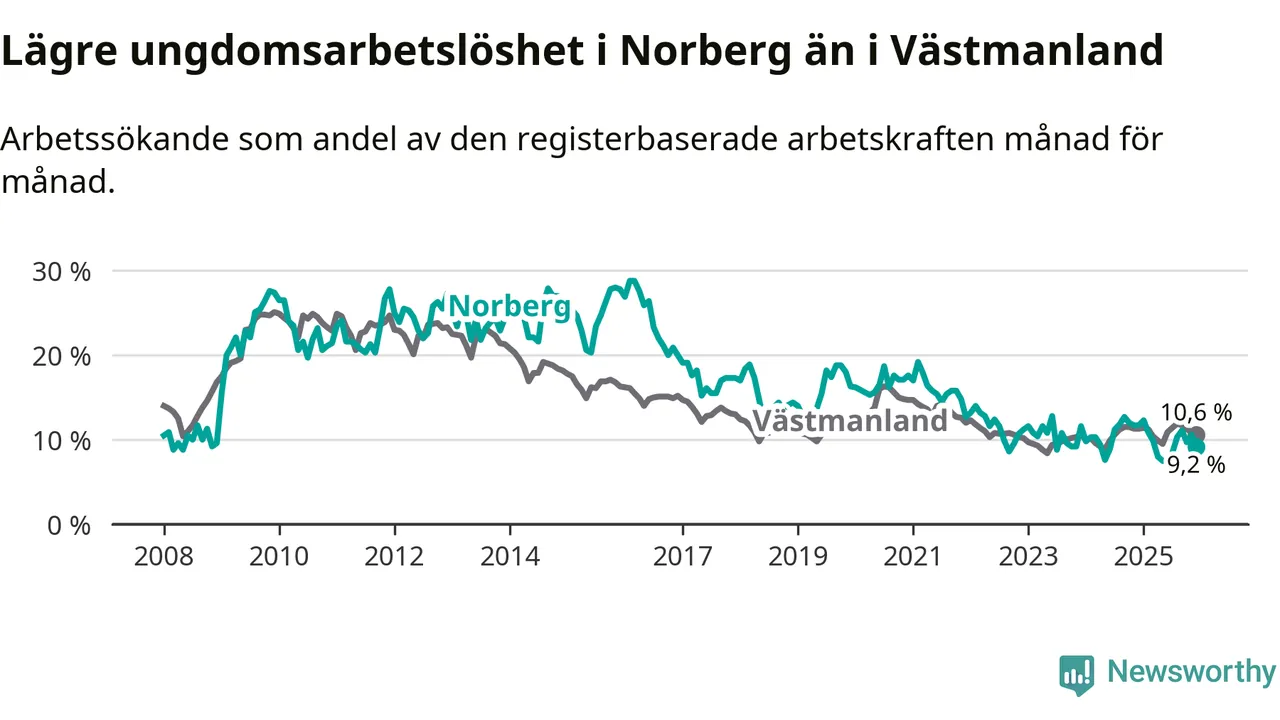 I och med den senaste månadens nedgång har de ungas arbetslöshet i Norberg sjunkit tio månader i följd (ner från 10,8 procent i februari 2025 till 9,2 procent nu).