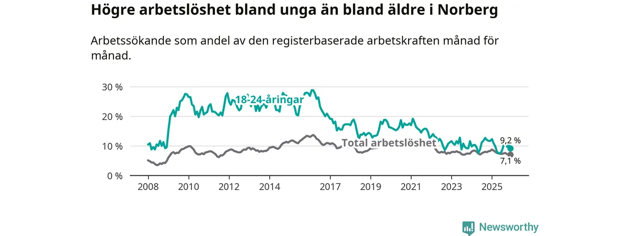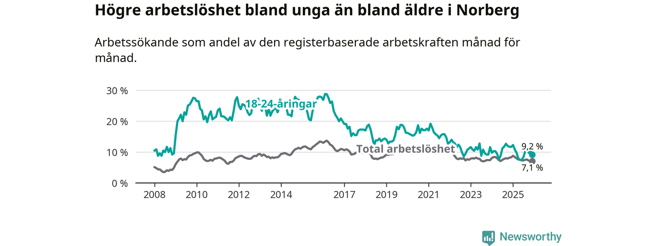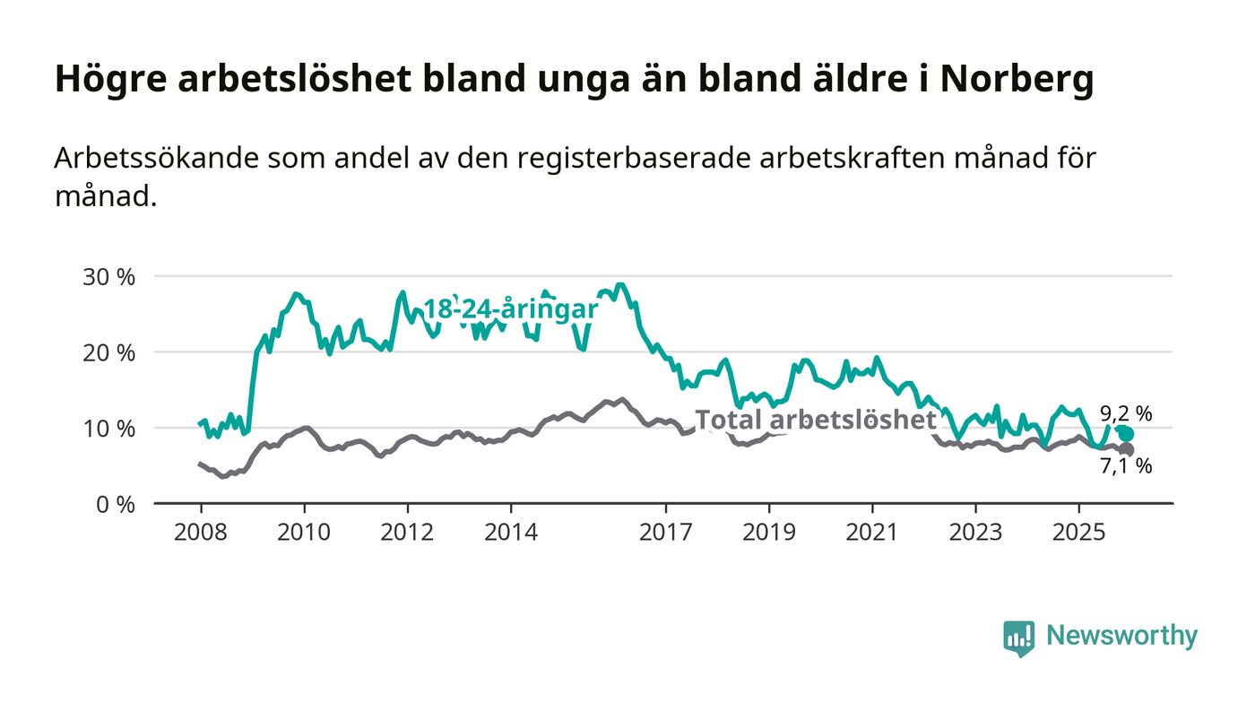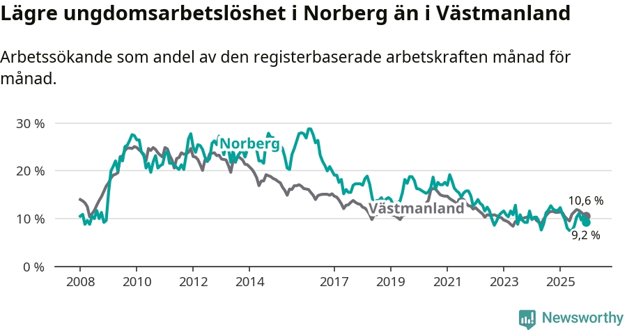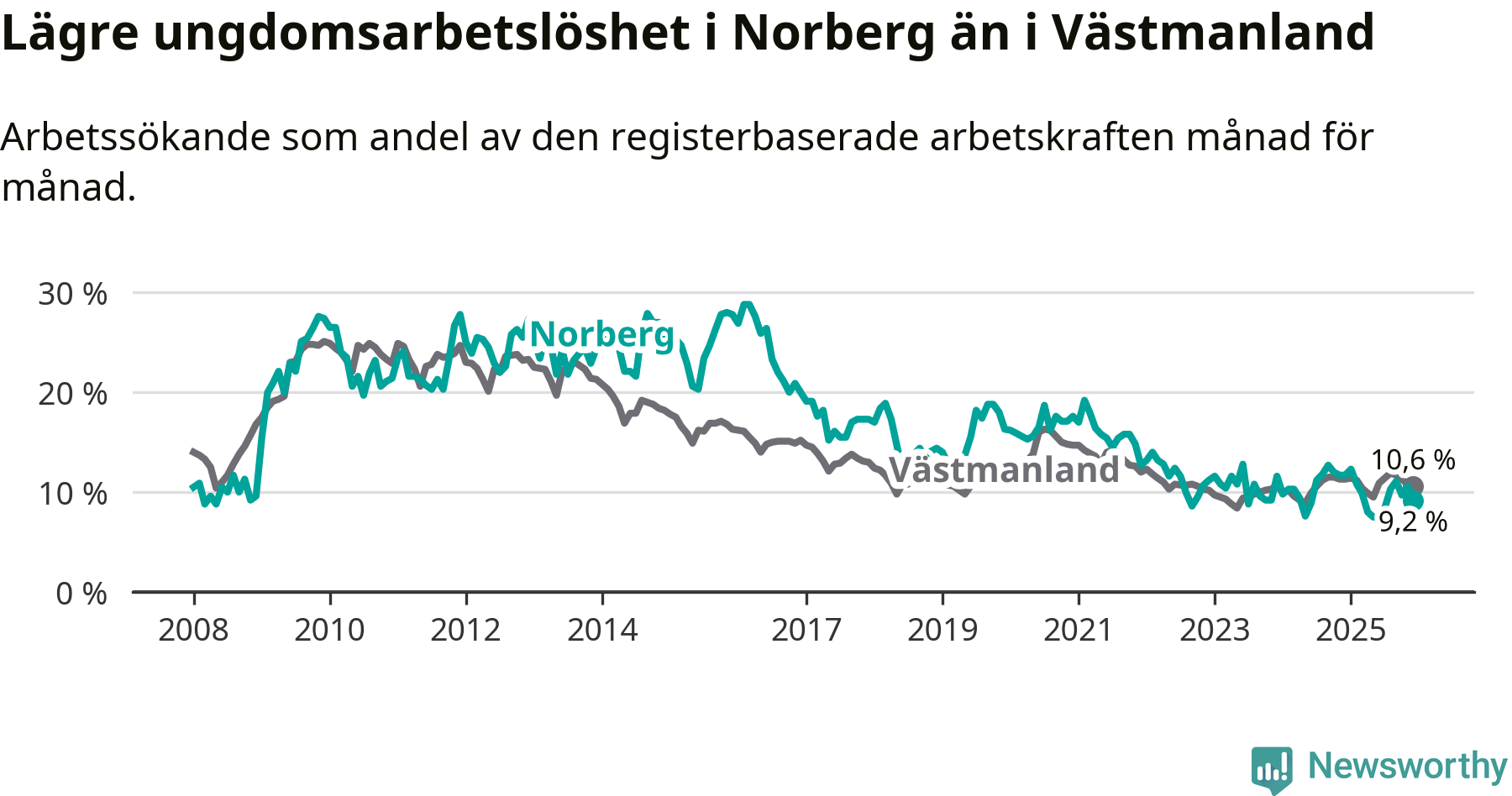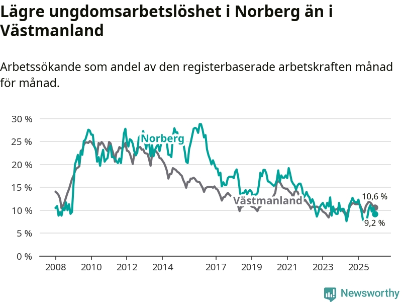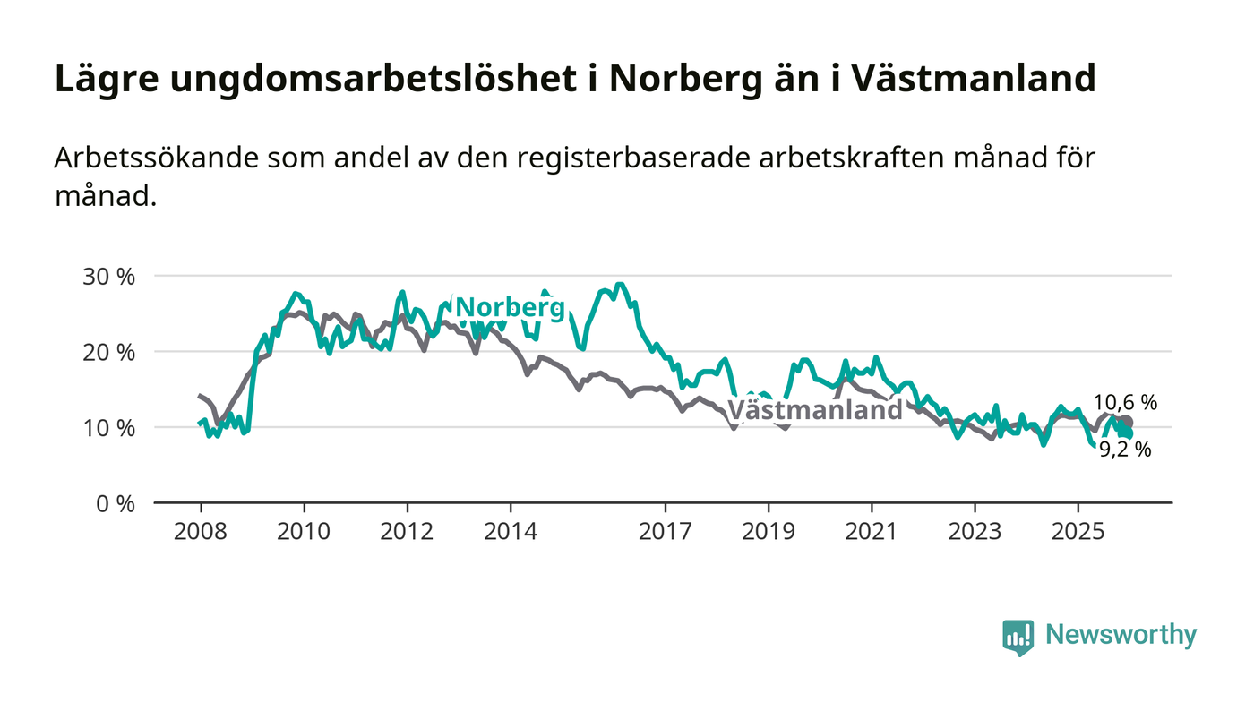 I och med den senaste månadens nedgång har de ungas arbetslöshet i Norberg sjunkit tio månader i följd (ner från 10,8 procent i februari 2025 till 9,2 procent nu).