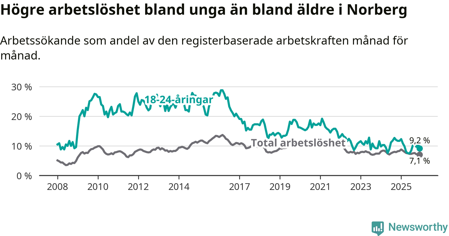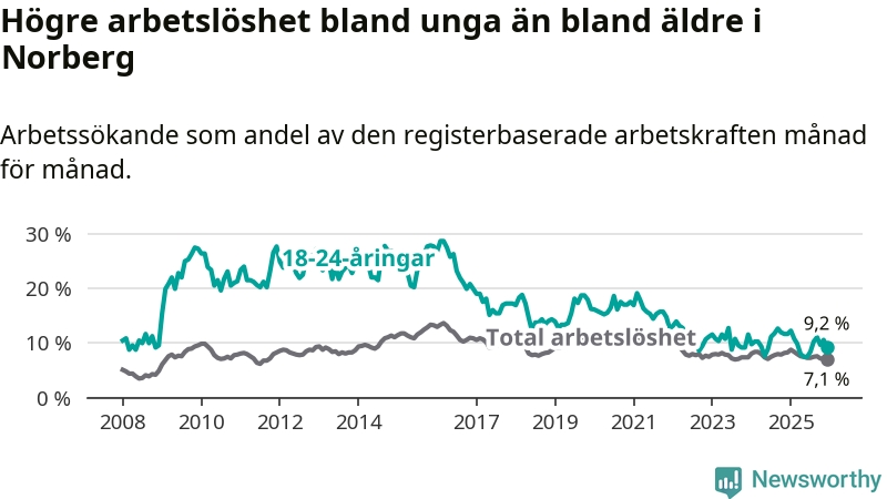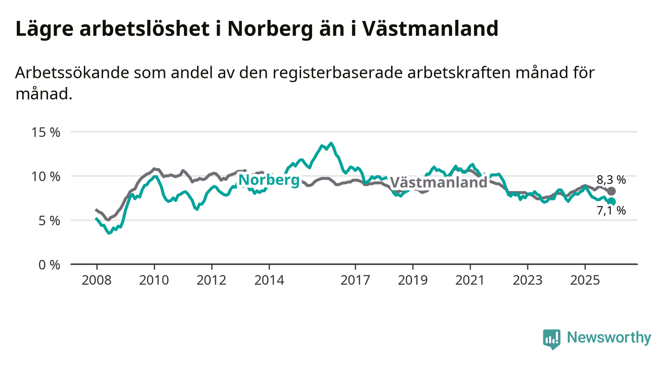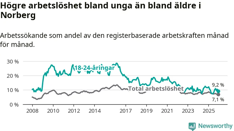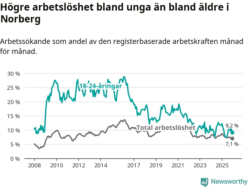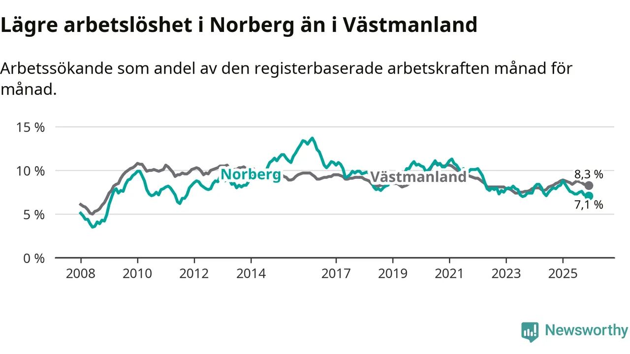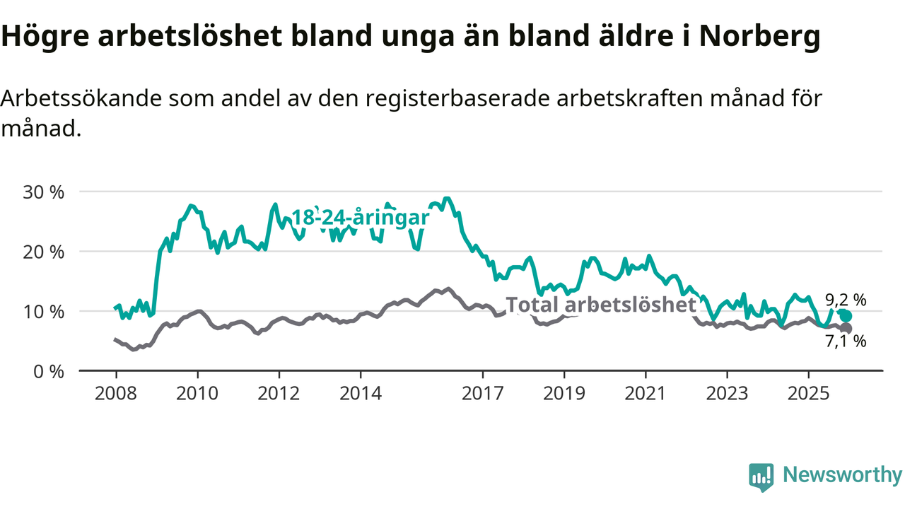 I och med den senaste månadens nedgång har de ungas arbetslöshet i Norberg sjunkit tio månader i följd (ner från 10,8 procent i februari 2025 till 9,2 procent nu).