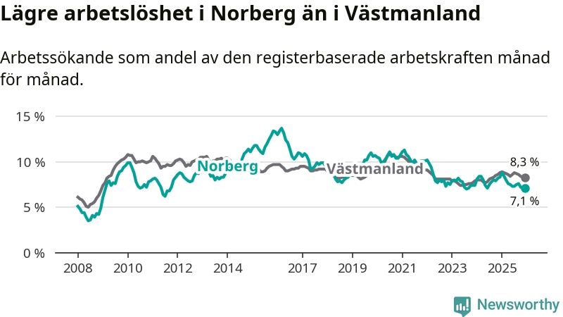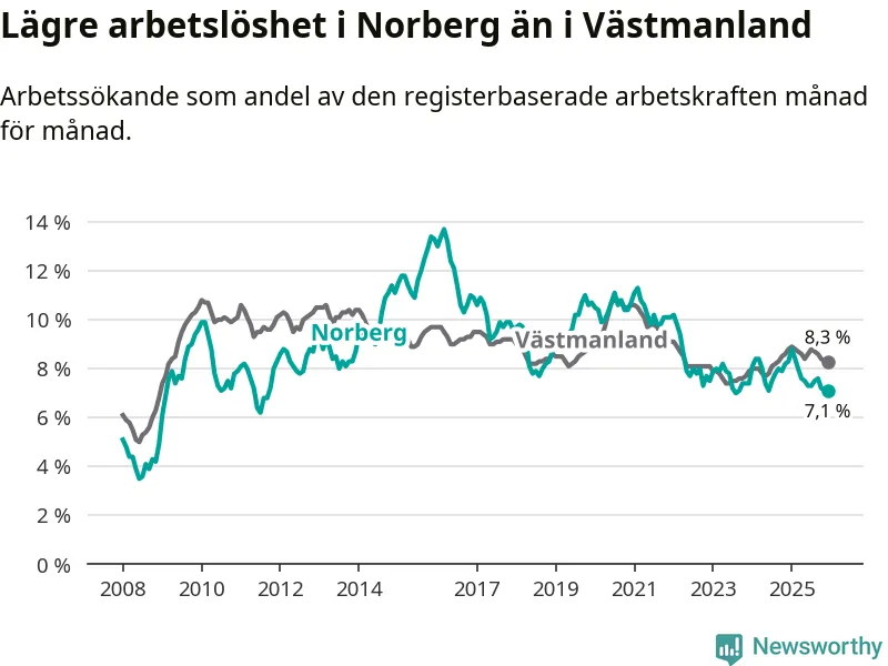 Under december månad rapporterade Norbergs kommun en total arbetslöshet på 7,1 procent. Det är en minskning jämfört med samma tidpunkt i fjol (−1,2 procentenheter). Även i Västmanlands län sjunker arbetslösheten .